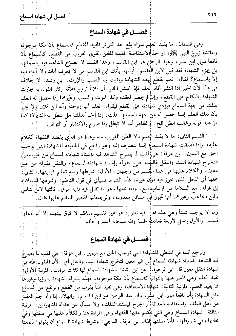 وَهِي قِسْمَانِ: مَا يُفِيد الْعلم سَوَاء بلغ حد التَّوَاتُر الْمُفِيد للْقطع كالسماع بِأَن مَكَّة مَوْجُودَة وَعَائِشَة زوج النَّبِي صلى الله عَلَيْهِ وَسلم، أَو حدّ الاستفاضة المفيدة للظن الْقوي الْقَرِيب من الْقطع، كالسماع بِأَن نَافِعًا مولى ابْن عمر، وَعبد الرَّحْمَن هُوَ ابْن الْقَاسِم، وَهَذَا الْقسم لَا يُصَرح الشَّاهِد فِيهِ بِالسَّمَاعِ، بل يجْزم الشَّهَادَة فقد قيل لِابْنِ الْقَاسِم: أيشهد بأنك ابْن الْقَاسِم من لَا يعرف أَبَاك وَلَا أَنَّك ابْنه إِلَّا بِالسَّمَاعِ؟ فَقَالَ: نعم يقطع بِهَذِهِ الشَّهَادَة وَيثبت بهَا النّسَب وَالْإِرْث. ابْن رشد: لَا خلاف فِي هَذَا لِأَن الْخَبَر إِذا انْتَشَر أَفَادَ الْعلم فَإِذا انْتَشَر الْخَبَر بِأَن فلَانا تزوج فُلَانَة وَكثر القَوْل بِهِ جَازَت الشَّهَادَة بِالنِّكَاحِ على الْقطع، وَإِن لم يحضر لعقده وَكَذَا الْمَوْت وَالنّسب وَغَيرهمَا إِذا حصل لَهُ الْعلم بذلك من جِهَة السماع فَيُؤَدِّي شَهَادَته على الْقطع فَيَقُول: نعلم أَنَّهَا زَوجته وَأَنه ابْن فلَان وَلَا يخبر بِأَن ذَلِك الْعلم إِنَّمَا حصل لَهُ من جِهَة السماع. قلت: إِذا أخبر بذلك هَل تبطل بِهِ الشَّهَادَة كَمَا مرّ عِنْد قَوْله وغالب الظَّن الخ. وَالظَّاهِر أَنَّهَا لَا تبطل إِذا صرح بالانتشار أَو التَّوَاتُر. الْقسم الثَّانِي: مَا لَا يُفِيد الْعلم وَلَا الظَّن الْقَرِيب مِنْهُ وَهَذَا هُوَ الَّذِي يقْصد الْفُقَهَاء الْكَلَام عَلَيْهِ، وَإِذا أطلقت شَهَادَة السماع إِنَّمَا تَنْصَرِف إِلَيْهِ وَهُوَ رَاجع فِي الْحَقِيقَة للشَّهَادَة الَّتِي توجب الْحق مَعَ الْيَمين. ابْن عَرَفَة: هِيَ لقب لما يُصَرح الشَّاهِد فِيهِ بِإِسْنَاد شَهَادَته لسَمَاع من غير معِين فَتخرج شَهَادَة الْبَتّ وَالنَّقْل فالبت خرج بقوله بِإِسْنَاد شَهَادَته لسَمَاع، وَالنَّقْل بقوله من غير معِين، وَالْكَلَام عَلَيْهَا فِي هَذَا الْقسم من وَجْهَيْن. الأول: شَرطهَا وَمِنْه تعلم كيفيتها. الثَّانِي: محلهَا أَي الْمحل الَّذِي تجوز فِيهِ دون غَيره، فَأَما الشَّرْط فَسَيَأْتِي فِي قَول النَّاظِم: وَشَرطهَا استفاضة إِلَى قَوْله: مَعَ السَّلامَة من ارتياب الخ. وَأما محلهَا وَهُوَ مَا تقبل فِيهِ فَفِيهِ طرق. ثَالِثهَا لِابْنِ شَاس وَابْن الْحَاجِب وَغَيرهمَا أَنَّهَا تجوز فِي مسَائِل مَعْدُودَة، ولرجحانها اقْتصر النَّاظِم عَلَيْهَا فَقَالَ: