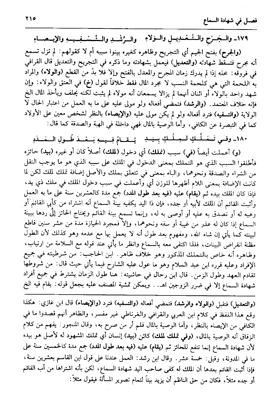 والجَرْحِ والتَّعْدِيلِ والوَلاءِ والرُّشْدِ والتَّسْفِيهِ والإيصاءِ (وَالْجرْح) بِفَتْح الْجِيم أَي التجريح وَظَاهره كَغَيْرِهِ بينوا سَببه أم لَا كَقَوْلِهِم: لم تزل تسمع أَنه مجرح فَتسقط شَهَادَته (وَالتَّعْدِيل) فَيعْمل بِشَهَادَتِهِ وَمَا ذكره فِي التجريح وَالتَّعْدِيل قَالَ الْقَرَافِيّ فِي فروقه: مَحَله إِذا لم يدْرك زمَان المجرح والمعدل بِالْفَتْح وَإِلَّا فَلَا بدّ من الْقطع (وَالْوَلَاء) وَالْمرَاد بِهِ اللحمة الَّتِي هِيَ كلحمة النّسَب لَا مُجَرّد المَال فَقَط خلافًا لقَوْل (خَ) فِي الْعتْق وَالْوَلَاء: وَإِن شهد وَاحِد بِالْوَلَاءِ أَو اثْنَان أَنَّهُمَا لم يَزَالَا يسمعان أَنه مَوْلَاهُ لم يثبت لكنه يحلف وَيَأْخُذ المَال الخ فَإِنَّهُ خلاف الْمُعْتَمد. (والرشد) فتمضي أَفعاله وَلَو مولى عَلَيْهِ على مَا بِهِ الْعَمَل من اعْتِبَار الْحَال لَا الْولَايَة (والتسفيه) فَترد أَفعاله وَلَو لم يكن مولى عَلَيْهِ (والإيصاء) بِالنّظرِ لشخص معِين على الْأَوْلَاد كَمَا فِي التَّبْصِرَة عَن الْكَافِي، وَأما الْوَصِيَّة بِالْمَالِ فَهِيَ دَاخِلَة فِي الْهِبَة وَالصَّدَََقَة كَمَا قَالَ: وَفِي تَمَلُّكٍ لمِلْكٍ بِيَدِ يُقامُ فِيهِ بَعْدَ طُولِ المَدَدِ (و) أعملت أَيْضا (فِي) سَبَب (تملك) أَي دُخُول (لملك) أصلا كَانَ أَو غَيره (بيد) حائزه فأطلقوا السَّبَب الَّذِي هُوَ التَّمَلُّك بِمَعْنى الدُّخُول فِي الْملك على سَببه الَّذِي هُوَ مَا يُوجب النَّقْل من الشِّرَاء وَالصَّدَََقَة وَنَحْوهمَا، وَالْبَاء بِمَعْنى فِي تتَعَلَّق بِملك وَالْأَصْل إِضَافَة تملك لملك لَكِن لما كَانَت الْإِضَافَة بِمَعْنى اللَّام أظهرها للوزن أَي وأعملت فِي سَبَب دُخُول الْملك فِي ملك ذِي يَد، فَإِذا كَانَ الْملك بِيَدِهِ ثمَّ (يُقَام) عَلَيْهِ (فِيهِ بعد طول المدد) جمع مُدَّة كالعشرين سنة على مَا بِهِ الْعَمَل وَأثبت الْقَائِم أَن الْملك لِأَبِيهِ أَو جده، فَإِن ذَا الْيَد يَكْفِيهِ بَيِّنَة السماع أَنه اشْتَرَاهُ من كَأبي الْقَائِم أَو وهبه لَهُ أَو تصدق بِهِ عَلَيْهِ أَو أوصى بِهِ لَهُ، وَإِنَّمَا تسمع بَيِّنَة الْقَائِم وَيحْتَاج الْحَائِز إِلَى ردهَا بِبَيِّنَة السماع إِذا كَانَ لَهُ عذر من غيبَة أَو سفه وَنَحْوهمَا، وإلاَّ فمجرد الْحِيَازَة مُدَّة من عشر سِنِين قَاطع لبينته كَمَا يَأْتِي إِن شَاءَ الله، وَمَفْهُوم بعد طول أَنه لَا يعْمل بهَا مَعَ عَدمه وَهُوَ كَذَلِك لِأَن الطول مَظَنَّة انْقِرَاض الْبَينَات، فَلِذَا اكْتفى مَعَه بِالسَّمَاعِ وَانْظُر مَا يَأْتِي عِنْد قَوْله مَعَ السَّلامَة من ارتياب، وَظَاهره أَنه خَاص بالتملك الْمَذْكُور وَهُوَ خلاف ظَاهر. ابْن الْحَاجِب: من شرطيته فِي جَمِيع الْإِفْرَاد وَعَلِيهِ قَرَّرَهُ ابْن عبد السَّلَام وَهُوَ مَا عول عَلَيْهِ الشَّارِح فِيمَا يَأْتِي حَيْثُ قَالَ: من شُرُوطهَا تقادم الْعَهْد وَطول الزَّمن. قَالَ ابْن رحال فِي حَاشِيَته: هُنَا طول الزَّمَان يشْتَرط فِي جَمِيع أَفْرَاد شَهَادَة السماع إِلَّا فِي ضَرَر الزَّوْجَيْنِ اه. . وَيُمكن تمشية المُصَنّف عَلَيْهِ بِجعْل قَوْله: يُقَام فِيهِ الخ
