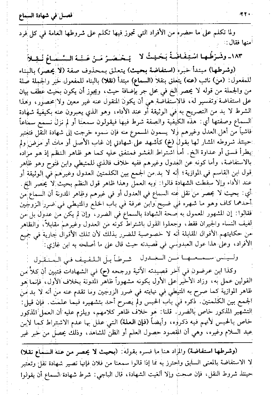 وَلما تكلم على مَا حَضَره من الْأَفْرَاد الَّتِي تجوز فِيهَا تكلم على شُرُوطهَا الْعَامَّة فِي كل فَرد مِنْهَا فَقَالَ: وشَرْطُها اسْتِفَاضَةٌ بَحَيْثُ لَا يُحْصَرُ مَنْ عَنْهُ السَّماعُ نُقِلاَ (وَشَرطهَا) مُبْتَدأ خَبره (استفاضة بِحَيْثُ) يتَعَلَّق بِمَحْذُوف صفة (لَا يحصر) بِالْبِنَاءِ للْمَفْعُول: (من) نَائِب (عَنهُ) يتَعَلَّق بنقلا (السماع) مُبْتَدأ (نقلا) بِالْبِنَاءِ للْمَفْعُول خبر وَالْجُمْلَة صلَة من وَالْجُمْلَة من قَوْله لَا يحصر الخ فِي مَحل جر بِإِضَافَة حَيْثُ، وَيجوز أَن يكون بِحَيْثُ عطف بَيَان على استفاضة وَتَفْسِير لَهُ، فالاستفاضة هِيَ أَن يكون الْمَنْقُول عَنهُ غير معِين وَلَا مَحْصُور، وَهَذَا الشَّرْط لَا بُد من التَّصْرِيح بِهِ فِي الْوَثِيقَة أَو عِنْد الْأَدَاء، وَهُوَ الَّذِي يعبرون عَنهُ بكيفية شَهَادَة السماع وصفتها أَي: هَذِه الْكَيْفِيَّة وَالصّفة شَرط فِيهَا فَيَقُولُونَ سمعنَا أَو لم نزل نسْمع سَمَاعا فاشياً من أهل الْعدْل وَغَيرهم وَلَا يسمون المسموع مِنْهُ فَإِن سموهُ خرجت إِلَى شَهَادَة النَّقْل فَتعْتَبر حِينَئِذٍ شُرُوطه الْمشَار لَهَا بقول (خَ) كأشهد على شهادتي إِن غَابَ الأَصْل أَو مَاتَ أَو مرض وَلم يطْرَأ فسق أَو عَدَاوَة الخ. أما اشْتِرَاط الفشو فمتفق عَلَيْهِ كَمَا هُوَ ظَاهر النّظم إِذْ هُوَ مُرَاده بالاستفاضة، وَأما كَونه عَن الْعُدُول وَغَيرهم فَفِيهِ خلاف فَالَّذِي للمتيطي وَابْن فتوح وَهُوَ ظَاهر قَول ابْن الْقَاسِم فِي الْمُوازِية؛ أَنه لَا بُد من الْجمع بَين الْكَلِمَتَيْنِ الْعُدُول وَغَيرهم فِي الْوَثِيقَة أَو عِنْد الْأَدَاء وَإِلَّا سَقَطت الشَّهَادَة قَالُوا: وَبِه الْعَمَل وَهَذَا ظَاهر قَول النّظم بِحَيْثُ لَا يحصر الخ. أَي: بِحَيْثُ لَا يحصر من نقل عَنهُ السماع فِي الْعُدُول أَو فِي غَيرهم وَظَاهر الْمُدَوَّنَة أَن السماع من أَحدهمَا كَاف وَهُوَ مَا شهره فِي ضيح وَابْن عَرَفَة فِي بَاب الْخلْع والمتيطي فِي ضَرَر الزَّوْجَيْنِ فَقَالُوا: إِن الْمَشْهُور الْمَعْمُول بِهِ صِحَة الشَّهَادَة بِالسَّمَاعِ فِي الضَّرَر، وَإِن لم يكن من عدُول بل من لفيف النِّسَاء وَالْجِيرَان فَقَط، وَجعلُوا القَوْل بِاشْتِرَاط كَونه من الْعُدُول وَغَيرهم مُقَابلا، وَالظَّاهِر من حكايتهم الْأَقْوَال الْمُقَابلَة أَنه لَا خُصُوصِيَّة للضَّرَر بذلك لِأَن تِلْكَ الْأَقْوَال جَارِيَة فِي جَمِيع الْأَفْرَاد، وعَلى هَذَا عول العبدوسي فِي قصيدته حَيْثُ قَالَ على مَا أصلحه بِهِ ابْن غَازِي: وَلَيْسَ سَمعهَا من الْعُدُول شرطا بل اللفيف فِي الْمَنْقُول وَكَذَا ابْن عرضون فِي آخر قصيدته الْآتِيَة وَرجحه (ح) فِي الشَّهَادَات فَتبين أَن كلاًّ من الْقَوْلَيْنِ عمل بِهِ، وَزَاد الْأَخير على الأول بِكَوْنِهِ مَشْهُورا ظَاهر الْمُدَوَّنَة بِخِلَاف الأول، فَإِنَّمَا هُوَ ظَاهر الْمُوازِية كَمَا صرح بِهِ المتيطي فِي نهايته فِي ضَرَر الزَّوْجَيْنِ وَمَا تقدم عَنهُ من أَنه لَا بُد من الْجمع بَين الْكَلِمَتَيْنِ. ذكره فِي بَاب الْحَبْس وَلم يُصَرح أحد بتشهيره فِيمَا علمت. فَإِن قيل: التشهير الْمَذْكُور خَاص بِالضَّرَرِ. قُلْنَا: هُوَ خلاف ظَاهر كَلَامهم، وَيلْزم عَلَيْهِ أَن الْعَمَل الْمَذْكُور خَاص بِالْحَبْسِ لأَنهم فِيهِ ذَكرُوهُ، وَأَيْضًا (فَإِن الْعلَّة) الَّتِي علل بهَا عدم الِاشْتِرَاط كَمَا لِابْنِ عبد السَّلَام وَغَيره، وَهِي أَن الْمَقْصُود حُصُول الْعلم أَو الظَّن للشَّاهِد، وَذَلِكَ يحصل من خبر غير