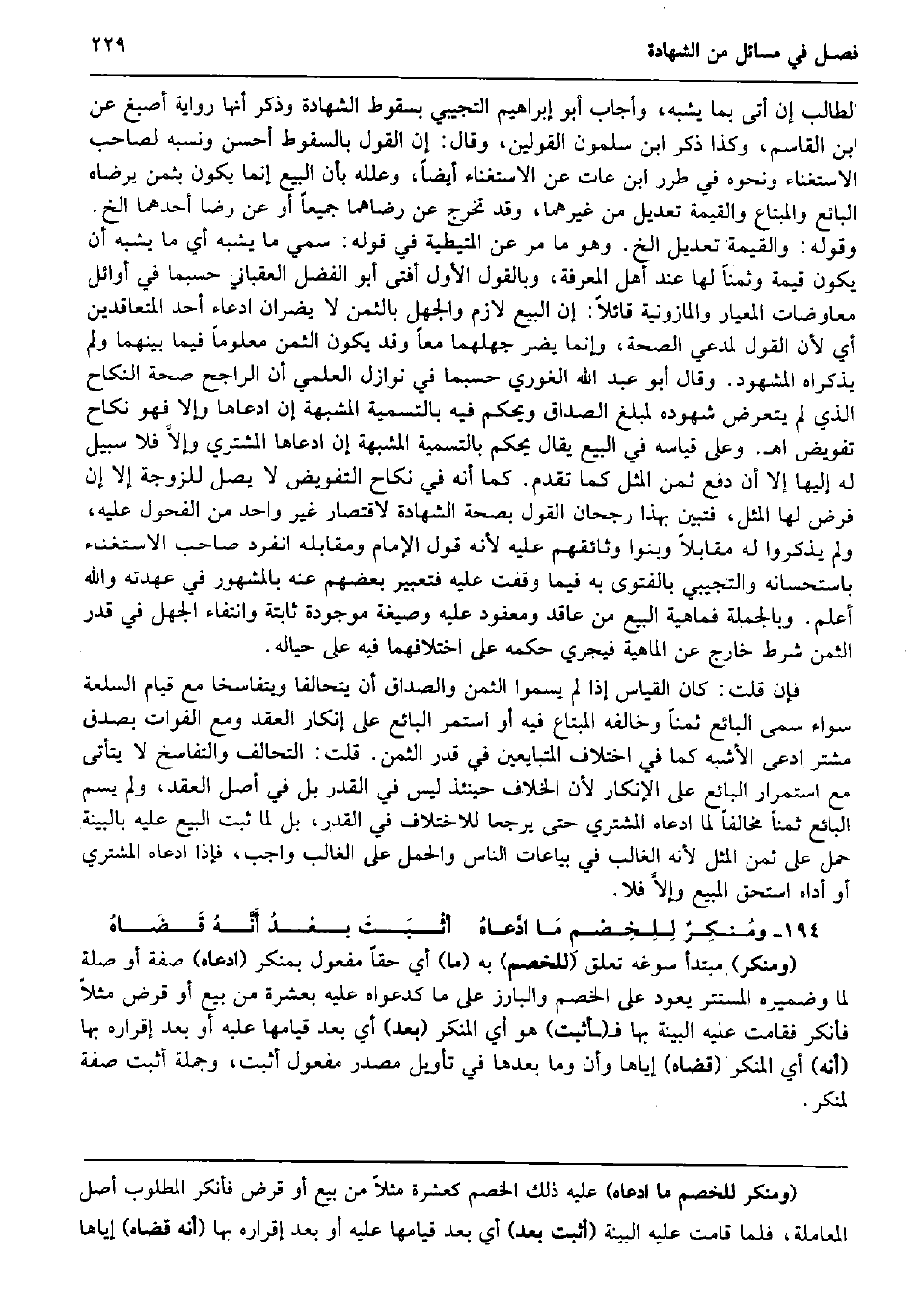 الطَّالِب إِن أَتَى بِمَا يشبه، وَأجَاب أَبُو إِبْرَاهِيم التجِيبِي بِسُقُوط الشَّهَادَة وَذكر أَنَّهَا رِوَايَة أصبغ عَن ابْن الْقَاسِم، وَكَذَا ذكر ابْن سَلمُون الْقَوْلَيْنِ، وَقَالَ: إِن القَوْل بالسقوط أحسن وَنسبه لصَاحب الِاسْتِغْنَاء وَنَحْوه فِي طرر ابْن عَاتٍ عَن الِاسْتِغْنَاء أَيْضا، وَعلله بِأَن البيع إِنَّمَا يكون بِثمن يرضاه البَائِع والمبتاع وَالْقيمَة تَعْدِيل من غَيرهمَا، وَقد تخرج عَن رضاهما جَمِيعًا أَو عَن رضَا أَحدهمَا الخ. وَقَوله: وَالْقيمَة تَعْدِيل الخ. وَهُوَ مَا مر عَن الْمُتَيْطِيَّة فِي قَوْله: سمي مَا يشبه أَي مَا يشبه أَن يكون قيمَة وَثمنا لَهَا عِنْد أهل الْمعرفَة، وبالقول الأول أفتى أَبُو الْفضل العقباني حَسْبَمَا فِي أَوَائِل معاوضات المعيار والمازونية قَائِلا: إِن البيع لَازم وَالْجهل بِالثّمن لَا يضران ادِّعَاء أحد الْمُتَعَاقدين أَي لِأَن القَوْل لمُدعِي الصِّحَّة، وَإِنَّمَا يضر جهلهما مَعًا وَقد يكون الثّمن مَعْلُوما فِيمَا بَينهمَا وَلم يذكراه الْمَشْهُود. وَقَالَ أَبُو عبد الله الغوري حَسْبَمَا فِي نَوَازِل العلمي أَن الرَّاجِح صِحَة النِّكَاح الَّذِي لم يتَعَرَّض شُهُوده لمبلغ الصَدَاق وَيحكم فِيهِ بِالتَّسْمِيَةِ المشبهة إِن ادَّعَاهَا وَإِلَّا فَهُوَ نِكَاح تَفْوِيض اه. وعَلى قِيَاسه فِي البيع يُقَال يحكم بِالتَّسْمِيَةِ المشبهة إِن ادَّعَاهَا المُشْتَرِي وإلاَّ فَلَا سَبِيل لَهُ إِلَيْهَا إِلَّا أَن دفع ثمن الْمثل كَمَا تقدم. كَمَا أَنه فِي نِكَاح التَّفْوِيض لَا يصل للزَّوْجَة إِلَّا إِن فرض لَهَا الْمثل، فَتبين بِهَذَا رُجْحَان القَوْل بِصِحَّة الشَّهَادَة لاقتصار غير وَاحِد من الفحول عَلَيْهِ، وَلم يذكرُوا لَهُ مُقَابلا وبنوا وثائقهم عَلَيْهِ لِأَنَّهُ قَول الإِمَام وَمُقَابِله انْفَرد صَاحب الِاسْتِغْنَاء باستحسانه والتجيبي بالفتوى بِهِ فِيمَا وقفت عَلَيْهِ فتعبير بَعضهم عَنهُ بالمشهور فِي عهدته وَالله أعلم. وَبِالْجُمْلَةِ فماهية البيع من عَاقد ومعقود عَلَيْهِ وَصِيغَة مَوْجُودَة ثَابِتَة وَانْتِفَاء الْجَهْل فِي قدر الثّمن شَرط خَارج عَن الْمَاهِيّة فَيجْرِي حكمه على اخْتِلَافهمَا فِيهِ على حياله. فَإِن قلت: كَانَ الْقيَاس إِذا لم يسموا الثّمن وَالصَّدَاق أَن يتحالفا ويتفاسخا مَعَ قيام السّلْعَة سَوَاء سمى البَائِع ثمنا وَخَالفهُ الْمُبْتَاع فِيهِ أَو اسْتمرّ البَائِع على إِنْكَار العقد وَمَعَ الْفَوات بِصدق مُشْتَر ادّعى الْأَشْبَه كَمَا فِي اخْتِلَاف الْمُتَبَايعين فِي قدر الثّمن. قلت: التَّحَالُف والتفاسخ لَا يَتَأَتَّى مَعَ اسْتِمْرَار البَائِع على الْإِنْكَار لِأَن الْخلاف حِينَئِذٍ لَيْسَ فِي الْقدر بل فِي أصل العقد، وَلم يسم البَائِع ثمنا مُخَالفا لما ادَّعَاهُ المُشْتَرِي حَتَّى يرجعا للِاخْتِلَاف فِي الْقدر، بل لما ثَبت البيع عَلَيْهِ بِالْبَيِّنَةِ حمل على ثمن الْمثل لِأَنَّهُ الْغَالِب فِي بياعات النَّاس وَالْحمل على الْغَالِب وَاجِب، فَإِذا ادَّعَاهُ المُشْتَرِي أَو أَدَّاهُ اسْتحق الْمَبِيع وإلاَّ فَلَا. ومُنكِرٌ لِلِخِصْمِ مَا ادَّعاهُ أثْبَتَ بعْدُ أَنَّهُ قَضَاهُ (ومنكر) مُبْتَدأ سوغه تعلق (للخصم) بِهِ (مَا) أَي حَقًا مفعول بمنكر (ادَّعَاهُ) صفة أَو صلَة لما وضميره الْمُسْتَتر يعود على الْخصم والبارز على مَا كدعواه عَلَيْهِ بِعشْرَة من بيع أَو قرض مثلا فَأنْكر فَقَامَتْ عَلَيْهِ الْبَيِّنَة بهَا ف (أثبت) هُوَ أَي الْمُنكر (بعد) أَي بعد قِيَامهَا عَلَيْهِ أَو بعد إِقْرَاره بهَا (أَنه) أَي الْمُنكر (قَضَاهُ) إِيَّاهَا وَأَن وَمَا بعْدهَا فِي تَأْوِيل مصدر مفعول أثبت وَجُمْلَة أثبت صفة لمنكر.