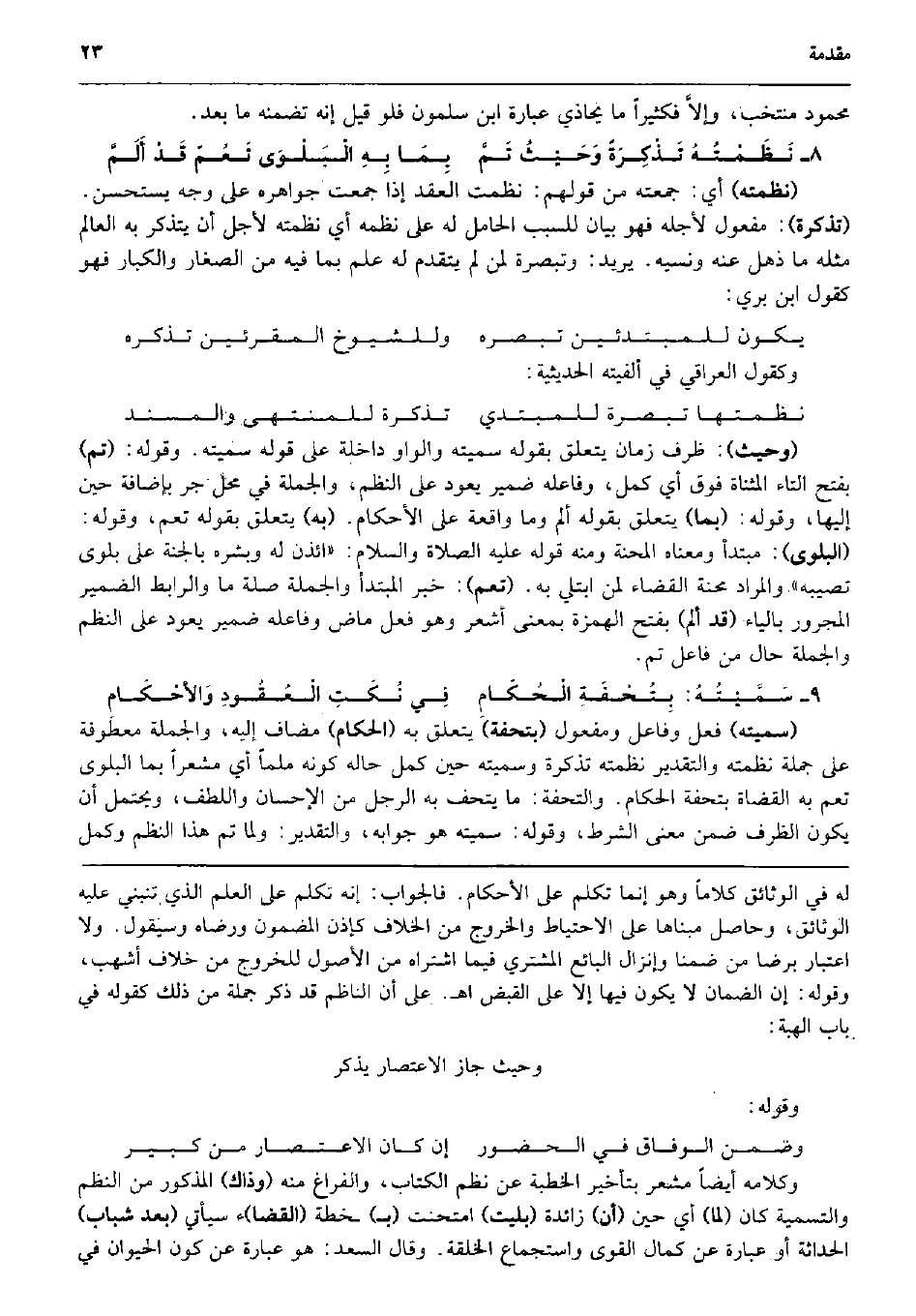 مَحْمُود منتخب، وإلاَّ فكثيراً مَا يُحَاذِي عبارَة ابْن سَلمُون فَلَو قيل إِنَّه تضمنه مَا بعد. نَظَمْتُهُ تَذْكِرَةً وَحَيْثُ تَمَّ بِمَا بِهِ الْبَلْوَى تَعُمّ قَدْ أَلَمَّ (نظمته) أَي: جمعته من قَوْلهم: نظمت العقد إِذا جمعت جواهره على وَجه يستحسن. (تذكرة) : مفعول لأَجله فَهُوَ بَيَان للسبب الْحَامِل لَهُ على نظمه أَي نظمته لأجل أَن يتَذَكَّر بِهِ الْعَالم مثله مَا ذهل عَنهُ ونسيه. يُرِيد: وتبصرة لمن لم يتَقَدَّم لَهُ علم بِمَا فِيهِ من الصغار والكبار فَهُوَ كَقَوْل ابْن بري: يكون للمبتدئين تبصره وللشيوخ المقرئين تذكره وكقول الْعِرَاقِيّ فِي ألفيته الحديثية: نظمتها تبصرة للمبتدي تذكرة للمنتهى والمسند (وَحَيْثُ) : ظرف زمَان يتَعَلَّق بقوله سميته وَالْوَاو دَاخِلَة على قَوْله سميته. وَقَوله: (تمّ) بِفَتْح التَّاء الْمُثَنَّاة فَوق أَي كمل، وفاعله ضمير يعود على النّظم، وَالْجُمْلَة فِي مَحل جر بِإِضَافَة حِين إِلَيْهَا، وَقَوله: (بِمَا) يتَعَلَّق بقوله ألم وَمَا وَاقعَة على الْأَحْكَام. (بِهِ) يتَعَلَّق بقوله تعم، وَقَوله: (الْبلوى) : مُبْتَدأ وَمَعْنَاهُ المحنة وَمِنْه قَوْله عَلَيْهِ الصَّلَاة وَالسَّلَام: (ائْذَنْ لَهُ وبشره بِالْجنَّةِ على بلوى تصيبه) وَالْمرَاد محنة الْقَضَاء لمن ابْتُلِيَ بِهِ. (تعم) : خبر الْمُبْتَدَأ وَالْجُمْلَة صلَة مَا والرابط الضَّمِير الْمَجْرُور بِالْيَاءِ (قد ألم) بِفَتْح الْهمزَة بِمَعْنى أشعر وَهُوَ فعل مَاض وفاعله ضمير يعود على النّظم وَالْجُمْلَة حَال من فَاعل تمّ. سَمَّيْتُهُ: بِتُحْفَةِ الْحُكّامِ فِي نُكَتِ الْعُقُودِ وَالأحْكَامِ (سميته) فعل وفاعل ومفعول (بتحفة) يتَعَلَّق بِهِ (الْحُكَّام) مُضَاف إِلَيْهِ وَالْجُمْلَة معطوفة على جملَة نظمته وَالتَّقْدِير نظمته تذكرة وسميته حِين كمل حَاله كَونه ملماً أَي مشعراً بِمَا الْبلوى تعم بِهِ الْقُضَاة بتحفة الْحُكَّام. والتحفة: مَا يتحف بِهِ الرجل من الْإِحْسَان واللطف، وَيحْتَمل أَن يكون الظّرْف ضمن معنى الشَّرْط، وَقَوله: سميته هُوَ جَوَابه، وَالتَّقْدِير: وَلما تمّ هَذَا النّظم وكمل