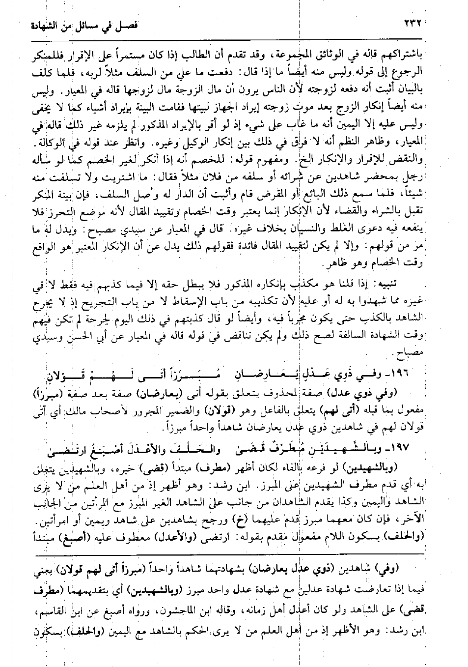 باشتراكهم قَالَه فِي الوثائق الْمَجْمُوعَة، وَقد تقدم أَن الطَّالِب إِذا كَانَ مستمراً على الْإِقْرَار فللمنكر الرُّجُوع إِلَى قَوْله وَلَيْسَ مِنْهُ أَيْضا مَا إِذا قَالَ: دفعت مَا عَليّ من السّلف مثلا لرَبه، فَلَمَّا كلف بِالْبَيَانِ أثبت أَنه دَفعه لزوجته لِأَن النَّاس يرَوْنَ أَن مَال الزَّوْجَة مَال لزَوجهَا قَالَه فِي المعيار. وَلَيْسَ مِنْهُ أَيْضا إِنْكَار الزَّوْج بعد موت زَوجته إِيرَاد الجهاز لبيتها فَقَامَتْ الْبَيِّنَة بإيراد أَشْيَاء كَمَا لَا يخفى وَلَيْسَ عَلَيْهِ إِلَّا الْيَمين أَنه مَا غَابَ على شَيْء إِذْ لَو أقرّ بالإيراد الْمَذْكُور لم يلْزمه غير ذَلِك قَالَه فِي المعيار، وَظَاهر النّظم أَنه لَا فرق فِي ذَلِك بَين إِنْكَار الْوَكِيل وَغَيره. وَانْظُر عِنْد قَوْله فِي الْوكَالَة. والنقض للإقرار وَالْإِنْكَار الخ. وَمَفْهُوم قَوْله: للخصم أَنه إِذا أنكر لغير الْخصم كَمَا لَو سَأَلَهُ رجل بِمحضر شَاهِدين عَن شِرَائِهِ أَو سلفه من فلَان مثلا فَقَالَ: مَا اشْتريت وَلَا تسلفت مِنْهُ شَيْئا، فَلَمَّا سمع ذَلِك البَائِع أَو الْمقْرض قَامَ وَأثبت أَن الدَّار لَهُ وأصل السّلف، فَإِن بَيِّنَة الْمُنكر تقبل بِالشِّرَاءِ وَالْقَضَاء لِأَن الْإِنْكَار إِنَّمَا يعْتَبر وَقت الْخِصَام وَتَقْيِيد الْمقَال لِأَنَّهُ مَوضِع التَّحَرُّز فَلَا يَنْفَعهُ فِيهِ دَعْوَى الْغَلَط وَالنِّسْيَان بِخِلَاف غَيره. قَالَ فِي المعيار عَن سَيِّدي مِصْبَاح: وَيدل لَهُ مَا مر من قَوْلهم: وَإِلَّا لم يكن لتقييد الْمقَال فَائِدَة فَقَوْلهم ذَلِك يدل عَن أَن الْإِنْكَار الْمُعْتَبر هُوَ الْوَاقِع وَقت الْخِصَام وَهُوَ ظَاهر. تَنْبِيه: إِذا قُلْنَا هُوَ مكذب بإنكاره الْمَذْكُور فَلَا يبطل حَقه إِلَّا فِيمَا كذبهمْ فِيهِ فَقَط لَا فِي غَيره مِمَّا شهدُوا بِهِ لَهُ أَو عَلَيْهِ لِأَن تَكْذِيبه من بَاب الْإِسْقَاط لَا من بَاب التجريح إِذْ لَا يجرح الشَّاهِد بِالْكَذِبِ حَتَّى يكون مجرباً فِيهِ، وَأَيْضًا لَو قَالَ كذبتهم فِي ذَلِك الْيَوْم لجرحة لم تكن فيهم وَقت الشَّهَادَة السالفة لصَحَّ ذَلِك وَلم يكن تنَاقض فِي قَوْله قَالَه فِي المعيار عَن أبي الْحسن وسيدي مِصْبَاح. وَفِي ذَوِي عَدْلٍ يُعَارِضانِ مُبَرِّزاً أتَى لَهُمْ قَوْلانِ (وَفِي ذَوي عدل) صفة لمَحْذُوف يتَعَلَّق بقوله أَتَى (يعارضان) صفة بعد صفة (مبرزاً) مفعول بِمَا قبله (أَتَى لَهُم) يتَعَلَّق بالفاعل وَهُوَ (قَولَانِ) وَالضَّمِير الْمَجْرُور لأَصْحَاب مَالك أَي أَتَى قَولَانِ لَهُم فِي شَاهِدين ذَوي عدل يعارضان شَاهدا وَاحِدًا مبرزاً. وبالشَّهيدَيْنِ مُطَرِّفٌ قَضَى صلى الله عَلَيْهِ وَسلم
