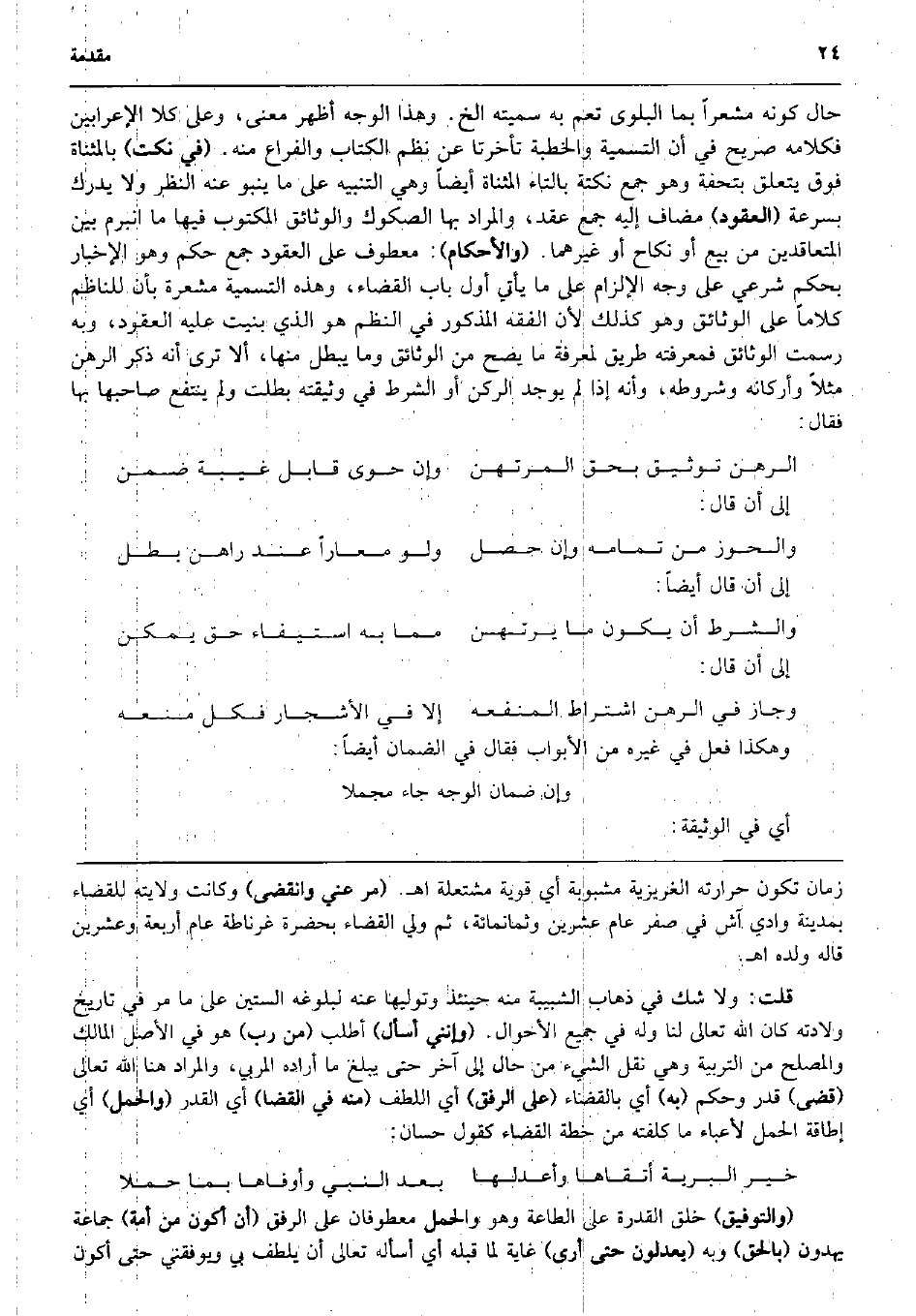 حَال كَونه مشعراً بِمَا الْبلوى تعم بِهِ سميته الخ. وَهَذَا الْوَجْه أظهر معنى، وعَلى كلا الإعرابين فَكَلَامه صَرِيح فِي أَن التَّسْمِيَة وَالْخطْبَة تأخرتا عَن نظم الْكتاب والفراع مِنْهُ. (فِي نكت) بِالْمُثَنَّاةِ فَوق يتَعَلَّق بتحفة وَهُوَ جمع نُكْتَة بِالتَّاءِ الْمُثَنَّاة أَيْضا وَهِي التَّنْبِيه على مَا ينبو عَنهُ النّظر وَلَا يدْرك بِسُرْعَة (الْعُقُود) مُضَاف إِلَيْهِ جمع عقد، وَالْمرَاد بهَا الصكوك والوثائق الْمَكْتُوب فِيهَا مَا انبرم بَين الْمُتَعَاقدين من بيع أَو نِكَاح أَو غَيرهمَا. (وَالْأَحْكَام) : مَعْطُوف على الْعُقُود جمع حكم وَهُوَ الْإِخْبَار بِحكم شَرْعِي على وَجه الْإِلْزَام على مَا يَأْتِي أول بَاب الْقَضَاء، وَهَذِه التَّسْمِيَة مشعرة بِأَن للناظم كلَاما على الوثائق وَهُوَ كَذَلِك لِأَن الْفِقْه الْمَذْكُور فِي النّظم هُوَ الَّذِي بنيت عَلَيْهِ الْعُقُود، وَبِه رسمت الوثائق فمعرفته طَرِيق لمعْرِفَة مَا يَصح من الوثائق وَمَا يبطل مِنْهَا، أَلا ترى أَنه ذكر الرَّهْن مثلا وأركانه وشروطه، وَأَنه إِذا لم يُوجد الرُّكْن أَو الشَّرْط فِي وثيقته بطلت وَلم ينْتَفع صَاحبهَا بهَا فَقَالَ: الرَّهْن تَوْثِيق بِحَق الْمُرْتَهن وَإِن حوى قَابل غيبَة ضمن إِلَى أَن قَالَ: والحوز من تَمَامه وَإِن حصل وَلَو معاراً عِنْد رَاهن بَطل إِلَى أَن قَالَ أَيْضا: وَالشّرط أَن يكون مَا يرتهن مِمَّا بِهِ اسْتِيفَاء حق يُمكن إِلَى أَن قَالَ: وَجَاز فِي الرَّهْن اشْتِرَاط المنفعه إِلَّا فِي الْأَشْجَار فَكل مَنعه وَهَكَذَا فعل فِي غَيره من الْأَبْوَاب فَقَالَ فِي الضَّمَان أَيْضا: وَإِن ضَمَان الْوَجْه جَاءَ مُجملا أَي فِي الْوَثِيقَة: