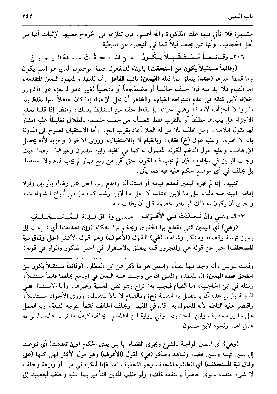 مشتهرة وَمن لَا تخرج أصلا. وَمَا مر من أَنَّهَا فِي هَذَا الْقسم الثَّالِث تحلف فِي بَيتهَا هُوَ الْأَظْهر عِنْد عِيَاض، وَاقْتصر عَلَيْهِ عبد الْوَهَّاب وَهُوَ الْمُعْتَمد، وَذهب الأندلسيون إِلَى أَنَّهَا تخرج لَيْلًا أَيْضا، والمدونة مُحْتَملَة للقولين، وَالْأول هُوَ ظَاهر قَول (خَ) وَخرجت المخدرة فِيمَا ادَّعَت أَو ادّعى عَلَيْهَا إِلَّا الَّتِي لَا تخرج نَهَارا وَإِن مُسْتَوْلدَة قَلِيلا الخ. وَمحل الْقَوْلَيْنِ فِيمَا إِذا كَانَت مَطْلُوبَة وَإِلَّا فَإِن كَانَت طالبة كَمَا لَو أَرَادَت الْحلف مَعَ شَاهدهَا خرجت لَيْلًا قَالَه (ت) وَقَول ابْن الْعَطَّار حَسْبَمَا فِي القلشاني على الرسَالَة معنى قَوْلهم: لَا يخْرجن أَي لَا يخْرجن مشتهرات. وإلاَّ فالتي تخرج غير مشتهرة حكمهَا حكم من لَا تخرج أَلْبَتَّة الخ. مَعْنَاهُ حكمهَا حكم من لَا تخرج بِالنَّهَارِ أَلْبَتَّة كَمَا فهمه الأَجْهُورِيّ أَي فيلزمها الْخُرُوج لَيْلًا كَمَا مر، وَلَيْسَ مَعْنَاهُ حكمهَا حكم من لَا تخرج أصلا لَا لَيْلًا وَلَا نَهَارا كَمَا قيل: لِأَنَّهُ يكون الرَّاجِح فِيهَا حِينَئِذٍ أَن تحلف فِي بَيتهَا كَمَا مرّ، وَيلْزم عَلَيْهِ أَن لَا تخرج إِلَّا لَيْلًا تحلف فِي بَيتهَا من بَاب أولى لِأَنَّهَا أبلغ فِي السّتْر فَتَأَمّله وَالله أعلم. وعَلى هَذَا يحمل قَول ابْن رشد وَعِنْدِي فِي خُرُوج الْمَرْأَة إِلَى الْجَامِع بِالنَّهَارِ كشف لَهَا ولحالها وَإِن كَانَت تخرج بِالنَّهَارِ لِأَنَّهَا إِذا خرجت للحلف عرف أَنَّهَا فُلَانَة بِخِلَاف مَا إِذا خرجت لغير ذَلِك، وَقد أَخْبرنِي بعض الْفُقَهَاء أَنَّهَا وَقعت بتونس وَأَنه وجد فِيهَا نصا اه. لَكِن كَلَامه ظَاهر فِي أَنه فِي الَّتِي تخرج بِالنَّهَارِ غير مشتهرة كَمَا مرّ عَن الأَجْهُورِيّ، وَأما الَّتِي تخرج بِهِ مشتهرة فَلَا تَأتي فِيهَا علته الْمَذْكُورَة وَالله أعلم. فَإِن تنَازعا فِي الْخُرُوج فعلَيْهَا الْإِثْبَات أَنَّهَا من أهل الْحجاب، وَأَنَّهَا مِمَّن يحلف لَيْلًا كَمَا فِي التَّبْصِرَة عَن الْمُتَيْطِيَّة. وقَائِماً مُسْتَقْبِلاً يكُونُ مَنِ اسْتُحِقَّتْ عِنْدهُ اليَمينُ (وَقَائِمًا مُسْتَقْبلا يكون من اسْتحقَّت) بِالْبِنَاءِ للْمَفْعُول صلَة الْمَوْصُول الَّذِي هُوَ اسْم يكون وَمَا قبلهَا خَبَرهَا (عِنْده) يتَعَلَّق بِمَا قبله (الْيَمين) نَائِب الْفَاعِل وأل للْعهد والمعهود الْيَمين الْمُتَقَدّمَة، أما الْقيام فَلَا بُد مِنْهُ فَإِن حلف جَالِسا أَو مُضْطَجعا أَو منحنياً لغير عذر لم تجزه على الْمَشْهُور خلافًا لِابْنِ كنَانَة فِي عدم اشْتِرَاطه الْقيام، وَالظَّاهِر أَن مَحل الْإِجْزَاء إِذا كَانَ جَاهِلا بِأَنَّهَا تغلظ بِمَا ذكرُوا لَا أَجْزَأت لِأَنَّهُ قد رَضِي حِينَئِذٍ بِإِسْقَاط حَقه من التَّغْلِيظ بذلك وَانْظُر إِذا قُلْنَا بِعَدَمِ الْإِجْزَاء هَل يُعِيدهَا مُطلقًا أَو بِالْقربِ فَقَط كَمَسْأَلَة من حلف لخصمه بِالطَّلَاق تَغْلِيظًا عَلَيْهِ الْمشَار لَهَا بقول اللامية. وَمن يحلف بِلَا من لَهُ الْعلَا أعَاد بِقرب الخ. وَأما الِاسْتِقْبَال فَصرحَ فِي الْمُدَوَّنَة بِأَنَّهُ لَا يجب، وَعَلِيهِ عول (خَ) فَقَالَ: وبالقيام لَا بالاستقبال، وروى الأخوان وُجُوبه لِأَنَّهُ يحصل الإرهاب، وَعَلِيهِ عول النَّاظِم لكَونه الْمَعْمُول بِهِ كَمَا فِي الْمُفِيد وَابْن سَلمُون وَغَيرهمَا. وَهَذَا حَيْثُ وَجَبت الْيَمين فِي الْجَامِع، فَإِن لم تجب فِيهِ لكَون الْحق أقل من ربع دِينَار لم يجب قيام وَلَا اسْتِقْبَال بل يحلف فِي أَي مَوضِع حكم عَلَيْهِ فِيهِ كَمَا يَأْتِي. تَنْبِيه: إِذا لم تجزه الْيَمين لعدم قِيَامه أَو استقباله وَقطع رب الْحق عَن رِضَاهُ بِالْيَمِينِ وَأَرَادَ إِقَامَة الْبَيِّنَة فَلهُ ذَلِك على مَا لِابْنِ عتاب لَا على مَا لِابْنِ رشد كَمَا مرّ فِي أَنْوَاع الش