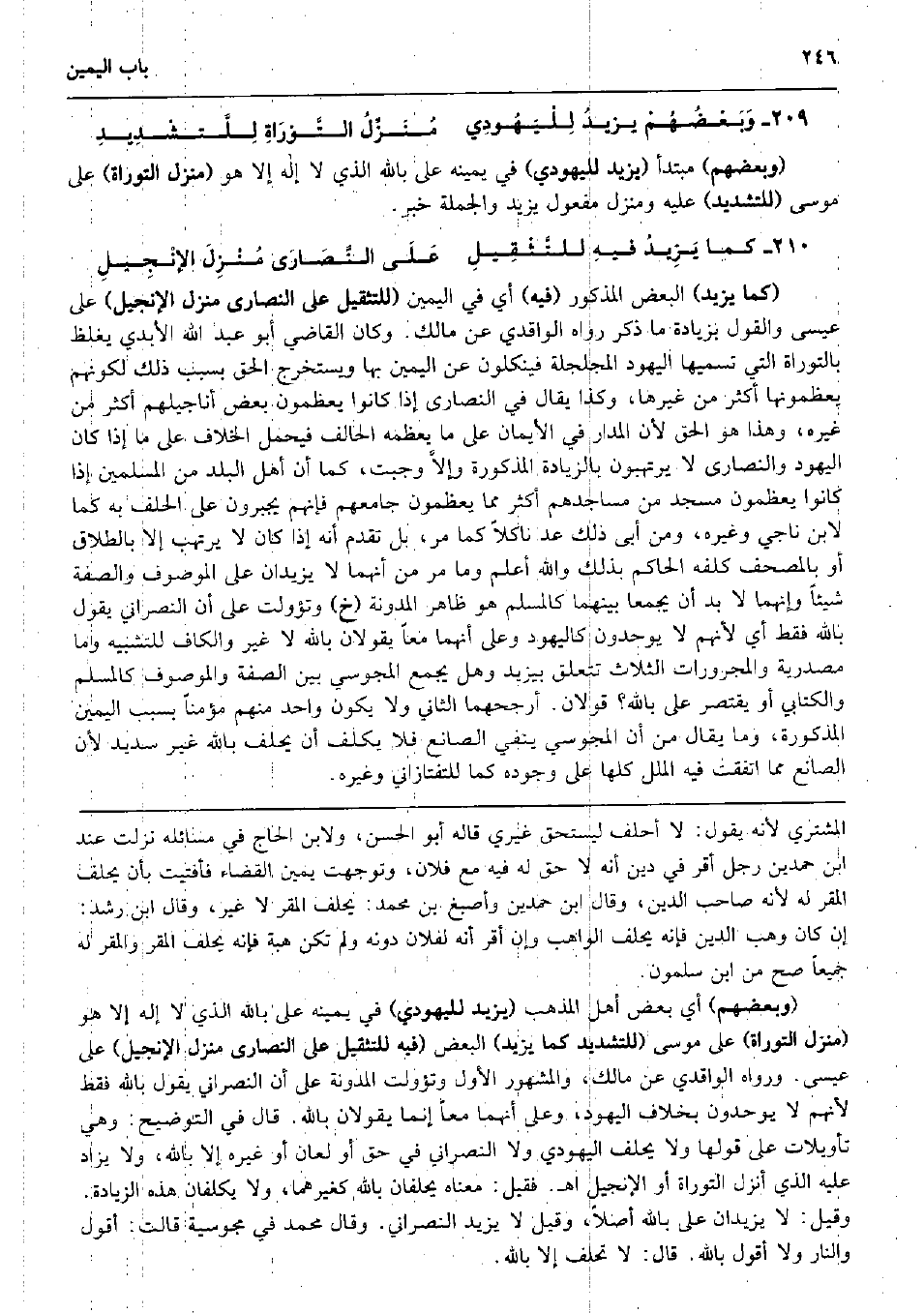 1648 - ; هـ إِلَّا هُوَ (منزل التَّوْرَاة) على مُوسَى (للتشديد) عَلَيْهِ ومنزل مفعول يزِيد وَالْجُمْلَة خبر. كَمَا يَزِيدُ فيهِ للتَّثْقِيلِ عَلَى النَّصَارَى مُنْزِلَ الإنْجِيلِ (كَمَا يزِيد) الْبَعْض الْمَذْكُور (فِيهِ) أَي فِي الْيَمين (للتثقيل على النَّصَارَى منزل الْإِنْجِيل) على عِيسَى وَالْقَوْل بِزِيَادَة مَا ذكر رَوَاهُ الْوَاقِدِيّ عَن مَالك. وَكَانَ القَاضِي أَبُو عبد الله الأبدي يغلظ بِالتَّوْرَاةِ الَّتِي تسميها الْيَهُود المجلجلة فينكلون عَن الْيَمين بهَا ويستخرج الْحق بِسَبَب ذَلِك لكَوْنهم يعظمونها أَكثر من غَيرهَا، وَكَذَا يُقَال فِي النَّصَارَى إِذا كَانُوا يعظمون بعض أَنَاجِيلهمْ أَكثر من غَيره، وَهَذَا هُوَ الْحق لِأَن الْمدَار فِي الْأَيْمَان على مَا يعظمه الْحَالِف فَيحمل الْخلاف على مَا إِذا كَانَ الْيَهُود وَالنَّصَارَى لَا يرتهبون بِالزِّيَادَةِ الْمَذْكُورَة وإلاَّ وَجَبت، كَمَا أَن أهل الْبَلَد من الْمُسلمين إِذا كَانُوا يعظمون مَسْجِد من مَسَاجِدهمْ أَكثر مِمَّا يعظمون جامعهم فَإِنَّهُم يجبرون على الْحلف بِهِ كَمَا لِابْنِ نَاجِي وَغَيره، وَمن أَبى ذَلِك عد ناكلاً كَمَا مر، بل تقدم أَنه إِذا كَانَ لَا يرتهب إِلَّا بِالطَّلَاق أَو بالمصحف كلفه الْحَاكِم بذلك وَالله أعلم وَمَا مر من أَنَّهُمَا لَا يزيدان على الْمَوْصُوف وَالصّفة شَيْئا وإنهما لَا بُد أَن يجمعا بَينهمَا كَالْمُسلمِ هُوَ ظَاهر الْمُدَوَّنَة (خَ) وتؤولت على أَن النَّصْرَانِي يَقُول بِاللَّه فَقَط أَي لأَنهم لَا يوحدون كاليهود وعَلى أَنَّهُمَا مَعًا يَقُولَانِ بِاللَّه لَا غير وَالْكَاف للتشبيه وَمَا مَصْدَرِيَّة والمجرورات الثَّلَاث تتَعَلَّق بِيَزِيد وَهل يجمع الْمَجُوسِيّ بَين الصّفة والموصوف كَالْمُسلمِ والكتابي أَو يقْتَصر على بِاللَّه؟ قَولَانِ. أرجحهما الثَّانِي وَلَا يكون وَاحِد مِنْهُم مُؤمنا بِسَبَب الْيَمين الْمَذْكُورَة، وَمَا يُقَال من أَن الْمَجُوسِيّ يَنْفِي الصَّانِع فَلَا يُكَلف أَن يحلف بِاللَّه غير سديد لِأَن الصَّانِع مِمَّا اتّفقت فِيهِ الْملَل كلهَا على وجوده كَمَا للتفتازاني وَغَيره.