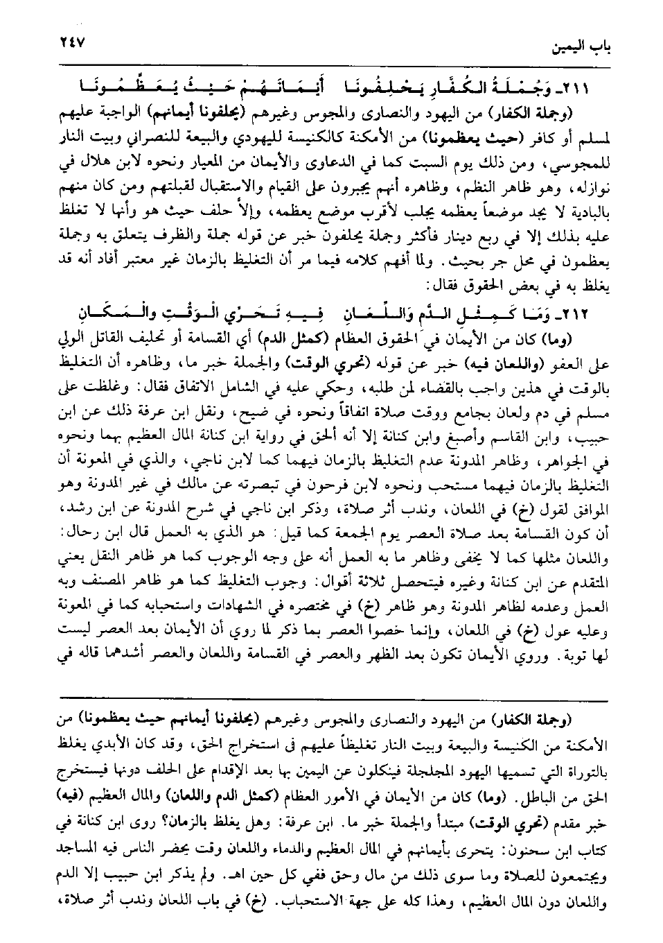 وَجُمْلَةُ الكُفَّارِ يَحْلِفُونَا أَيْمَانَهُمْ حَيْثُ يُعَظِّمُونَا (وَجُمْلَة الْكفَّار) من الْيَهُود وَالنَّصَارَى وَالْمَجُوس وَغَيرهم (يحلفونا أَيْمَانهم) الْوَاجِبَة عَلَيْهِم لمُسلم أَو كَافِر (حَيْثُ يعظمونا) من الْأَمْكِنَة كالكنيسة لِلْيَهُودِيِّ والبيعة لِلنَّصْرَانِيِّ وَبَيت النَّار للمجوسي، وَمن ذَلِك يَوْم السبت كَمَا فِي الدَّعَاوَى والأيمان من المعيار وَنَحْوه لِابْنِ هِلَال فِي نوازله، وَهُوَ ظَاهر النّظم، وَظَاهره أَنهم يجبرون على الْقيام والاستقبال لقبلتهم وَمن كَانَ مِنْهُم بالبادية لَا يجد موضعا يعظمه يجلب لأَقْرَب مَوضِع يعظمه وإلاَّ حلف حَيْثُ هُوَ وَأَنَّهَا لَا تغلظ عَلَيْهِ بذلك إِلَّا فِي ربع دِينَار فَأكْثر وَجُمْلَة يحلفُونَ خبر عَن قَوْله جملَة والظرف يتَعَلَّق بِهِ وَجُمْلَة يعظمون فِي مَحل جر بِحَيْثُ. وَلما أفهم كَلَامه فِيمَا مر أَن التَّغْلِيظ بِالزَّمَانِ غير مُعْتَبر أَفَادَ أَنه قد يغلظ بِهِ فِي بعض الْحُقُوق فَقَالَ: وَمَا كَمِثْلِ الدَّمِ وَاللِّعَانِ فِيهِ تَحَرِّي الْوَقْتِ والْمَكَانِ (وَمَا) كَانَ من الْأَيْمَان فِي الْحُقُوق الْعِظَام (كَمثل الدَّم) أَي الْقسَامَة أَو تَحْلِيف الْقَاتِل الْوَلِيّ على الْعَفو (وَاللّعان فِيهِ) خبر عَن قَوْله (تحري الْوَقْت) وَالْجُمْلَة خبر مَا، وَظَاهره أَن التَّغْلِيظ بِالْوَقْتِ فِي هذَيْن وَاجِب بِالْقضَاءِ لمن طلبه، وَحكي عَلَيْهِ فِي الشَّامِل الِاتِّفَاق فَقَالَ: وغلظت على مُسلم فِي دم ولعان بِجَامِع وَوقت صَلَاة اتِّفَاقًا وَنَحْوه فِي ضيح، وَنقل ابْن عَرَفَة ذَلِك عَن ابْن حبيب، وَابْن الْقَاسِم وَأصبغ وَابْن كنَانَة إِلَّا أَنه ألحق فِي رِوَايَة ابْن كنَانَة المَال الْعَظِيم بهما وَنَحْوه فِي الْجَوَاهِر، وَظَاهر الْمُدَوَّنَة عدم التَّغْلِيظ بِالزَّمَانِ فيهمَا كَمَا لِابْنِ نَاجِي، وَالَّذِي فِي المعونة أَن التَّغْلِيظ بِالزَّمَانِ فيهمَا مُسْتَحبّ وَنَحْوه لِابْنِ فَرِحُونَ فِي تبصرته عَن مَالك فِي غير الْمُدَوَّنَة وَهُوَ الْمُوَافق لقَوْل (خَ) فِي اللّعان، وَندب أثر صَلَاة، وَذكر ابْن نَاجِي فِي شرح الْمُدَوَّنَة عَن ابْن رشد، أَن كَون الْقسَامَة بعد صَلَاة الْعَصْر يَوْم الْجُمُعَة كَمَا قيل: هُوَ الَّذِي بِهِ الْعَمَل قَالَ ابْن رحال: وَاللّعان مثلهَا كَمَا لَا يخفى وَظَاهر مَا بِهِ الْعَمَل أَنه على وَجه الْوُجُوب كَمَا هُوَ ظَاهر النَّقْل يَعْنِي الْمُتَقَدّم عَن ابْن كنَانَة وَغَيره فيتحصل ثَلَاثَة أَقْوَال: وجوب التَّغْلِيظ كَمَا هُوَ ظَاهر المُصَنّف وَبِه الْعَمَل وَعَدَمه لظَاهِر الْمُدَوَّنَة وَهُوَ ظَاهر (خَ) فِي مُخْتَصره فِي الشَّهَادَات واستحبابه كَمَا فِي المعونة وَعَلِيهِ عول (خَ) فِي اللّعان، وَإِنَّمَا خصوا الْعَصْر بِمَا ذكر لما رُوِيَ أَن الْأَيْمَان بعد الْعَصْر لَيست لَهَا تَوْبَة. وَرُوِيَ الْأَيْمَان تكون بعد الظّهْر وَالْعصر فِي الْقسَامَة وَاللّعان وَالْعصر أشدهما قَالَه فِي