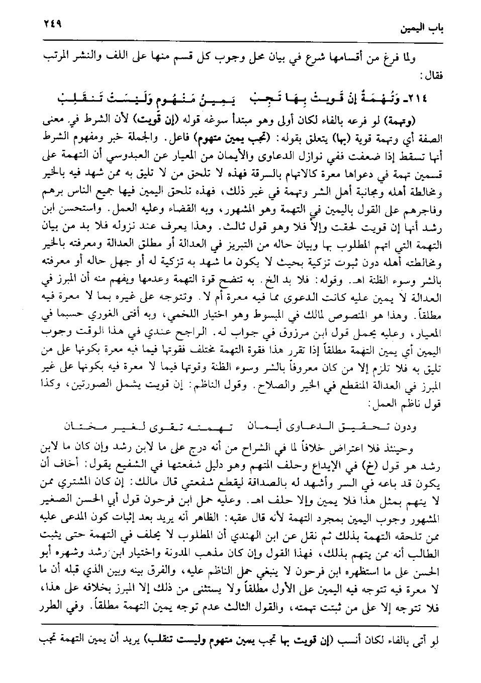 وَلما فرغ من أقسامها شرع فِي بَيَان مَحل وجوب كل قسم مِنْهَا على اللف والنشر الْمُرَتّب فَقَالَ: وَتُهْمَةٌ إنْ قَويتْ بِهَا تَجِبْ يَمِينُ مَتْهُومٍ وَلَيْسَتْ تَنقَلِبْ (وتهمة) لَو فَرعه بِالْفَاءِ لَكَانَ أولى وَهُوَ مُبْتَدأ سوغه قَوْله (إِن قويت) لِأَن الشَّرْط فِي معنى الصّفة أَي وتهمة قَوِيَّة (بهَا) يتَعَلَّق بقوله: (تجب يَمِين متهوم) فَاعل. وَالْجُمْلَة خبر وَمَفْهُوم الشَّرْط أَنَّهَا تسْقط إِذا ضعفت فَفِي نَوَازِل الدَّعَاوَى والأيمان من المعيار عَن العبدوسي أَن التُّهْمَة على قسمَيْنِ تُهْمَة فِي دَعْوَاهَا معرة كالاتهام بِالسَّرقَةِ فَهَذِهِ لَا تلْحق من لَا تلِيق بِهِ مِمَّن شهد فِيهِ بِالْخَيرِ ومخالطة أَهله ومجانبة أهل الشَّرّ وتهمة فِي غير ذَلِك، فَهَذِهِ تلْحق الْيَمين فِيهَا جَمِيع النَّاس برهم وفاجرهم على القَوْل بِالْيَمِينِ فِي التُّهْمَة وَهُوَ الْمَشْهُور، وَبِه الْقَضَاء وَعَلِيهِ الْعَمَل. وَاسْتحْسن ابْن رشد أَنَّهَا إِن قويت لحقت وإلاَّ فَلَا وَهُوَ قَول ثَالِث. وَهَذَا يعرف عِنْد نُزُوله فَلَا بُد من بَيَان التُّهْمَة الَّتِي اتهمَ الْمَطْلُوب بهَا وَبَيَان حَاله من التبريز فِي الْعَدَالَة أَو مُطلق الْعَدَالَة ومعرفته بِالْخَيرِ ومخالطته أَهله دون ثُبُوت تَزْكِيَة بِحَيْثُ لَا يكون مَا شهد بِهِ تَزْكِيَة لَهُ أَو جهل حَاله أَو مَعْرفَته بِالشَّرِّ وَسُوء الظنة اه. وَقَوله: فَلَا بُد الخ. بِهِ تتضح قُوَّة التُّهْمَة وَعدمهَا وَيفهم مِنْهُ أَن المبرز فِي الْعَدَالَة لَا يَمِين عَلَيْهِ كَانَت الدَّعْوَى مِمَّا فِيهِ معرة أم لَا. وتتوجه على غَيره بِمَا لَا معرة فِيهِ مُطلقًا. وَهَذَا هُوَ الْمَنْصُوص لمَالِك فِي الْمَبْسُوط وَهُوَ اخْتِيَار اللَّخْمِيّ، وَبِه أفتى الغوري حَسْبَمَا فِي المعيار، وَعَلِيهِ يحمل قَول ابْن مَرْزُوق فِي جَوَاب لَهُ. الرَّاجِح عِنْدِي فِي هَذَا الْوَقْت وجوب الْيَمين أَي يَمِين التُّهْمَة مُطلقًا إِذا تقرر هَذَا فقوة التُّهْمَة مُخْتَلف فقوتها فِيمَا فِيهِ معرة بِكَوْنِهَا على من تلِيق بِهِ فَلَا تلْزم إِلَّا من كَانَ مَعْرُوفا بِالشَّرِّ وَسُوء الظنة وقوتها فِيمَا لَا معرة فِيهِ بِكَوْنِهَا على غير المبرز فِي الْعَدَالَة الْمُنْقَطع فِي الْخَيْر وَالصَّلَاح. وَقَول النَّاظِم: إِن قويت يَشْمَل الصُّورَتَيْنِ، وَكَذَا قَول ناظم الْعَمَل: وَدون تَحْقِيق الدَّعَاوَى أَيْمَان تهمته تقوى لغير مختان وَحِينَئِذٍ فَلَا اعْتِرَاض خلافًا لما فِي الشُّرَّاح من أَنه درج على مَا لِابْنِ رشد وَإِن كَانَ مَا لِابْنِ رشد هُوَ قَول (خَ) فِي الْإِيدَاع وَحلف الْمُتَّهم وَهُوَ دَلِيل شفعتها فِي الشَّفِيع يَقُول: أَخَاف أَن يكون قد بَاعه فِي السِّرّ وَأشْهد لَهُ بالصداقة ليقطع شفعتي قَالَ مَالك: إِن كَانَ المُشْتَرِي مِمَّن لَا يتهم بِمثل هَذَا فَلَا يَمِين وَإِلَّا حلف اه. وَعَلِيهِ حمل ابْن فَرِحُونَ قَول أبي الْحسن الصَّغِير الْمَشْهُور وجوب الْيَمين بِمُجَرَّد التُّهْمَة لِأَنَّهُ قَالَ عقبه: الظَّاهِر أَنه يُرِيد بعد إِثْبَات كَون الْمُدعى عَلَيْهِ مِمَّن تلْحقهُ التُّهْمَة بذلك ثمَّ نقل عَن ابْن الْهِنْدِيّ أَن الْمَطْلُوب لَا يحلف فِي التُّهْمَة حَتَّى يثبت الطَّالِب أَنه مِمَّن يتهم بذلك، فَهَذَا القَوْل وَإِن كَانَ مَذْهَب الْمُدَوَّنَة وَاخْتِيَار ابْن رشد وشهره أَبُو الْحسن على مَا اسْتَظْهرهُ ابْن فَرِحُونَ لَا يَنْبَغِي حمل النَّاظِم عَلَيْهِ، وَالْفرق بَينه وَبَين الَّذِي قبله أَن مَا لَا معرة فِيهِ تتَوَجَّه فِيهِ الْيَمين على الأول مُطلقًا وَلَا يسْتَثْنى من ذَلِك إِلَّا المبرز بِخِلَافِهِ على هَذَا، فَلَا تتَوَجَّه إِلَّا على من ثبتَتْ تهمته، وَالْقَوْل الثَّالِث عدم توجه يَمِين التُّهْمَة مُطلقًا. وَفِي الطرر