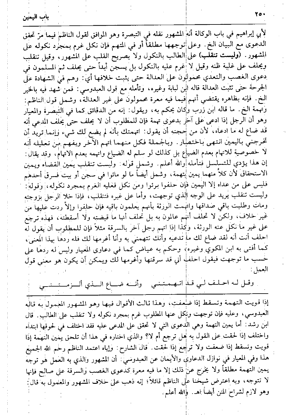 لأبي إِبْرَاهِيم فِي بَاب الْوكَالَة أَنه الْمَشْهُور نَقله فِي التَّبْصِرَة وَهُوَ الْمُوَافق لقَوْل النَّاظِم فِيمَا مرّ تحقق الدَّعْوَى مَعَ الْبَيَان الخ. وعَلى توجهها مُطلقًا أَو فِي الْمُتَّهم فَإِن نكل غرم بِمُجَرَّد نُكُوله على الْمَشْهُور. (وَلَيْسَت تنْقَلب) على الطَّالِب بِالنّكُولِ وَلَا بِصَرِيح الْقلب على الْمَشْهُور، وَقيل تنْقَلب وَيحلف على غَلَبَة ظَنّه وَقيل لَا غرم عَلَيْهِ بِالنّكُولِ بل يسجن أبدا حَتَّى يحلف ثمَّ الْمُسلمُونَ فِي دَعْوَى الْغَصْب والتعدي محمولون على الْعَدَالَة حَتَّى يثبت خلَافهَا أَي: وهم فِي الشَّهَادَة على الجرحة حَتَّى تثبت الْعَدَالَة قَالَه ابْن لبَابَة وَغَيره، وتأمله مَعَ قَول العبدوسي: فَمن شهد فِيهِ بِالْخَيرِ الخ. فَإِنَّهُ بِظَاهِرِهِ يَقْتَضِي أَنهم فِيمَا فِيهِ معرة محمولون على غير الْعَدَالَة، وَشَمل قَول النَّاظِم: وتهمة الخ. مَا قَالَه ابْن زرب وَكَانَ يحكم بِهِ، وَيَقُول: إِنَّه من الدقائق كَمَا فِي التَّبْصِرَة والمعيار وَهُوَ أَن الرجل إِذا ادّعى على آخر بِدَعْوَى تُهْمَة فَإِن للمطلوب أَن لَا يحلف حَتَّى يحلف الْمُدَّعِي أَنه قد ضَاعَ لَهُ مَا ادَّعَاهُ، لِأَن من حجَّته أَن يَقُول: اتهمتك بِأَنَّهُ لم يضع لَك شَيْء وَإِنَّمَا تُرِيدُ أَن تخرجني بِالْيَمِينِ انْتهى بِاخْتِصَار. وَبِالْجُمْلَةِ فَكل مِنْهُمَا اتهمَ الآخر وَيفهم من تَعْلِيله أَنه لَا خُصُوصِيَّة للاتهام بِعَدَمِ الضّيَاع بل كَذَلِك لَو سلم لَهُ الضّيَاع واتهمه بِعَدَمِ الاتهام، وَقد يُقَال: إِن هَذَا يُؤَدِّي للتسلسل فَتَأَمّله وَالله أعلم. وَشَمل قَوْله: وَلَيْسَت تنْقَلب يَمِين الْقَضَاء وَيَمِين الِاسْتِحْقَاق لِأَن كلاًّ مِنْهُمَا يَمِين بتهمة، وَشَمل أَيْضا مَا لَو مَاتُوا فِي سجن أَو بَيت فَسرق أحدهم فَلَيْسَ على من عداهُ إِلَّا الْيَمين فَإِن حلفوا برئوا وَمن نكل فَعَلَيهِ الْغرم بِمُجَرَّد نُكُوله، وَقَوله: وَلَيْسَت تنْقَلب يُرِيد على الْوَجْه الَّذِي تَوَجَّهت، وَأما على غَيره فتنقلب، فَإِذا خلا الرجل بِزَوْجَتِهِ وَمَات وَطلبت بَاقِي صَدَاقهَا واتهمت الْوَرَثَة بِأَنَّهُم يعلمُونَ بَاقِيه فَإِن حلفوا وإلاَّ ردَّتْ عَلَيْهَا من غير خلاف، وَلَكِن لَا تحلف أَنهم عالمون بِهِ بل تحلف أَنَّهَا مَا قَبضته وَلَا أسقطته، فَهَذِهِ ترجع على غير مَا نكل عَنهُ الْوَرَثَة، وَكَذَا إِذا اتهمَ رجل آخر بِالسَّرقَةِ مثلا فَإِن للمطلوب أَن يَقُول لَهُ احْلِف أَنْت أَنه لقد ضَاعَ لَك مَا تدعيه وَأَنَّك تتهمني بِهِ وَأَنا أغرمها لَك فَلهُ ردهَا بِهَذَا الْمَعْنى، كَمَا أفتى بِهِ ابْن المكوي وَغَيره، وَحكم بِهِ عِيَاض كَمَا فِي دعاوى المعيار وَلَيْسَ لَهُ ردهَا على حسب مَا تَوَجَّهت فَيَقُول احْلِف أَنِّي قد سرقتها وأغرمها لَك وَيُمكن أَن يكون هُوَ معنى قَول الْعَمَل: وَقل لَهُ احْلِف لي قد اتهمتني وَأَنه ضَاعَ الَّذِي ألزمتني