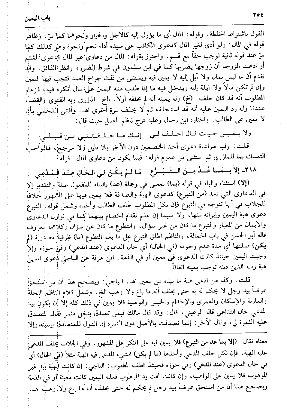 على القَوْل بِاشْتِرَاط الْخلطَة. وَقَوله: المَال أَي مَا يؤول إِلَيْهِ كالأجل وَالْخيَار وَنَحْوهمَا كَمَا مرّ. وَظَاهر قَوْله فِي المَال: وَلَو أدّى لغير المَال كدعوى الْمكَاتب على سَيّده أَدَاء نجم وَنَحْوه وَهُوَ كَذَلِك كَمَا مرّ عِنْد قَوْله ثَانِيَة توجب حَقًا مَعَ قسم. وَاحْترز بقوله: المَال من دعاوى غير المَال كدعوى الشتم أَو ادَّعَت الزَّوْجَة أَن زَوجهَا يضْربهَا كَمَا فِي ابْن سَلمُون فِي شَرط الضَّرَر، وَانْظُر الْفَائِق. وَقد تقدم أَن مَا لَيْسَ بِمَال وَلَا آيل إِلَيْهِ لَا يَمِين فِيهِ وَيسْتَثْنى من ذَلِك جراح الْعمد فَتجب فِيهَا الْيَمين وَإِن لم تكن مَالا وَلَا آيلة إِلَيْهِ وَيدخل فِيهِ مَا إِذا طلب مِنْهُ الْيَمين على مَال أنكرهُ فِيهِ، فَزعم الْمَطْلُوب أَنه قد كَانَ حلف. (خَ) وَله يَمِينه أَنه لم يحلفهُ أَولا. الخ. الْمَازرِيّ وَبِه الْفَتْوَى وَالْقَضَاء عندنَا وَله رد الْيَمين عَلَيْهِ أَنه قد استحلفه ثمَّ لَا يحلف مرّة أُخْرَى اه. وَأفْتى اللَّخْمِيّ بِأَن لَا يَمِين على الطَّالِب. وَاخْتَارَهُ ابْن رحال وَعَلِيهِ درج ناظم الْعَمَل حَيْثُ قَالَ: وَلَا يَمِين حَيْثُ قَالَ احْلِف لي إِنَّك مَا حلفتني من قبلي قلت: وَفِيه مُرَاعَاة دَعْوَى أحد الْخَصْمَيْنِ دون الآخر بِلَا دَلِيل وَلَا مُرَجّح، فَالْوَاجِب التَّمَسُّك بِمَا للمازري ثمَّ اسْتثْنى من عُمُوم قَوْله: فِيمَا يكون من دعاوى المَال. قَوْله: إلاَّ بِمَا عُدَّ مِنَ التَّبَرُّعِ مَا لَمْ يَكُنْ فِي الحَالِ عِنْدَ المُدَّعِي (إِلَّا) اسْتثِْنَاء وَالْبَاء فِي قَوْله (بِمَا) بِمَعْنى فِي وَجُمْلَة (عد) بِالْبِنَاءِ للْمَفْعُول صلَة وَالتَّقْدِير إِلَّا فِي الدَّعَاوَى الَّتِي تعد (من التَّبَرُّع) كدعوى الْهِبَة وَالصَّدَََقَة فَلَا يَمِين فِيهَا على الْمَشْهُور خلافًا للجلاب فِي أَنَّهَا تتَوَجَّه فِي التَّبَرُّع فَإِن نكل الْمَطْلُوب حلف الطَّالِب وَأَخذه وَشَمل قَوْله: التَّبَرُّع دَعْوَى هبة الْيَمين وإبرائه مِنْهَا، وَلَا سِيمَا إِن علم تقدم الْخِصَام بَينهمَا كَمَا فِي نَوَازِل الدَّعَاوَى والأيمان من المعيار والتبرع مَا كَانَ من غير سُؤال، والتطوع مَا كَانَ عَن سُؤال وَكِلَاهُمَا مَعْرُوف قَالَه أَبُو الْحسن فِي بَاب الْحمالَة، والناظم أطلق التَّبَرُّع على مَا يعم التَّطَوُّع (مَا) ظرفية مَصْدَرِيَّة (لم يكن) صلتها أَي مُدَّة عدم وجوده (فِي الْحَال) أَي حَال الدَّعْوَى (عِنْد الْمُدَّعِي) وَفِي حوزه وإلاَّ وَجَبت الْيَمين حِينَئِذٍ كَانَت الدَّعْوَى فِي معِين أَو فِي الذِّمَّة. ابْن عَرَفَة عَن الْبَاجِيّ دَعْوَى الْمَدِين هبة رب الدّين دينه توجب يَمِينه اتِّفَاقًا. قلت: وَكَذَا من ادّعى هبة مَا بِيَدِهِ من معِين اه. الْبَاجِيّ: ويصحح هَذَا أَن من اسْتحق عرضا بيد رجل لَا يحكم لَهُ بِهِ حَتَّى يحلف أَنه مَا بَاعَ وَلَا وهب الخ. وَشَمل كَلَام النَّاظِم النحلة وَالْعَارِية والإسكان والعمرى والإخدام وَالْحَبْس وَالْوَصِيَّة فَلَا يَمِين فِي ذَلِك كُله إِلَّا أَن يكون بيد الْمُدَّعِي حَال التداعي قَالَه الرعيني، قَالَ: وَقد قَالَ مَالك فِيمَن تصدق بِنَخْل مثمر فَقَالَ الْمُتَصَدّق عَلَيْهِ الثَّمَرَة لي، وَقَالَ الآخر: إِنَّمَا تَصَدَّقت بِالْأَصْلِ دون الثَّمَرَة إِن القَوْل للمتصدق بِيَمِينِهِ