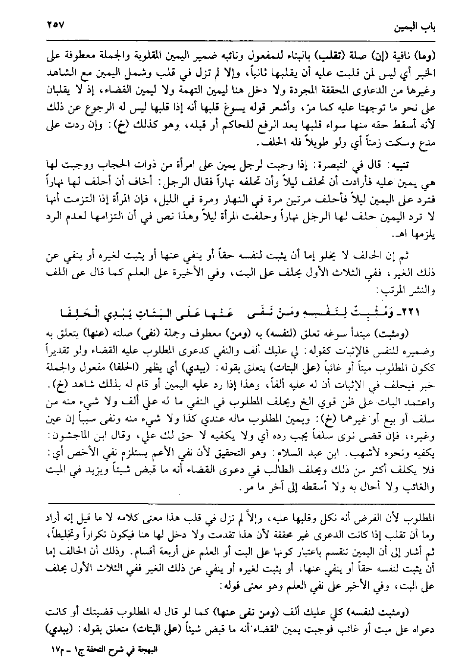 (وَمَا) نَافِيَة (إِن) صلَة (تقلب) بِالْبِنَاءِ للْمَفْعُول ونائبه ضمير الْيَمين المقلوبة وَالْجُمْلَة معطوفة على الْخَبَر أَي لَيْسَ لمن قلبت عَلَيْهِ أَن يقلبها ثَانِيًا، وَإِلَّا لم تزل فِي قلب وَشَمل الْيَمين مَعَ الشَّاهِد وَغَيرهَا من الدَّعَاوَى المحققة الْمُجَرَّدَة وَلَا دخل هُنَا ليمين التُّهْمَة وَلَا ليمين الْقَضَاء، إِذْ لَا يقلبان على نَحْو مَا توجهتا عَلَيْهِ كَمَا مرّ، وأشعر قَوْله يسوغ قَلبهَا أَنه إِذا قَلبهَا لَيْسَ لَهُ الرُّجُوع عَن ذَلِك لِأَنَّهُ أسقط حَقه مِنْهَا سَوَاء قَلبهَا بعد الرّفْع للْحَاكِم أَو قبله، وَهُوَ كَذَلِك (خَ) : وَإِن ردَّتْ على مُدع وَسكت زَمنا أَي وَلَو طَويلا فَلهُ الْحلف. تَنْبِيه: قَالَ فِي التَّبْصِرَة: إِذا وَجَبت لرجل يَمِين على امْرَأَة من ذَوَات الْحجاب وَوَجَبَت لَهَا هِيَ يَمِين عَلَيْهِ فَأَرَادَتْ أَن تحلف لَيْلًا وَأَن تحلفه نَهَارا فَقَالَ الرجل: أَخَاف أَن أَحْلف لَهَا نَهَارا فَترد على الْيَمين لَيْلًا فأحلف مرَّتَيْنِ مرّة فِي النَّهَار وَمرَّة فِي اللَّيْل، فَإِن الْمَرْأَة إِذا التزمت أَنَّهَا لَا ترد الْيَمين حلف لَهَا الرجل نَهَارا وَحلفت الْمَرْأَة لَيْلًا وَهَذَا نَص فِي أَن التزامها لعدم الرَّد يلْزمهَا اه. ثمَّ إِن الْحَالِف لَا يَخْلُو إِمَّا أَن يثبت لنَفسِهِ حَقًا أَو يَنْفِي عَنْهَا أَو يثبت لغيره أَو يَنْفِي عَن ذَلِك الْغَيْر، فَفِي الثَّلَاث الأول يحلف على الْبَتّ، وَفِي الْأَخِيرَة على الْعلم كَمَا قَالَ على اللف والنشر الْمُرَتّب: وَمُثْبِتٌ لِنَفْسِهِ ومَنْ نَفَى عَنْها عَلَى البَتَاتِ يُبْدِي الْحَلِفَا (ومثبت) مُبْتَدأ سوغه تعلق (لنَفسِهِ) بِهِ (وَمن) مَعْطُوف وَجُمْلَة (نفى) صلته (عَنْهَا) يتَعَلَّق بِهِ وضميره للنَّفس فالإثبات كَقَوْلِه: لي عَلَيْك ألف وَالنَّفْي كدعوى الْمَطْلُوب عَلَيْهِ الْقَضَاء وَلَو تَقْديرا ككون الْمَطْلُوب مَيتا أَو غَائِبا (على الْبَتَات) يتَعَلَّق بقوله: (يُبْدِي) أَي يظْهر (الحلفا) مفعول وَالْجُمْلَة خبر فَيحلف فِي الْإِثْبَات أَن لَهُ عَلَيْهِ ألفا، وَهَذَا إِذا رد عَلَيْهِ الْيَمين أَو قَامَ لَهُ بذلك شَاهد (خَ) . وَاعْتمد البات على ظن قوي الخ وَيحلف الْمَطْلُوب فِي النَّفْي مَا لَهُ عَليّ ألف وَلَا شَيْء مِنْهُ من سلف أَو بيع أَو غَيرهمَا (خَ) : وَيَمِين الْمَطْلُوب مَاله عِنْدِي كَذَا وَلَا شَيْء مِنْهُ وَنفى سَببا إِن عين وَغَيره، فَإِن قضى نوى سلفا يجب رده أَي وَلَا يَكْفِيهِ لَا حق لَك عَليّ، وَقَالَ ابْن الْمَاجشون: يَكْفِيهِ وَنَحْوه لأَشْهَب. ابْن عبد السَّلَام: وَهُوَ التَّحْقِيق لِأَن نفي الْأَعَمّ يسْتَلْزم نفي الْأَخَص أَي: فَلَا يُكَلف أَكثر من ذَلِك وَيحلف الطَّالِب فِي دَعْوَى الْقَضَاء أَنه مَا قبض شَيْئا وَيزِيد فِي الْمَيِّت وَالْغَائِب وَلَا أحَال بِهِ وَلَا أسْقطه إِلَى آخر مَا مر.