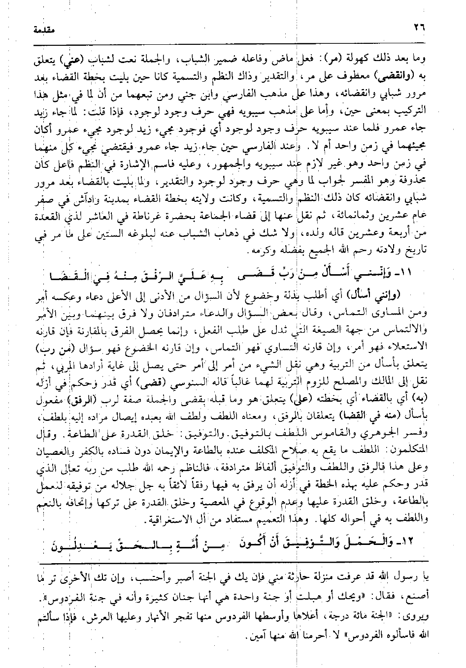 وَمَا بعد ذَلِك كهولة (مر) : فعل مَاض وفاعله ضمير الشَّبَاب، وَالْجُمْلَة نعت لشباب (عني) يتَعَلَّق بِهِ (وانقضى) مَعْطُوف على مر، وَالتَّقْدِير وَذَاكَ النّظم وَالتَّسْمِيَة كَانَا حِين بليت بخطة الْقَضَاء بعد مُرُور شَبَابِي وانقضائه، وَهَذَا على مَذْهَب الْفَارِسِي وَابْن جني وَمن تبعهما من أَن لما فِي مثل هَذَا التَّرْكِيب بِمَعْنى حِين، وَأما على مَذْهَب سِيبَوَيْهٍ فَهِيَ حرف وجود لوُجُود، فَإِذا قلت: لما جَاءَ زيد جَاءَ عَمْرو فَلَمَّا عِنْد سِيبَوَيْهٍ حرف وجود لوُجُود أَي فوجود مَجِيء زيد لوُجُود مَجِيء عَمْرو أَكَانَ مجيئهما فِي زمن وَاحِد أم لَا. وَعند الْفَارِسِي حِين جَاءَ زيد جَاءَ عَمْرو فَيَقْتَضِي مَجِيء كل مِنْهُمَا فِي زمن وَاحِد وَهُوَ غير لَازم عِنْد سِيبَوَيْهٍ وَالْجُمْهُور، وَعَلِيهِ فاسم الْإِشَارَة فِي النّظم فَاعل كَانَ محذوفة وَهُوَ الْمُفَسّر لجواب لما وَهِي حرف وجود لوُجُود وَالتَّقْدِير، وَلما بليت بِالْقضَاءِ بعد مُرُور شَبَابِي وانقضائه كَانَ ذَلِك النّظم وَالتَّسْمِيَة، وَكَانَت ولَايَته بخطة الْقَضَاء بِمَدِينَة وادآش فِي صفر عَام عشْرين وَثَمَانمِائَة، ثمَّ نقل عَنْهَا إِلَى قَضَاء الْجَمَاعَة بِحَضْرَة غرناطة فِي الْعَاشِر لذِي الْقعدَة من أَرْبَعَة وَعشْرين قَالَه وَلَده، وَلَا شكّ فِي ذهَاب الشَّبَاب عَنهُ لبلوغه السِّتين على مَا مر فِي تَارِيخ وِلَادَته رحم الله الْجَمِيع بفضله وَكَرمه. وَإنّني أَسْأَلْ مِنْ رَبَ قَضَى بِهِ عَلَيَّ الرِّفْقَ مِنْهُ فِي الْقَضَا (وإنني أسأَل) أَي أطلب بذلة وخضوع لِأَن السُّؤَال من الْأَدْنَى إِلَى الْأَعْلَى دُعَاء وَعَكسه أَمر وَمن المساوى التمَاس، وَقَالَ بعض السُّؤَال وَالدُّعَاء مُتَرَادِفَانِ وَلَا فرق بَينهمَا وَبَين الْأَمر والالتماس من جِهَة الصِّيغَة الَّتِي تدل على طلب الْفِعْل، وَإِنَّمَا يحصل الْفرق بالمقارنة فَإِن قارنه الاستعلاء فَهُوَ أَمر، وَإِن قارنه التَّسَاوِي فَهُوَ التمَاس، وَإِن قارنه الخضوع فَهُوَ سُؤال (من رب) يتَعَلَّق بأسأل من التربية وَهِي نقل الشَّيْء من أَمر إِلَى أَمر حَتَّى يصل إِلَى غَايَة أرادها المربي، ثمَّ نقل إِلَى الْمَالِك والمصلح للُزُوم التربية لَهما غَالِبا قَالَه السنوسي (قضى) أَي قدر وَحكم فِي أزله (بِهِ) أَي بِالْقضَاءِ أَي بخطته (على) يتَعَلَّق هُوَ وَمَا قبله بقضى وَالْجُمْلَة صفة لرب (الرِّفْق) مفعول بأسأل (مِنْهُ فِي القضا) يتعلقان بالرفق، وَمَعْنَاهُ اللطف ولطف الله بِعَبْدِهِ إِيصَال مُرَاده إِلَيْهِ بلطف، وَفسّر الْجَوْهَرِي والقاموس اللطف بالتوفيق. والتوفيق: خلق الْقُدْرَة على الطَّاعَة. وَقَالَ المتكلمون: اللطف مَا يَقع بِهِ صَلَاح الْمُكَلف عِنْده بِالطَّاعَةِ وَالْإِيمَان دون فَسَاده بالْكفْر والعصيان وعَلى هَذَا فالرفق واللطف والتوفيق أَلْفَاظ مترادفة، فالناظم رَحمَه الله طلب من ربه تَعَالَى الَّذِي قدر وَحكم عَلَيْهِ بِهَذِهِ الخطة فِي أزله أَن يرفق بِهِ فِيهَا رفقا لائقاً بِهِ جلّ جَلَاله من توفيقه للْعَمَل بِالطَّاعَةِ، وَخلق الْقُدْرَة عَلَيْهَا وَعدم الْوُقُوع فِي الْمعْصِيَة وَخلق الْقُدْرَة على تَركهَا وإتحافه بِالنعَم واللطف بِهِ فِي أَحْوَاله كلهَا. وَهَذَا التَّعْمِيم مُسْتَفَاد من أل الاستغراقية. وَالْحَمْلَ وَالتَّوْفِيقَ أَنْ أَكُونَ مِنْ أُمَّةٍ بِالحَقِّ يَعْدِلُونَ
