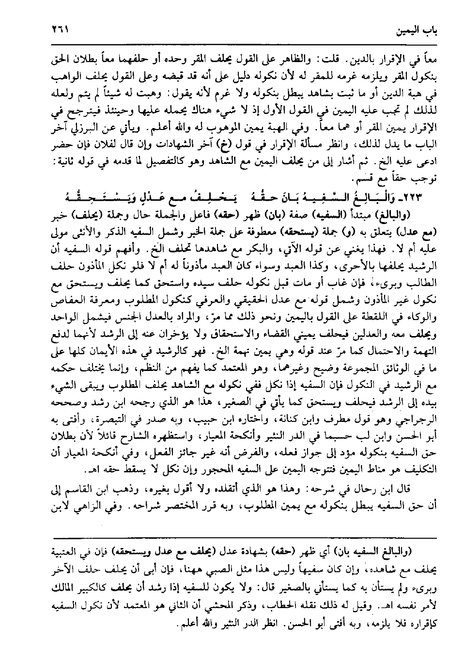 مَعًا فِي الْإِقْرَار بِالدّينِ. قلت: وَالظَّاهِر على القَوْل يحلف الْمقر وَحده أَو حلفهما مَعًا بطلَان الْحق بنكول الْمقر وَيلْزمهُ غرمه للْمقر لَهُ لِأَن نُكُوله دَلِيل على أَنه قد قَبضه وعَلى القَوْل يحلف الْوَاهِب فِي هبة الدّين أَو مَا ثَبت بِشَاهِد يبطل بِنُكُولِهِ وَلَا غرم لِأَنَّهُ يَقُول: وهبت لَهُ شَيْئا لم يتم وَلَعَلَّه لذَلِك لم تجب عَلَيْهِ الْيَمين فِي القَوْل الأول إِذْ لَا شَيْء هُنَاكَ يحملهُ عَلَيْهَا وَحِينَئِذٍ فيترجح فِي الْإِقْرَار يَمِين الْمقر أَو هما مَعًا. وَفِي الْهِبَة يَمِين الْمَوْهُوب لَهُ وَالله أعلم. وَيَأْتِي عَن الْبُرْزُليّ آخر الْبَاب مَا يدل لذَلِك، وَانْظُر مَسْأَلَة الْإِقْرَار فِي قَول (خَ) آخر الشَّهَادَات وَإِن قَالَ لفُلَان فَإِن حضر ادّعى عَلَيْهِ الخ. ثمَّ أَشَارَ إِلَى من يحلف الْيَمين مَعَ الشَّاهِد وَهُوَ كالتفصيل لما قدمه فِي قَوْله ثَانِيَة: توجب حَقًا مَعَ قسم. وَالْبَالِغُ السَّفِيهُ بَانَ حقُّهُ يَحْلِفُ مَعَ عَدْلٍ وَيَسْتَحِقُّهُ (والبالغ) مُبْتَدأ (السَّفِيه) صفة (بَان) ظهر (حَقه) فَاعل وَالْجُمْلَة حَال وَجُمْلَة (يحلف) خبر (مَعَ عدل) يتَعَلَّق بِهِ (و) جملَة (يسْتَحقّهُ) معطوفة على جملَة الْخَبَر وَشَمل السَّفِيه الذّكر وَالْأُنْثَى مولى عَلَيْهِ أم لَا. فَهَذَا يُغني عَن قَوْله الْآتِي، وَالْبكْر مَعَ شَاهدهَا تحلف الخ. وَأفهم قَوْله السَّفِيه أَن الرشيد يحلفها بالأحرى، وَكَذَا العَبْد وَسَوَاء كَانَ العَبْد مَأْذُونا لَهُ أم لَا فَلَو نكل الْمَأْذُون حلف الطَّالِب وبرىء، فَإِن غَابَ أَو مَاتَ قبل نُكُوله حلف سَيّده وَاسْتحق كَمَا يحلف وَيسْتَحق مَعَ نُكُول غير الْمَأْذُون وَشَمل قَوْله مَعَ عدل الْحَقِيقِيّ والعرفي كنكول الْمَطْلُوب وَمَعْرِفَة العفاص والوكاء فِي اللّقطَة على القَوْل بِالْيَمِينِ وَنَحْو ذَلِك مِمَّا مرّ، وَالْمرَاد بِالْعَدْلِ الْجِنْس فَيشْمَل الْوَاحِد وَيحلف مَعَه والعدلين فَيحلف يَمِيني الْقَضَاء والاستحقاق وَلَا يؤخران عَنهُ إِلَى الرشد لِأَنَّهُمَا لدفع التُّهْمَة وَالِاحْتِمَال كَمَا مرّ عِنْد قَوْله وَهِي يَمِين تُهْمَة الخ. فَهُوَ كالرشيد فِي هَذِه الْأَيْمَان كلهَا على مَا فِي الوثائق الْمَجْمُوعَة وضيح وَغَيرهمَا، وَهُوَ الْمُعْتَمد كَمَا يفهم من النّظم وَإِنَّمَا يخْتَلف حكمه مَعَ الرشيد فِي النّكُول فَإِن السَّفِيه إِذا نكل فَفِي نُكُوله مَعَ الشَّاهِد يحلف الْمَطْلُوب وَيبقى الشَّيْء بِيَدِهِ إِلَى الرشد فَيحلف وَيسْتَحق كَمَا يَأْتِي فِي الصَّغِير، هَذَا هُوَ الَّذِي رَجحه ابْن رشد وَصَححهُ الرجراجي وَهُوَ قَول مطرف وَابْن كنَانَة، وَاخْتَارَهُ ابْن حبيب، وَبِه صدر فِي التَّبْصِرَة، وَأفْتى بِهِ أَبُو الْحسن وَابْن لب حَسْبَمَا فِي الدّرّ النثير وأنكحة المعيار، واستظهره الشَّارِح قَائِلا لِأَن بطلَان حق السَّفِيه بِنُكُولِهِ مؤد إِلَى جَوَاز فعله، وَالْفَرْض أَنه غير جَائِز الْفِعْل، وَفِي أنكحة المعيار أَن التَّكْلِيف هُوَ منَاط الْيَمين فتتوجه الْيَمين على السَّفِيه الْمَحْجُور وَإِن نكل لَا يسْقط حَقه اه. قَالَ ابْن رحال فِي شَرحه: وَهَذَا هُوَ الَّذِي أتقلده وَلَا أَقُول بِغَيْرِهِ، وَذهب ابْن الْقَاسِم إِلَى أَن حق السَّفِيه يبطل بِنُكُولِهِ مَعَ يَمِين الْمَطْلُوب، وَبِه قرر الْمُخْتَصر شراحه. وَفِي الزاهي لِابْنِ