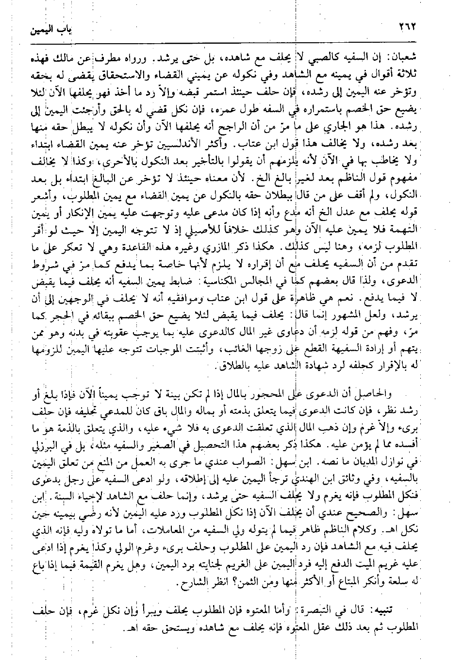 شعْبَان: إِن السَّفِيه كَالصَّبِيِّ لَا يحلف مَعَ شَاهده، بل حَتَّى يرشد. وَرَوَاهُ مطرف عَن مَالك فَهَذِهِ ثَلَاثَة أَقْوَال فِي يَمِينه مَعَ الشَّاهِد وَفِي نُكُوله عَن يَمِيني الْقَضَاء والاستحقاق يقْضى لَهُ بِحقِّهِ وتؤخر عَنهُ الْيَمين إِلَى رشده، فَإِن حلف حِينَئِذٍ اسْتمرّ قَبضه وإلاّ رد مَا أَخذ فَهُوَ يحلفها الْآن لِئَلَّا يضيع حق الْخصم باستمراره فِي السَّفه طول عمره، فَإِن نكل قضي لَهُ بِالْحَقِّ وأرجئت الْيَمين إِلَى رشده. هَذَا هُوَ الْجَارِي على مَا مرّ من أَن الرَّاجِح أَنه يحلفها الْآن وَأَن نُكُوله لَا يبطل حَقه مِنْهَا بعد رشده، وَلَا يُخَالف هَذَا قَول ابْن عتاب. وَأكْثر الأندلسيين تُؤخر عَنهُ يَمِين الْقَضَاء ابْتِدَاء وَلَا يُخَاطب بهَا فِي الْآن لِأَنَّهُ يلْزمهُم أَن يَقُولُوا بِالتَّأْخِيرِ بعد النّكُول بالأحرى، وَكَذَا لَا يُخَالف مَفْهُوم قَول النَّاظِم بعد لغير بَالغ الخ. لِأَن مَعْنَاهُ حِينَئِذٍ لَا تُؤخر عَن الْبَالِغ ابْتِدَاء بل بعد النّكُول، وَلم أَقف على من قَالَ بِبُطْلَان حَقه بِالنّكُولِ عَن يَمِين الْقَضَاء مَعَ يَمِين الْمَطْلُوب، وأشعر قَوْله يحلف مَعَ عدل الخ أَنه مُدع وَأَنه إِذا كَانَ مدعى عَلَيْهِ وتوجهت عَلَيْهِ يَمِين الْإِنْكَار أَو يَمِين التُّهْمَة فَلَا يَمِين عَلَيْهِ الْآن وَهُوَ كَذَلِك خلافًا للأصيلي إِذْ لَا تتَوَجَّه الْيَمين إِلَّا حَيْثُ لَو أقرّ الْمَطْلُوب لزمَه، وَهنا لَيْسَ كَذَلِك. هَكَذَا ذكر الْمَازرِيّ وَغَيره هَذِه الْقَاعِدَة وَهِي لَا تعكر على مَا تقدم من أَن السَّفِيه يحلف مَعَ أَن إِقْرَاره لَا يلْزم لِأَنَّهَا خَاصَّة بِمَا يدْفع كَمَا مرّ فِي شُرُوط الدَّعْوَى، وَلذَا قَالَ بَعضهم كَمَا فِي الْمجَالِس المكناسية: ضَابِط يَمِين السَّفِيه أَنه يحلف فِيمَا يقبض لَا فِيمَا يدْفع. نعم هِيَ ظَاهِرَة على قَول ابْن عتاب وموافقيه أَنه لَا يحلف فِي الْوَجْهَيْنِ إِلَى أَن يرشد، وَلَعَلَّ الْمَشْهُور إِنَّمَا قَالَ: يحلف فِيمَا يقبض لِئَلَّا يضيع حق الْخصم بِبَقَائِهِ فِي الْحجر كَمَا مرّ، وَفهم من قَوْله لزمَه أَن دعاوى غير المَال كالدعوى عَلَيْهِ بِمَا يُوجب عُقُوبَته فِي بدنه وَهُوَ مِمَّن يتهم أَو إِرَادَة السفيهة الْقطع على زَوجهَا الْغَائِب، وأثبتت الموجبات تتَوَجَّه عَلَيْهَا الْيَمين للزومها لَهُ بِالْإِقْرَارِ كحلفه لرد شَهَادَة الشَّاهِد عَلَيْهِ بِالطَّلَاق. وَالْحَاصِل أَن الدَّعْوَى على الْمَحْجُور بِالْمَالِ إِذا لم تكن بَيِّنَة لَا توجب يَمِينا الْآن فَإِذا بلغ أَو رشد نظر، فَإِن كَانَت الدَّعْوَى فِيمَا يتَعَلَّق بِذِمَّتِهِ أَو بِمَالِه وَالْمَال بَاقٍ كَانَ للْمُدَّعِي تَحْلِيفه فَإِن حلف برىء وإلاّ غرم وَإِن ذهب المَال الَّذِي تعلّقت الدَّعْوَى بِهِ فَلَا شَيْء عَلَيْهِ، وَالَّذِي يتَعَلَّق بِالذِّمةِ هُوَ مَا أفْسدهُ مِمَّا لم يُؤمن عَلَيْهِ. هَكَذَا ذكر بَعضهم هَذَا التَّحْصِيل فِي الصَّغِير وَالسَّفِيه مثله، بل فِي الْبُرْزُليّ فِي نَوَازِل الْمديَان مَا نَصه. ابْن سهل: الصَّوَاب عِنْدِي مَا جرى بِهِ الْعَمَل من الْمَنْع من تعلق الْيَمين بالسفيه، وَفِي وثائق ابْن الْهِنْدِيّ ترجأ الْيَمين عَلَيْهِ إِلَى إِطْلَاقه، وَلَو ادّعى السَّفِيه على رجل بِدَعْوَى فنكل الْمَطْلُوب فَإِنَّهُ يغرم وَلَا يحلف السَّفِيه حَتَّى يرشد، وَإِنَّمَا حلف مَعَ الشَّاهِد لإحياء السّنة. ابْن سهل: وَالصَّحِيح عِنْدِي أَن يحلف الْآن إِذا نكل الْمَطْلُوب ورد عَلَيْهِ الْيَمين لِأَنَّهُ رَضِي بِيَمِينِهِ حِين نكل اه. وَكَلَام النَّاظِم ظَاهر فِيمَا لم يتوله ولي السَّفِيه من الْمُعَامَلَات أما مَا تولاه وليه فَإِنَّهُ الَّذِي يحلف فِيهِ مَعَ الشَّاهِد فَإِن رد الْيَمين على الْمَطْلُوب وَحلف برىء وَغرم الْوَلِيّ وَكَذَا يغرم إِذا ادّعى 