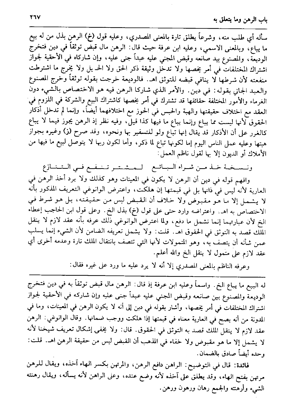 سَأَلَهُ أَي طلب مِنْهُ، وَشرعا يُطلق تَارَة بِالْمَعْنَى المصدري، وَعَلِيهِ قَول (خَ) الرَّهْن بذل من لَهُ بيع مَا يُبَاع، وبالمعنى الاسمي، وَعَلِيهِ ابْن عَرَفَة حَيْثُ قَالَ: الرَّهْن مَال قبض توثقاً فِي دين فَتخرج الْوَدِيعَة، والمصنوع بيد صانعه وَقبض الْمَجْنِي عَلَيْهِ عبدا جنى عَلَيْهِ، وَإِن شاركاه فِي الأحقية لجَوَاز اشْتِرَاك المختلفات فِي أَمر يَخُصهَا وَلَا تدخل وَثِيقَة ذكر الْحق وَلَا الْحميل وَلَا يخرج مَا اشْترطت منفعَته لِأَن شَرطهَا لَا يُنَافِي قَبضه للتوثق اه. فالوديعة خرجت بقوله توثقاً وَخرج الْمَصْنُوع وَالْعَبْد الْجَانِي بقوله: فِي دين. وَالْأَمر الَّذِي شاركا الرَّهْن فِيهِ هُوَ الِاخْتِصَاص بالشَّيْء دون الْغُرَمَاء والأمور الْمُخْتَلفَة حقائقها قد تشترك فِي أَمر يَخُصهَا كاشتراك البيع وَالشَّرِكَة فِي اللُّزُوم فِي العقد مَعَ اخْتِلَاف حَقِيقَتهَا وَالْهِبَة وَالْحَبْس فِي الْحَوْز مَعَ اخْتِلَافهمَا أَيْضا، وَإِنَّمَا لم تدخل أذكار الْحُقُوق لِأَنَّهَا لَيست مِمَّا يُبَاع وَإِنَّمَا يُبَاع مَا فِيهَا كَذَا قيل، وَفِيه نظر إِذْ الرَّهْن يجوز فِيمَا لَا يُبَاع كالغرر على أَن الْأَذْكَار قد يُقَال إِنَّهَا تبَاع وَلَو للتسفير بهَا وَنَحْوه، وَقد صرح (ز) وَغَيره بِجَوَاز هبتها وَعَلِيهِ عمل النَّاس الْيَوْم إِمَّا لكَونهَا تبَاع لما ذكر، وَأما لكَون رَبهَا لَا يتَوَصَّل لبيع مَا فِيهَا من الْأَمْلَاك أَو الدُّيُون إِلَّا بهَا لقَوْل ناظم الْعَمَل: ونسخة خُذ من شِرَاء البَائِع لمشتر تَنْفَع فِي التَّنَازُع وافهم قَوْله فِي دين أَن الرَّهْن لَا يكون فِي المعينات وَهُوَ كَذَلِك وَلَا يرد أَخذ الرَّهْن فِي الْعَارِية لِأَنَّهُ لَيْسَ فِي ذَاتهَا بل فِي قيمتهَا إِن هَلَكت، وَاعْترض الوانوغي التَّعْرِيف الْمَذْكُور بِأَنَّهُ لَا يَشْمَل إِلَّا مَا هُوَ مَقْبُوض وَلَا خلاف أَن الْقَبْض لَيْسَ من حَقِيقَته، بل هُوَ شَرط فِي الِاخْتِصَاص بِهِ اه. واعتراضه وَارِد حَتَّى على قَول (خَ) بذل الخ. وعَلى قَول ابْن الْحَاجِب إِعْطَاء الخ لِأَن عبارتهما إِنَّمَا تَشْمَل مَا دفع، وَلما اعْترض الوانوغي ذَلِك عرفه بِأَنَّهُ عقد لَازم لَا ينْقل الْملك قصد بِهِ التَّوَثُّق فِي الْحُقُوق اه. قلت: وَلَا يَشْمَل تَعْرِيفه الضَّامِن لِأَن الشَّيْء إِنَّمَا يسلب عَمَّن شَأْنه أَن يَتَّصِف بِهِ، وَهُوَ المتمولات لِأَنَّهَا الَّتِي تتصف بانتقال الْملك تَارَة وَعَدَمه أُخْرَى أَي عقد لَازم على مُتَمَوّل لَا ينْقل الخ وَالله أعلم. وعرفه النَّاظِم بِالْمَعْنَى المصدري إِلَّا أَنه لَا يرد عَلَيْهِ مَا ورد على غَيره فَقَالَ: