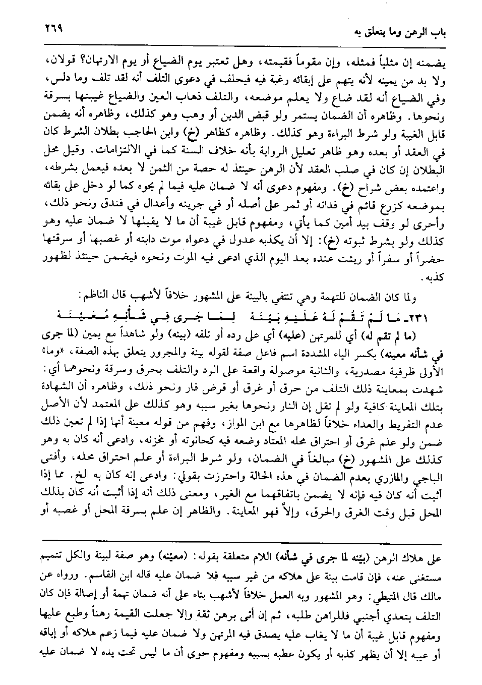 يضمنهُ إِن مثلِيا فَمثله، وَإِن مُقَومًا فَقيمته، وَهل تعْتَبر يَوْم الضّيَاع أَو يَوْم الارتهان؟ قَولَانِ، وَلَا بُد من يَمِينه لِأَنَّهُ يتهم على إبقائه رَغْبَة فِيهِ فَيحلف فِي دَعْوَى التّلف أَنه لقد تلف وَمَا دلّس، وَفِي الضّيَاع أَنه لقد ضَاعَ وَلَا يعلم مَوْضِعه، والتلف ذهَاب الْعين والضياع غيبتها بِسَرِقَة وَنَحْوهَا. وَظَاهره أَن الضَّمَان يسْتَمر وَلَو قبض الدّين أَو وهب وَهُوَ كَذَلِك، وَظَاهره أَنه يضمن قَابل الْغَيْبَة وَلَو شَرط الْبَرَاءَة وَهُوَ كَذَلِك. وَظَاهره كظاهر (خَ) وَابْن الْحَاجِب بطلَان الشَّرْط كَانَ فِي العقد أَو بعده وَهُوَ ظَاهر تَعْلِيل الرِّوَايَة بِأَنَّهُ خلاف السّنة كَمَا فِي الالتزامات. وَقيل مَحل الْبطلَان إِن كَانَ فِي صلب العقد لِأَن الرَّهْن حِينَئِذٍ لَهُ حِصَّة من الثّمن لَا بعده فَيعْمل بِشَرْطِهِ، وَاعْتَمدهُ بعض شرَّاح (خَ) . وَمَفْهُوم دَعْوَى أَنه لَا ضَمَان عَلَيْهِ فِيمَا لم يحوه كَمَا لَو دخل على بَقَائِهِ بموضعه كزرع قَائِم فِي فدانه أَو ثَمَر على أَصله أَو فِي جرينه وأعدال فِي فندق وَنَحْو ذَلِك، وَأَحْرَى لَو وقف بيد أَمِين كَمَا يَأْتِي، وَمَفْهُوم قَابل غيبَة أَن مَا لَا يقبلهَا لَا ضَمَان عَلَيْهِ وَهُوَ كَذَلِك وَلَو بِشَرْط ثُبُوته (خَ) : إِلَّا أَن يكذبهُ عدُول فِي دَعْوَاهُ موت دَابَّته أَو غصبهَا أَو سرقتها حضرا أَو سفرا أَو ريئت عِنْده بعد الْيَوْم الَّذِي ادّعى فِيهِ الْمَوْت وَنَحْوه فَيضمن حِينَئِذٍ لظُهُور كذبه. وَلما كَانَ الضَّمَان للتُّهمَةِ وَهِي تَنْتفِي بِالْبَيِّنَةِ على الْمَشْهُور خلافًا لأَشْهَب قَالَ النَّاظِم: مَا لَمْ تَقُمْ لَهُ عَلَيْهِ بَيِّنَهْ لِمَا جَرى فِي شَأْنِهِ مُعَيِّنَهْ (مَا لم تقم لَهُ) أَي للْمُرْتَهن (عَلَيْهِ) أَي على رده أَو تلفه (بَينه) وَلَو شَاهدا مَعَ يَمِين (لما جرى فِي شَأْنه معينه) بِكَسْر الْيَاء الْمُشَدّدَة اسْم فَاعل صفة لقَوْله بَيِّنَة وَالْمَجْرُور يتَعَلَّق بِهَذِهِ الصّفة، (وَمَا) الأولى ظرفية مَصْدَرِيَّة، وَالثَّانيَِة مَوْصُولَة وَاقعَة على الرَّد والتلف بحرق وسرقة وَنَحْوهمَا أَي: شهِدت بمعاينة ذَلِك التّلف من حرق أَو غرق أَو قرض فار وَنَحْو ذَلِك، وَظَاهره أَن الشَّهَادَة بِتِلْكَ المعاينة كَافِيَة وَلَو لم تقل إِن النَّار وَنَحْوهَا بِغَيْر سَببه وَهُوَ كَذَلِك على الْمُعْتَمد لِأَن الأَصْل عدم التَّفْرِيط والعداء خلافًا لظاهرها مَعَ ابْن الْمَوَّاز وَفهم من قَوْله مُعينَة أَنَّهَا إِذا لم تعين ذَلِك ضمن وَلَو علم غرق أَو احتراق مَحَله الْمُعْتَاد وَضعه فِيهِ كحانوته أَو مخزنه، وَادّعى أَنه كَانَ بِهِ وَهُوَ كَذَلِك على الْمَشْهُور (خَ) مبالغاً فِي الضَّمَان، وَلَو شَرط الْبَرَاءَة أَو علم احتراق مَحَله، وَأفْتى الْبَاجِيّ والمازري بِعَدَمِ الضَّمَان فِي هَذِه الْحَالة واحترزت بِقَوْلِي: وَادّعى إِنَّه كَانَ بِهِ الخ. مِمَّا إِذا أثبت أَنه كَانَ فِيهِ فَإِنَّهُ لَا يضمن باتفاقهما مَعَ الْغَيْر، وَمعنى ذَلِك أَنه إِذا أثبت أَنه كَانَ بذلك الْمحل قبل وَقت الْغَرق والحرق، وإلاَّ فَهُوَ المعاينة. وَالظَّاهِر إِن علم بِسَرِقَة الْمحل أَو غصبه أَو