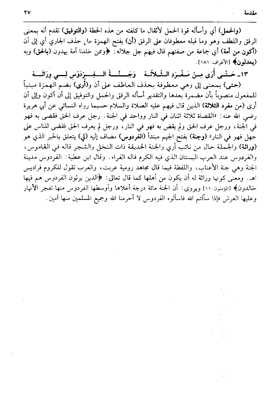 (وَالْحمل) أَي وأسأله قُوَّة الْحمل لأثقال مَا كلفته من هَذِه الخطة (والتوفيق) تقدم أَنه بِمَعْنى الرِّفْق واللطف وَهُوَ وَمَا قبله معطوفان على الرِّفْق (أَن) بِفَتْح الْهمزَة على حذف الْجَارِي أَي إِلَى أَن (أكون من أمة) أَي جمَاعَة من صفتهمْ قَالَ فيهم جلّ جَلَاله: وَمِمَّنْ خلقنَا أمة يهْدُونَ (بِالْحَقِّ) وَبِه (يعدلُونَ} (الآعراف: 181) . حَتَّى أُرَى مِنْ مَفْرَدِ الثَّلاَثَهْ وَجَنَّةُ الفِرْدَوْسِ لِي وِرَاثَهْ (حَتَّى) بِمَعْنى إِلَى وَهِي معطوفة بِحَذْف العاطف على أَن و (أُرى) بِضَم الْهمزَة مَبْنِيا للْمَفْعُول مَنْصُوبًا بِأَن مضمرة بعْدهَا وَالتَّقْدِير أسأله الرِّفْق وَالْحمل والتوفيق إِلَى أَن أكون وَإِلَى أَن أرى (من مُفْرد الثَّلَاثَة) الَّذين قَالَ فيهم عَلَيْهِ الصَّلَاة وَالسَّلَام حَسْبَمَا رَوَاهُ النَّسَائِيّ عَن أبي هُرَيْرَة رَضِي الله عَنهُ: (الْقُضَاة ثَلَاثَة اثْنَان فِي النَّار وَوَاحِد فِي الْجنَّة. رجل عرف الْحق فَقضى بِهِ فَهُوَ فِي الْجنَّة، وَرجل عرف الْحق وَلم يقْض بِهِ فَهُوَ فِي النَّار، وَرجل لم يعرف الْحق فَقضى للنَّاس على جهل فَهُوَ فِي النَّار) (وجنة) بِفَتْح الْجِيم مُبْتَدأ (الفردوس) مُضَاف إِلَيْهِ (لي) يتَعَلَّق بالْخبر الَّذِي هُوَ (وراثة) وَالْجُمْلَة حَال من نَائِب أرِي وَالْجنَّة الحديقة ذَات النّخل وَالشَّجر قَالَه فِي الْقَامُوس، والفردوس عِنْد الْعَرَب الْبُسْتَان الَّذِي فِيهِ الْكَرم قَالَه الْفراء. وَقَالَ ابْن عَطِيَّة: الفردوس مَدِينَة الْجنَّة وَهِي جنَّة الأعناب، واللفظة فِيمَا قَالَ مُجَاهِد رُومِية عربت، وَالْعرب تَقول للكروم فراديس اه. وَمعنى كَونهَا وراثة لَهُ أَن يكون من أَهلهَا كَمَا قَالَ تَعَالَى: الَّذين يَرِثُونَ الفردوس هم فِيهَا خَالدُونَ} (الْمُؤْمِنُونَ: 11) ويروى: أَن الْجنَّة مائَة دَرَجَة أَعْلَاهَا وأوسطها الفردوس مِنْهَا تفجر الْأَنْهَار وَعَلَيْهَا الْعَرْش فَإِذا سَأَلْتُم الله فَاسْأَلُوهُ الفردوس لَا أحرمنا الله وَجَمِيع الْمُسلمين مِنْهَا آمين.