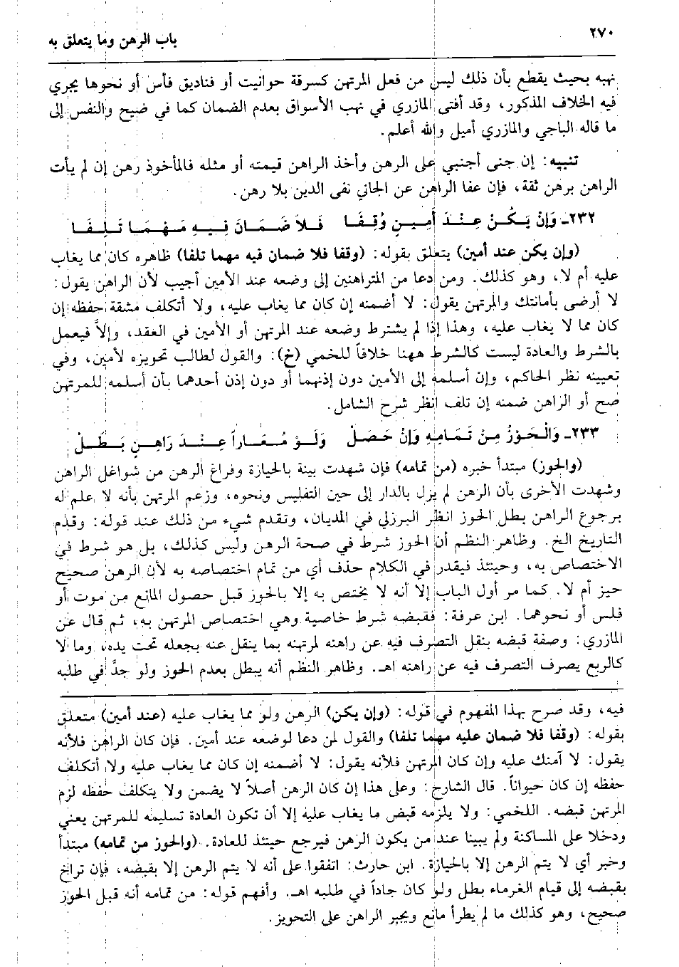 نهبه بِحَيْثُ يقطع بِأَن ذَلِك لَيْسَ من فعل الْمُرْتَهن كسرقة حوانيت أَو فناديق فأس أَو نَحْوهَا يجْرِي فِيهِ الْخلاف الْمَذْكُور، وَقد أفتى الْمَازرِيّ فِي نهب الْأَسْوَاق بِعَدَمِ الضَّمَان كَمَا فِي ضيح وَالنَّفس إِلَى مَا قَالَه الْبَاجِيّ والمازري أميل وَالله أعلم. تَنْبِيه: إِن جنى أَجْنَبِي على الرَّهْن وَأخذ الرَّاهِن قِيمَته أَو مثله فالمأخوذ رهن إِن لم يَأْتِ الرَّاهِن برهن ثِقَة، فَإِن عَفا الرَّاهِن عَن الْجَانِي نفى الدّين بِلَا رهن. وَإنْ يَكُنْ عِنْدَ أَمِينٍ وُقِفَا فَلاَ ضَمَانَ فِيهِ مَهْمَا تَلِفَا (وَإِن يكن عِنْد أَمِين) يتَعَلَّق بقوله: (وَقفا فَلَا ضَمَان فِيهِ مهما تلفا) ظَاهره كَانَ مِمَّا يُغَاب عَلَيْهِ أم لَا، وَهُوَ كَذَلِك. وَمن دَعَا من المتراهنين إِلَى وَضعه عِنْد الْأمين أُجِيب لِأَن الرَّاهِن يَقُول: لَا أرْضى بأمانتك وَالْمُرْتَهن يَقُول: لَا أضمنه إِن كَانَ مِمَّا يُغَاب عَلَيْهِ، وَلَا أتكلف مشقة حفظه إِن كَانَ مِمَّا لَا يُغَاب عَلَيْهِ، وَهَذَا إِذا لم يشْتَرط وَضعه عِنْد الْمُرْتَهن أَو الْأمين فِي العقد، وإلاَّ فَيعْمل بِالشّرطِ وَالْعَادَة لَيست كالشرط هَهُنَا خلافًا للخمي (خَ) : وَالْقَوْل لطَالب تحويزه لأمين، وَفِي تَعْيِينه نظر الْحَاكِم، وَإِن أسلمه إِلَى الْأمين دون إذنهما أَو دون إِذن أَحدهمَا بِأَن أسلمه للْمُرْتَهن صَحَّ أَو الرَّاهِن ضمنه إِن تلف انْظُر شرح الشَّامِل. وَالْحَوْزُ مِنْ تَمَامِهِ وَإنْ حَصَلْ وَلَوْ مُعَاراً عِنْدَ رَاهِنٍ بَطَلْ (والحوز) مُبْتَدأ خَبره (من تَمَامه) فَإِن شهِدت بَيِّنَة بالحيازة وفراغ الرَّهْن من شواغل الرَّاهِن وَشهِدت الْأُخْرَى بِأَن الرَّهْن لم يزل بِالدَّار إِلَى حِين التَّفْلِيس وَنَحْوه، وَزعم الْمُرْتَهن بِأَنَّهُ لَا علم لَهُ بِرُجُوع الرَّاهِن بَطل الْحَوْز انْظُر الْبُرْزُليّ فِي الْمديَان، وَتقدم شَيْء من ذَلِك عِنْد قَوْله: وَقدم التَّارِيخ الخ. وَظَاهر النّظم أَن الْحَوْز شَرط فِي صِحَة الرَّهْن وَلَيْسَ كَذَلِك، بل هُوَ شَرط فِي الِاخْتِصَاص بِهِ، وَحِينَئِذٍ فَيقدر فِي الْكَلَام حذف أَي من تَمام اخْتِصَاصه بِهِ لِأَن الرَّهْن صَحِيح حيّز أم لَا. كَمَا مر أول الْبَاب إِلَّا أَنه لَا يخْتَص بِهِ إِلَّا بالحوز قبل حُصُول الْمَانِع من موت أَو فلس أَو نَحْوهمَا. ابْن عَرَفَة: فَقَبضهُ شَرط خاصية وَهِي اخْتِصَاص الْمُرْتَهن بِهِ، ثمَّ قَالَ عَن الْمَازرِيّ: وَصفَة قَبضه بِنَقْل التَّصَرُّف فِيهِ عَن راهنه لمرتهنه بِمَا ينْقل عَنهُ بجعله تَحت يَده، وَمَا لَا كالربع يصرف التَّصَرُّف فِيهِ عَن راهنه اه. وَظَاهر النّظم أَنه يبطل بِعَدَمِ الْحَوْز وَلَو جدَّ فِي طلبه