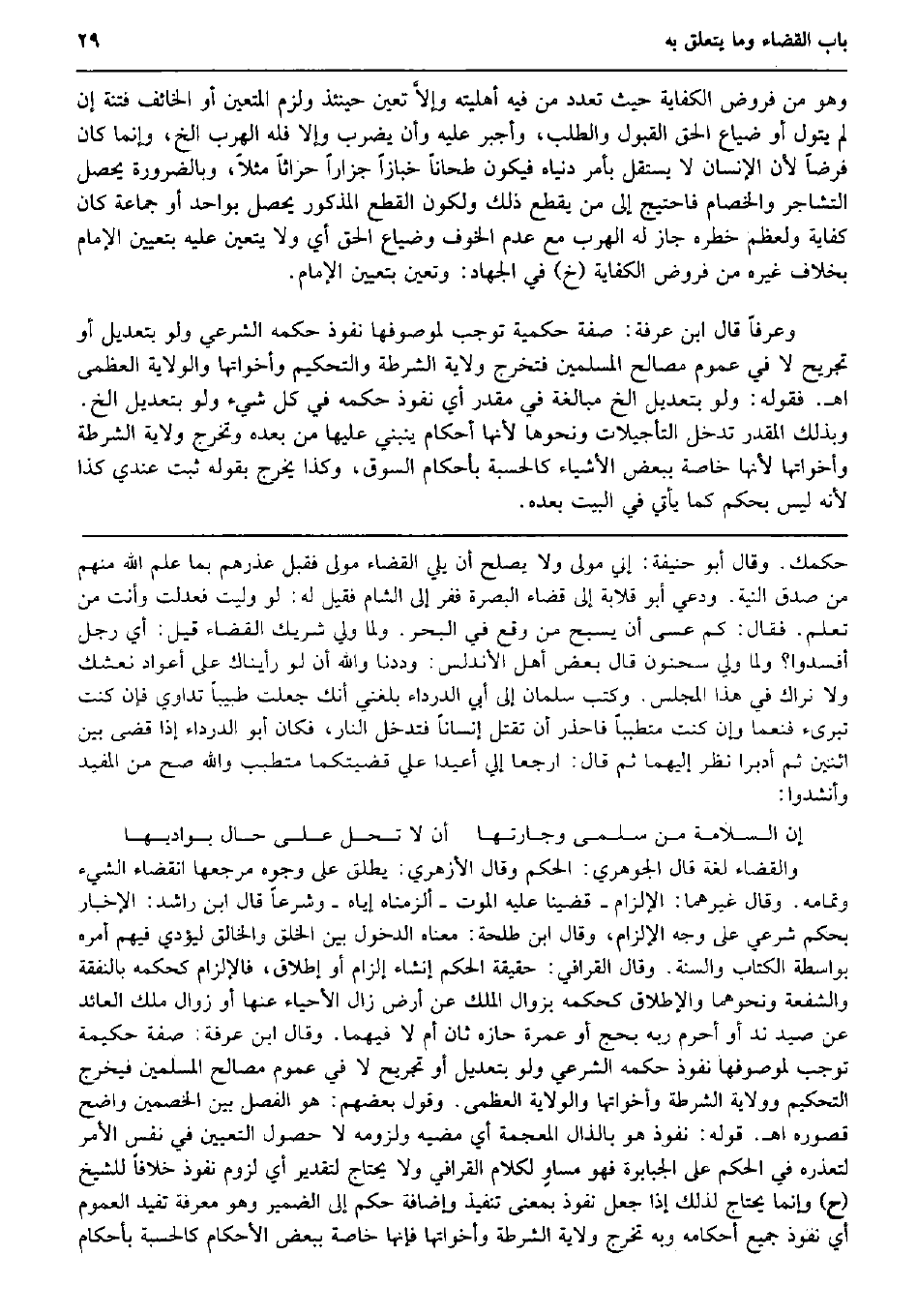 وَهُوَ من فروض الْكِفَايَة حَيْثُ تعدد من فِيهِ أَهْلِيَّته وإلاَّ تعين حِينَئِذٍ وَلزِمَ الْمُتَعَيّن أَو الْخَائِف فتْنَة إِن لم يتول أَو ضيَاع الْحق الْقبُول والطلب، وأجبر عَلَيْهِ وَأَن يضْرب وَإِلَّا فَلهُ الْهَرَب الخ، وَإِنَّمَا كَانَ فرضا لِأَن الْإِنْسَان لَا يسْتَقلّ بِأَمْر دُنْيَاهُ فَيكون طحاناً خبازاً جزاراً حراثاً مثلا، وبالضرورة يحصل التشاجر وَالْخِصَام فاحتيج إِلَى من يقطع ذَلِك وَلكَون الْقطع الْمَذْكُور يحصل بِوَاحِد أَو جمَاعَة كَانَ كِفَايَة ولعظم خطره جَازَ لَهُ الْهَرَب مَعَ عدم الْخَوْف وضياع الْحق أَي وَلَا يتَعَيَّن عَلَيْهِ بِتَعْيِين الإِمَام بِخِلَاف غَيره من فروض الْكِفَايَة (خَ) فِي الْجِهَاد: وَتعين بِتَعْيِين الإِمَام. وَعرفا قَالَ ابْن عَرَفَة: صفة حكمِيَّة توجب لموصوفها نُفُوذ حكمه الشَّرْعِيّ وَلَو بتعديل أَو تجريح لَا فِي عُمُوم مصَالح الْمُسلمين فَتخرج ولَايَة الشرطة والتحكيم وَأَخَوَاتهَا وَالْولَايَة الْعُظْمَى اه. فَقَوله: وَلَو بتعديل الخ مُبَالغَة فِي مُقَدّر أَي نُفُوذ حكمه فِي كل شَيْء وَلَو بتعديل الخ. وَبِذَلِك الْمُقدر تدخل التأجيلات وَنَحْوهَا لِأَنَّهَا أَحْكَام يَنْبَنِي عَلَيْهَا من بعده وَتخرج ولَايَة الشرطة وَأَخَوَاتهَا لِأَنَّهَا خَاصَّة بِبَعْض الْأَشْيَاء كالحسبة بِأَحْكَام السُّوق، وَكَذَا يخرج بقوله ثَبت عِنْدِي كَذَا لِأَنَّهُ لَيْسَ بِحكم كَمَا يَأْتِي فِي الْبَيْت بعده.