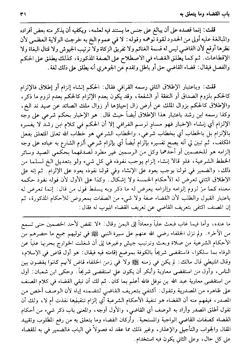 قلت: إِنَّمَا قَصده على أَن يُبَالغ على جنس مَا يسْتَند فِيهِ لعلمه، ويكفيه أَن يذكر مِنْهُ بعض أَفْرَاده وَالْمُبَالغَة عَلَيْهِ أولى من الْحُدُود لقُوَّة توهمه وَقَوله: لَا فِي عُمُوم الخ بِهِ خرجت الْولَايَة الْعُظْمَى لِأَن نظرها أوقع لِأَن القَاضِي لَيْسَ لَهُ قسْمَة الْغَنَائِم وَلَا تَفْرِيق الزَّكَاة وَلَا تَرْتِيب الجيوش وَلَا قتال الْبُغَاة وَلَا الإقطاعات. ثمَّ كَمَا يُطلق الْقَضَاء فِي الِاصْطِلَاح على الصّفة الْمَذْكُورَة، كَذَلِك يُطلق على الحكم والفصل فَيُقَال: قَضَاء القَاضِي حق أَو بَاطِل وَتقدم عَن الْجَوْهَرِي أَنه يُطلق على ذَلِك لُغَة. قلت: وَبِاعْتِبَار الْإِطْلَاق الثَّانِي رسمه الْقَرَافِيّ فَقَالَ: الحكم إنْشَاء إِلْزَام أَو إِطْلَاق فالإلزام كَالْحكمِ بِلُزُوم الصَدَاق أَو النَّفَقَة أَو الشُّفْعَة، وَقد يكون بِعَدَمِ الْإِلْزَام كَالْحكمِ بِعَدَمِ لُزُوم مَا ذكر، وَالْإِطْلَاق كَالْحكمِ بِزَوَال الْملك عَن أَرض زَالَ إحياؤها أَو زَوَال ملك الصَّائِد عَن صيد ند الخ، وَكَذَا رسمه ابْن رشد بِاعْتِبَار هَذَا الْإِطْلَاق أَيْضا حَيْثُ قَالَ: هُوَ الْإِخْبَار بِحكم شَرْعِي على وَجه الْإِلْزَام أَي إنْشَاء الْإِخْبَار فَهُوَ مساوٍ لرسم الْقَرَافِيّ إِلَّا أَن الحكم فِي كَلَام ابْن رشد لَا يفسره بالإلزام بل بِالْخِطَابِ أَي بخطاب شَرْعِي، وَالْخطاب الشَّرْعِيّ هُوَ خطاب الله تَعَالَى الْمُتَعَلّق بِفعل الْمُكَلف، ثمَّ تبين لي أَنه يَصح تَفْسِيره بإلزام أَيْضا أَي بإلزام شَرْعِي ألزم الشَّارِع بِهِ عباده على وَجه إِلْزَامه هُوَ لِلْخَصْمَيْنِ أَو أَحدهمَا وكل من الرسمين غير مطرد لصدقهما بحكمي الصَّيْد وَسَائِر الخطط الشَّرْعِيَّة، فَلَو قَالَا إنْشَاء إِلْزَام يُوجب نُفُوذه فِي كل شَيْء وَلَو بتعديل الخ لسلما من ذَلِك، وَالضَّمِير فِي قَوْلنَا يُوجب يعود على الْإِنْشَاء وَفِي قَوْلنَا نُفُوذه يعود على الْإِلْزَام. ثمَّ إِنَّه على الْإِطْلَاق الثَّانِي تعرض لَهُ الْأَحْكَام الْخَمْسَة وَلَا إِشْكَال. وَكَذَا على الأول لِأَن قَوْله نُفُوذ حكمه مَعْنَاهُ كَمَا مرّ لُزُوم إِلْزَامه وإلزامه يعرض لَهُ مَا ذكر وَبِه يسْقط قَول من قَالَ: إِنَّمَا تعرض لَهُ بِاعْتِبَار الْقبُول والطلب لِأَن الْقَضَاء صفة وَلَا شَيْء من الصِّفَات بمعروض للْأَحْكَام الْمَذْكُورَة، ثمَّ إِن المُصَنّف اكْتفى بتعريف القَاضِي عَن تَعْرِيف الْقَضَاء المبوب لَهُ فَقَالَ: