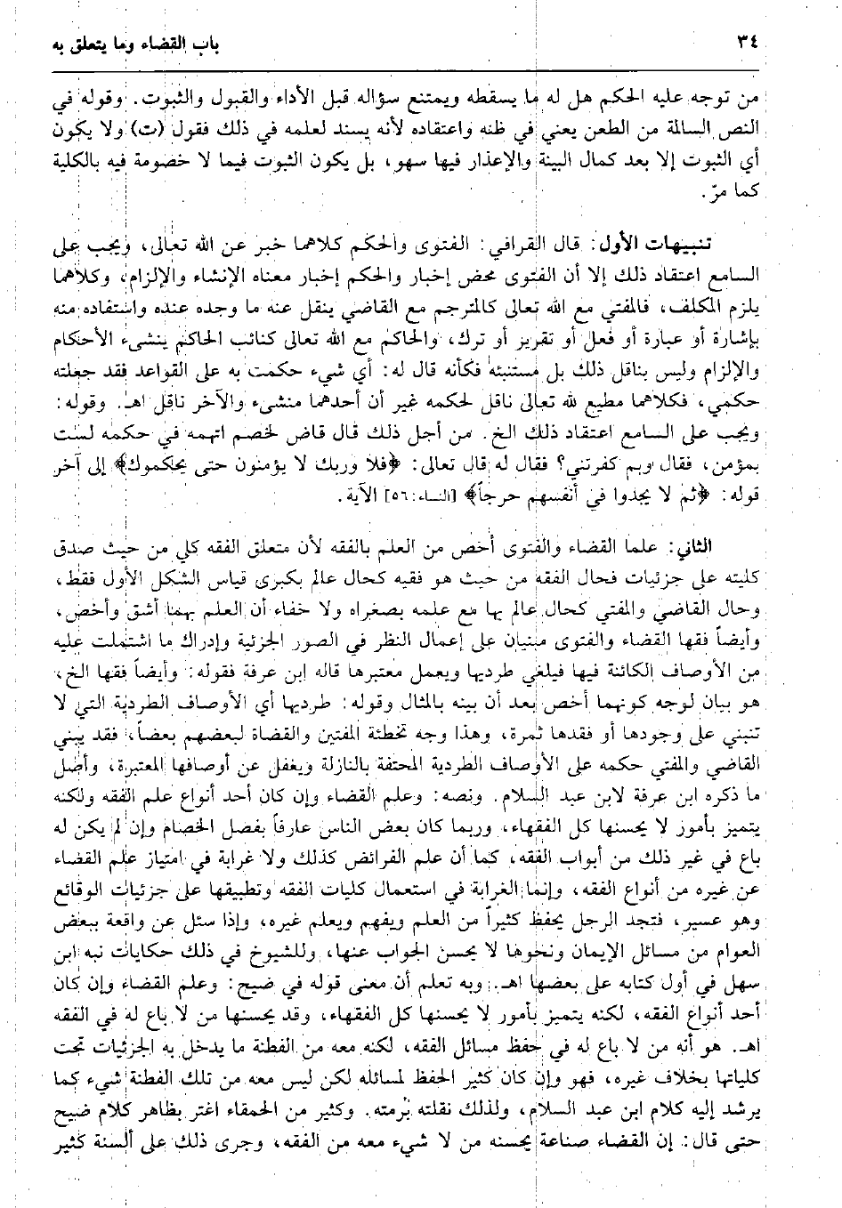 من توجه عَلَيْهِ الحكم هَل لَهُ مَا يسْقطهُ وَيمْتَنع سُؤَاله قبل الْأَدَاء وَالْقَبُول والثبوت. وَقَوله فِي النَّص السالمة من الطعْن يَعْنِي فِي ظَنّه واعتقاده لِأَنَّهُ يسند لعلمه فِي ذَلِك فَقَوْل (ت) وَلَا يكون أَي الثُّبُوت إِلَّا بعد كَمَال الْبَيِّنَة والإعذار فِيهَا سَهْو بل يكون الثُّبُوت فِيمَا لَا خُصُومَة فِيهِ بِالْكُلِّيَّةِ كَمَا مرّ. تَنْبِيهَات الأول: قَالَ الْقَرَافِيّ: الْفَتْوَى وَالْحكم كِلَاهُمَا خبر عَن الله تَعَالَى، وَيجب على السَّامع اعْتِقَاد ذَلِك إِلَّا أَن الْفَتْوَى مَحْض إِخْبَار وَالْحكم إِخْبَار مَعْنَاهُ الْإِنْشَاء والإلزام، وَكِلَاهُمَا يلْزم الْمُكَلف، فالمفتي مَعَ الله تَعَالَى كالمترجم مَعَ القَاضِي ينْقل عَنهُ مَا وجده عِنْده واستفاده مِنْهُ بِإِشَارَة أَو عبارَة أَو فعل أَو تَقْرِير أَو ترك، وَالْحَاكِم مَعَ الله تَعَالَى كنائب الْحَاكِم ينشىء الْأَحْكَام والإلزام وَلَيْسَ بناقل ذَلِك بل مستنبئه فَكَأَنَّهُ قَالَ لَهُ: أَي شَيْء حكمت بِهِ على الْقَوَاعِد فقد جعلته حكمي، فكلاهما مُطِيع لله تَعَالَى ناقل لحكمه غير أَن أَحدهمَا منشىء وَالْآخر ناقل اه. وَقَوله: وَيجب على السَّامع اعْتِقَاد ذَلِك الخ. من أجل ذَلِك قَالَ قَاض لخصم اتهمه فِي حكمه لست بِمُؤْمِن، فَقَالَ وَبِمَ كفرتني؟ فَقَالَ لَهُ قَالَ تَعَالَى: فَلَا وَرَبك لَا يُؤمنُونَ حَتَّى يُحَكِّمُوك} إِلَى آخر قَوْله: ثمَّ لَا يَجدوا فِي أنفسهم حرجاً} (النِّسَاء: 56) الْآيَة. الثَّانِي: علما الْقَضَاء وَالْفَتْوَى أخص من الْعلم بالفقه لِأَن مُتَعَلق الْفِقْه كلي من حَيْثُ صدق كليته على جزئيات فحال الْفِقْه من حَيْثُ هُوَ فَقِيه كَحال عَالم بكبرى قِيَاس الشكل الأول فَقَط، وَحَال القَاضِي والمفتي كَحال عَالم بهَا مَعَ علمه بصغراه وَلَا خَفَاء أَن الْعلم بهما أشق وأخص، وَأَيْضًا فقها الْقَضَاء وَالْفَتْوَى مبنيان على إِعْمَال النّظر فِي الصُّور الْجُزْئِيَّة وَإِدْرَاك مَا اشْتَمَلت عَلَيْهِ من الْأَوْصَاف الكائنة فِيهَا فيلغي طرديها وَيعْمل معتبرها قَالَه ابْن عَرَفَة فَقَوله: وَأَيْضًا فقها الخ، هُوَ بَيَان لوجه كَونهمَا أخص بعد أَن بَينه بالمثال وَقَوله: طرديها أَي الْأَوْصَاف الطردية الَّتِي لَا تنبني على وجودهَا أَو فقدها ثَمَرَة، وَهَذَا وَجه تخطئة الْمُفْتِينَ والقضاة لبَعْضهِم بَعْضًا، فقد يَبْنِي القَاضِي والمفتي حكمه على الْأَوْصَاف الطردية المحتفة بالنازلة ويغفل عَن أوصافها الْمُعْتَبرَة، وأصل مَا ذكره ابْن عَرَفَة لِابْنِ عبد السَّلَام. وَنَصه: وَعلم الْقَضَاء وَإِن كَانَ أحد أَنْوَاع علم الْفِقْه وَلكنه يتَمَيَّز بِأُمُور لَا يحسنها كل الْفُقَهَاء، وَرُبمَا كَانَ بعض النَّاس عَارِفًا بفصل الْخِصَام وَإِن لم يكن لَهُ بَاعَ فِي غير ذَلِك من أَبْوَاب الْفِقْه، كَمَا أَن علم الْفَرَائِض كَذَلِك وَلَا غرابة فِي امتياز علم الْقَضَاء عَن غَيره من أَنْوَاع الْفِقْه، وَإِنَّمَا الغرابة فِي اسْتِعْمَال كليات الْفِقْه وتطبيقها على جزئيات الوقائع وَهُوَ عسير، فتجد الرجل يحفظ كثيرا من الْعلم وَيفهم وَيعلم غَيره، وَإِذا سُئِلَ عَن وَاقعَة بِبَعْض الْعَوام من مسَائِل الْإِيمَان وَنَحْوهَا لَا يحسن الْجَواب عَنْهَا، وللشيوخ فِي ذَلِك حكايات نبه ابْن سهل فِي أول كِتَابه على بَعْضهَا اه. وَبِه تعلم أَن معنى قَوْله فِي ضيح: وَعلم الْقَضَاء وَإِن كَانَ أحد أَنْوَاع الْفِقْه، لكنه يتَمَيَّز بِأُمُور لَا يحسنها كل الْفُقَهَاء، وَقد يحسنها من لَا بَاعَ لَهُ فِي الْفِقْه اه. هُوَ أَنه من لَا بَاعَ لَهُ فِي حفظ مسَائِل الْفِقْه، لكنه مَعَه من الفطنة مَا يدْخل بِهِ الجزئيات تَحت كلياتها بِخِلَاف غَيره، فَهُوَ وَإِن كَانَ كثير الْحِفْظ لمسائله لَكِن لَيْسَ مَعَه من تِلْكَ الفطنة شَيْء كَمَا يرشد إِلَيْهِ كَلَام ابْن عبد 