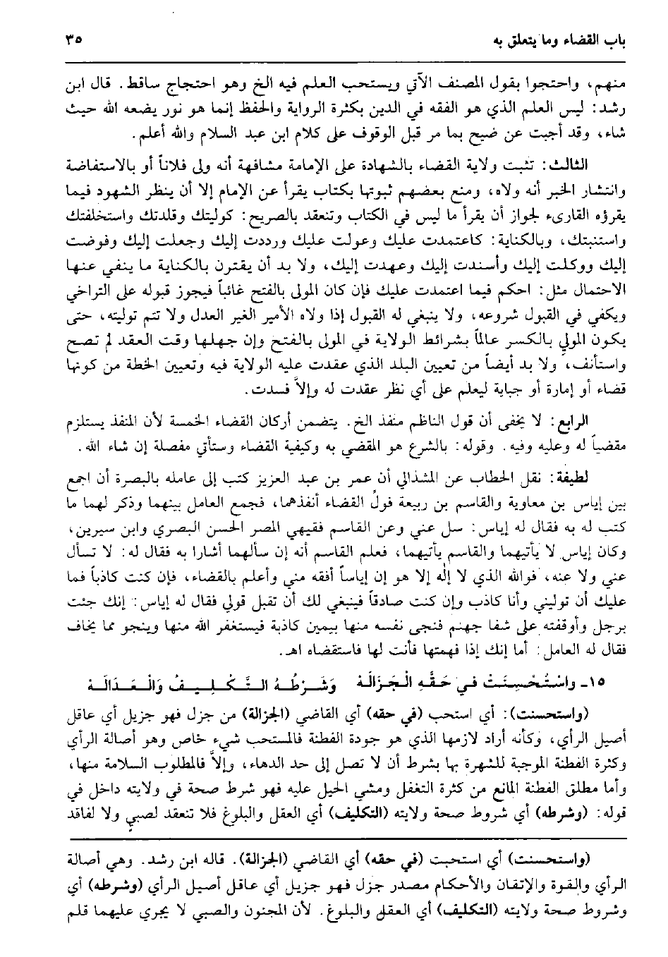 مِنْهُم، وَاحْتَجُّوا بقول المُصَنّف الْآتِي وَيسْتَحب الْعلم فِيهِ الخ وَهُوَ احتجاج سَاقِط. قَالَ ابْن رشد: لَيْسَ الْعلم الَّذِي هُوَ الْفِقْه فِي الدّين بِكَثْرَة الرِّوَايَة وَالْحِفْظ إِنَّمَا هُوَ نور يَضَعهُ الله حَيْثُ شَاءَ، وَقد أجبْت عَن ضيح بِمَا مر قبل الْوُقُوف على كَلَام ابْن عبد السَّلَام وَالله أعلم. الثَّالِث: تثبت ولَايَة الْقَضَاء بِالشَّهَادَةِ على الْإِمَامَة مشافهة أَنه ولى فلَانا أَو بالاستفاضة وانتشار الْخَبَر أَنه ولاه، وَمنع بَعضهم ثُبُوتهَا بِكِتَاب يقْرَأ عَن الإِمَام إِلَّا أَن ينظر الشُّهُود فِيمَا يَقْرَؤُهُ القارىء لجَوَاز أَن يقْرَأ مَا لَيْسَ فِي الْكتاب وتنعقد بِالصَّرِيحِ: كوليتك وقلدتك واستخلفتك واستنبتك وبالكناية: كاعتمدت عَلَيْك وعولت عَلَيْك ورددت إِلَيْك وَجعلت إِلَيْك وفوضت إِلَيْك ووكلت إِلَيْك وأسندت إِلَيْك وعهدت إِلَيْك، وَلَا بُد أَن يقْتَرن بِالْكِنَايَةِ مَا يَنْفِي عَنْهَا الِاحْتِمَال مثل: احكم فِيمَا اعتمدت عَلَيْك فَإِن كَانَ الْمولى بِالْفَتْح غَائِبا فَيجوز قبُوله على التَّرَاخِي وَيَكْفِي فِي الْقبُول شُرُوعه، وَلَا يَنْبَغِي لَهُ الْقبُول إِذا ولاه الْأَمِير الْغَيْر الْعدْل وَلَا تتمّ تَوليته، حَتَّى يكون المولِي بِالْكَسْرِ عَالما بشرائط الْولَايَة فِي الْمولى بِالْفَتْح وَإِن جهلها وَقت العقد لم تصح واستأنف، وَلَا بُد أَيْضا من تعْيين الْبَلَد الَّذِي عقدت عَلَيْهِ الْولَايَة فِيهِ وَتَعْيِين الخطة من كَونهَا قَضَاء أَو إِمَارَة أَو جباية ليعلم على أَي نظر عقدت لَهُ وإلاَّ فَسدتْ. الرَّابِع: لَا يخفى أَن قَول النَّاظِم منفذ الخ. يتَضَمَّن أَرْكَان الْقَضَاء الْخَمْسَة لِأَن المنفذ يسْتَلْزم مقضياً لَهُ وَعَلِيهِ وَفِيه. وَقَوله: بِالشَّرْعِ هُوَ الْمقْضِي بِهِ وَكَيْفِيَّة الْقَضَاء وَسَتَأْتِي مفصلة إِن شَاءَ الله. لَطِيفَة: نقل الْحطاب عَن المشذالي أَن عمر بن عبد الْعَزِيز كتب إِلَى عَامله بِالْبَصْرَةِ أَن اجْمَعْ بَين إِيَاس بن مُعَاوِيَة وَالقَاسِم بن ربيعَة فولِّ الْقَضَاء أنفذهما، فَجمع الْعَامِل بَينهمَا وَذكر لَهما مَا كتب لَهُ بِهِ فَقَالَ لَهُ إِيَاس: سل عني وَعَن الْقَاسِم فقيهي الْمصر الْحسن الْبَصْرِيّ وَابْن سِيرِين، وَكَانَ إِيَاس لَا يأتيهما وَالقَاسِم يأتيهما، فَعلم الْقَاسِم أَنه إِن سَأَلَهُمَا أشارا بِهِ فَقَالَ لَهُ: لَا تسْأَل عني وَلَا عَنهُ، فوَاللَّه الَّذِي لَا إل صلى الله عَلَيْهِ وَسلم