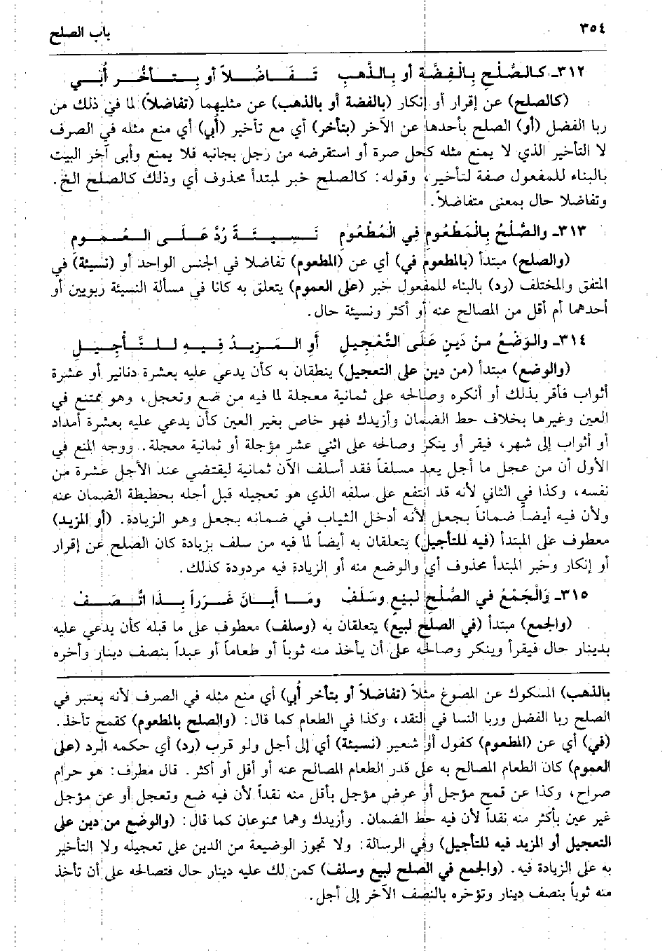 كالصُّلْحِ بِالْفِضَّة أَو بِالذَّهبِ تَفَاضُلاً أَو بِتأخُّر أُبي (كالصلح) عَن إِقْرَار أَو إِنْكَار (بِالْفِضَّةِ أَو بِالذَّهَب) عَن مثليهما (تفاضلاً) لما فِي ذَلِك من رَبًّا الْفضل (أَو) الصُّلْح بأحدها عَن الآخر (بتأخر) أَي مَعَ تَأْخِير (أُبي) أَي منع مثله فِي الصّرْف لَا التَّأْخِير الَّذِي لَا يمْنَع مثله كحل صرة أَو استقرضه من رجل بجانبه فَلَا يمْنَع وأبى آخر الْبَيْت بِالْبِنَاءِ للْمَفْعُول صفة لتأخير، وَقَوله: كالصلح خبر لمبتدأ مَحْذُوف أَي وَذَلِكَ كالصلح الخ. وتفاضلا حَال بِمَعْنى مُتَفَاضلا. والصُّلْحُ بِالْمَطْعُومِ فِي الْمُطْعُومِ نَسِيئَةً رُدَّ عَلَى العُمومِ (وَالصُّلْح) مُبْتَدأ (بالمطعوم فِي) أَي عَن (المطعوم) تفاضلا فِي الْجِنْس الْوَاحِد أَو (نَسِيئَة) فِي الْمُتَّفق والمختلف (رد) بِالْبِنَاءِ للْمَفْعُول خبر (على الْعُمُوم) يتَعَلَّق بِهِ كَانَا فِي مَسْأَلَة النَّسِيئَة ربويين أَو أَحدهمَا أم أقل من الْمصَالح عَنهُ أَو أَكثر ونسيئة حَال. والوَضْعُ منْ دَينٍ عَلَى التَّعْجِيلِ أَوِ المَزِيدُ فِيهِ للتَّأْجِيلِ (والوضع) مُبْتَدأ (من دين على التَّعْجِيل) ينطقان بِهِ كَأَن يَدعِي عَلَيْهِ بِعشْرَة دَنَانِير أَو عشرَة أَثوَاب فَأقر بذلك أَو أنكرهُ وَصَالَحَهُ على ثَمَانِيَة مُعجلَة لما فِيهِ من ضع وتعجل، وَهُوَ مُمْتَنع فِي الْعين وَغَيرهَا بِخِلَاف حط الضَّمَان وَأَزِيدك فَهُوَ خَاص بِغَيْر الْعين كَأَن يَدعِي عَلَيْهِ بِعشْرَة أَمْدَاد أَو أَثوَاب إِلَى شهر، فَيقر أَو يُنكر وَصَالَحَهُ على اثْنَي عشر مُؤَجّلَة أَو ثَمَانِيَة مُعجلَة. وَوجه الْمَنْع فِي الأول أَن من عجل مَا أجل يعد مسلفاً فقد أسلف الْآن ثَمَانِيَة ليقتضي عِنْد الْأَجَل عشرَة من نَفسه، وَكَذَا فِي الثَّانِي لِأَنَّهُ قد انْتفع على سلفه الَّذِي هُوَ تَعْجِيله قبل أَجله بحطيطة الضَّمَان عَنهُ وَلِأَن فِيهِ أَيْضا ضمانا بِجعْل لِأَنَّهُ أَدخل الثِّيَاب فِي ضَمَانه بِجعْل وَهُوَ الزِّيَادَة. (أَو الْمَزِيد) مَعْطُوف على الْمُبْتَدَأ (فِيهِ للتأجيل) يتعلقان بِهِ أَيْضا لما فِيهِ من سلف بِزِيَادَة كَانَ الصُّلْح عَن إِقْرَار أَو إِنْكَار وَخبر الْمُبْتَدَأ مَحْذُوف أَي والوضع مِنْهُ أَو الزِّيَادَة فِيهِ مَرْدُودَة كَذَلِك. وَالْجَمْعُ فِي الصُّلْحِ لبيْعٍ وسَلَفْ ومَا أَبانَ غَرَراً بِذَا اتَّصَفْ (وَالْجمع) مُبْتَدأ (فِي الصُّلْح لبيع) يتعلقان بِهِ (وَسلف) مَعْطُوف على مَا قبله كَأَن يَدعِي عَلَيْهِ بِدِينَار حَال فَيقْرَأ وينكر وَصَالَحَهُ على أَن يَأْخُذ مِنْهُ ثوبا أَو طَعَاما أَو عبدا بِنصْف دِينَار وأخره