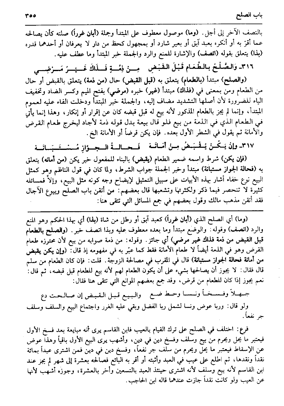 بِالنِّصْفِ الآخر إِلَى أجل. (وَمَا) مَوْصُول مَعْطُوف على الْمُبْتَدَأ وَجُمْلَة (أبان غرراً) صلته كَأَن يصالحه عَمَّا أقرّ بِهِ أَو أنكرهُ بِعَبْد آبق أَو بعير شارد أَو بِمَجْهُول كحظ من دَار لَا يعرفان أَو أَحدهمَا قدره (بذا) يتَعَلَّق بقوله (اتّصف) وَالْإِشَارَة للْمَنْع وَالرَّدّ وَالْجُمْلَة خبر الْمُبْتَدَأ وَمَا عطف عَلَيْهِ. وَالصُّلْحُ بالطَّعَام قَبْلَ القَبْضِ مِنْ ذِمَّةٍ فَذَاكَ غَيْرُ مَرْضِي (وَالصُّلْح) مُبْتَدأ (بِالطَّعَامِ) يتَعَلَّق بِهِ (قبل الْقَبْض) حَال (من ذمَّة) يتَعَلَّق بِالْقَبْضِ أَو حَال من الطَّعَام وَمن بِمَعْنى فِي (فَذَاك) مُبْتَدأ (غير) خَبره (مرضِي) بِفَتْح الْمِيم وَكسر الضَّاد وَتَخْفِيف الْيَاء للضَّرُورَة لِأَن أَصْلهَا التَّشْدِيد مُضَاف إِلَيْهِ، وَالْجُمْلَة خبر الْمُبْتَدَأ وَدخلت الْفَاء عَلَيْهِ لعُمُوم الْمُبْتَدَأ، وَإِنَّمَا لم يجز بِالطَّعَامِ الْمَذْكُور لِأَنَّهُ بيع لَهُ قبل قَبضه كَانَ عَن إِقْرَار أَو إِنْكَار، وَهَذَا إِنَّمَا يَأْتِي فِي الطَّعَام الَّذِي فِي الذِّمَّة من بيع فَلَو قَالَ بيعَة بدل قَوْله ذمَّة لأجاد ليخرج طَعَام الْقَرْض وَالْأَمَانَة ثمَّ يَقُول فِي الشّطْر الأول بعده. فَإِن يكن قرضا أَو الْأَمَانَة الخ. وإنْ يَكُنْ يُقْبَضُ مِنْ أمَانَهْ فَحالةُ الجوَّازِ مُسْتَبَانَهْ (فَإِن يكن) شَرط واسْمه ضمير الطَّعَام (يقبض) بِالْبِنَاءِ للْمَفْعُول خبر يكن (من أَمَانه) يتَعَلَّق بِهِ (فحالة الْجَوَاز مستبانة) مُبْتَدأ وَخبر الْجُمْلَة جَوَاب الشَّرْط، وَلما كَانَ فِي قَول النَّاظِم وَهُوَ كَمثل البيع نوع خَفَاء أَشَارَ بِهَذِهِ الأبيات على سَبِيل التَّمْثِيل لإيضاح وَجه كَونه مثل البيع، وإلاَّ فمسائله كَثِيرَة لَا تَنْحَصِر فِيمَا ذكر ولكثرتها وتشعبها قَالَ بَعضهم: من أتقن بَاب الصُّلْح وبيوع الْآجَال فقد أتقن مَذْهَب مَالك وَقَول بَعضهم فِي جمع الْمسَائِل الَّتِي تتقى هُنَا: