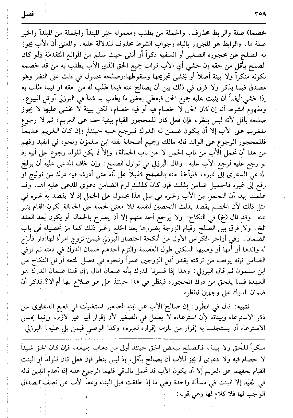 خصما) صلَة والرابط مَحْذُوف. وَالْجُمْلَة من يطْلب ومعموله خبر الْمُبْتَدَأ وَالْجُمْلَة من الْمُبْتَدَأ وَالْخَبَر صلَة مَا. والرابط هُوَ الْمَجْرُور بِالْبَاء وَجَوَاب الشَّرْط مَحْذُوف للدلالة عَلَيْهِ. وَالْمعْنَى أَن الْأَب يجوز لَهُ الصُّلْح عَن مَحْجُوره الصَّغِير أَو السَّفِيه ذكرا أَو أُنْثَى حَيْثُ سلم من الْمَوَانِع الْمُتَقَدّمَة وَلَو كَانَ الصُّلْح بِأَقَلّ من حَقه إِن خشِي أَي الْأَب فَوَات جَمِيع الْحق الَّذِي الْأَب يطْلب بِهِ من قد خَصمه لكَونه مُنْكرا وَلَا بَيِّنَة أصلا أَو يخْشَى تجريحها وسقوطها وصلحه مَحْمُول فِي ذَلِك على النّظر وَهُوَ مُصدق فِيمَا يذكر وَلَا فرق فِي ذَلِك بَين أَن يُصَالح عَنهُ فِيمَا طلب لَهُ من حَقه أَو فِيمَا طلب بِهِ إِذا خشِي أَيْضا أَن يثبت عَلَيْهِ جَمِيع الْحق فيعطي بعض مَا يطْلب بِهِ كَمَا فِي الْبُرْزُليّ أَوَائِل الْبيُوع، وَمَفْهُوم الشَّرْط أَنه إِن كَانَ الْحق لَا خصام فِيهِ أَو فِيهِ خصام، لَكِن بِبَيِّنَة لَا يخْشَى عَلَيْهَا لَا يجوز صلحه بِأَقَلّ لِأَنَّهُ لَيْسَ بِنَظَر، فَإِن فعل كَانَ للمحجور الْقيام بِبَقِيَّة حَقه على الْغَرِيم، ثمَّ لَا رُجُوع للْغَرِيم على الْأَب إِلَّا أَن يكون ضمن لَهُ الدَّرك فَيرجع عَلَيْهِ حِينَئِذٍ وَإِن كَانَ الْغَرِيم عديماً فللمحجور الرُّجُوع على الْوَالِد قَالَه مَالك وَجَمِيع أَصْحَابه نَقله ابْن سَلمُون وَنَحْوه فِي الْمُفِيد وَفهم من هَذَا أَن تحمل الْأَب من بَاب الْحمل لَا من بَاب الْحمالَة، وإلاَّ لم يكن للْوَلَد رُجُوع على أَبِيه إِذْ لَو رَجَعَ عَلَيْهِ لرجع الْأَب عَلَيْهِ. وَقَالَ الْبُرْزُليّ فِي نَوَازِل الصُّلْح: وَإِن خَافَ الْمُدعى عَلَيْهِ أَن يولج الْمُدَّعِي الدَّعْوَى إِلَى غَيره، فليأخذ مِنْهُ بِالصُّلْحِ كَفِيلا على أَنه مَتى أدْركهُ فِيهِ دَرك من توليج أَو رفع إِلَى غَيره فالحميل ضَامِن بذلك فَإِن كَانَ كَذَلِك لزم الضَّامِن دَعْوَى الْمُدعى عَلَيْهِ اه. وَقد علمت بِهَذَا أَن التَّحَمُّل من الْأَب وَغَيره فِي مثل هَذَا مَحْمُول على الْحمل إِذْ لَا يقْصد بِهِ غَيره فِي مثل ذَلِك لِأَن الْخصم يقْصد بذلك التحصين لنَفسِهِ فَلَا معنى لحمله على الْحمالَة لكَون الْمقَام ينبو عَنهُ. وَقد قَالَ (خَ) فِي النِّكَاح: وَلَا يرجع أحد مِنْهُم إِلَّا أَن يُصَرح بالحمالة أَو يكون بعد العقد الخ. وَلَا فرق بَين الصُّلْح وَقيام الزَّوْجَة بضررها بعد الْخلْع وَغير ذَلِك كَمَا مرّ تَحْصِيله فِي بَاب الضَّمَان. وَفِي أَوَاخِر الكراس الأول من أنكحة اخْتِصَار الْبُرْزُليّ فِيمَن تزوج امْرَأَة لَهَا دَار فأباح لَهُ والدها أَو أمهَا أَو وصيها السُّكْنَى طول الْعِصْمَة وَالْتزم أحدهم ضَمَان الدَّرك فِي ذمَّته ثمَّ توفّي الضَّامِن فَإِنَّهُ يُوقف من تركته بِقدر أقل الزَّوْجَيْنِ عمرا وَنَحْوه فِي فصل الْمُتْعَة أَوَائِل النِّكَاح من ابْن سَلمُون ثمَّ قَالَ الْبُرْزُليّ: وَهَذَا إِذا فسرنا الدَّرك بِأَنَّهُ ضَمَان المَال وَإِن قُلْنَا ضَمَان الدَّرك هُوَ الْعهْدَة فِيمَا يلْحق من دَرك المحجورة فَينْظر فِي هَذَا حِينَئِذٍ هَل هُوَ صَلَاح لَهَا أم لَا؟ فَذكر أَن ضَمَان الدَّرك على وَجْهَيْن فَانْظُرْهُ. تَنْبِيه: قَالَ فِي الطرر: إِن صَالح الْأَب عَن ابْنه الصَّغِير اسْتَغْنَيْت فِي قطع الدَّعَاوَى عَن ذكر الاسترعاء وبيناته لِأَن استرعاءه لَا يعْمل فِي الصَّغِير لِأَن إِقْرَار أَبِيه غير لَازم، وَإِنَّمَا يحسن الاسترعاء أَن يستجلب بِهِ إِقْرَار من يلْزمه إِقْرَاره لغيره، وَكَذَا الْوَصِيّ فِيمَن يَلِي عَلَيْهِ. الْبُرْزُليّ:
