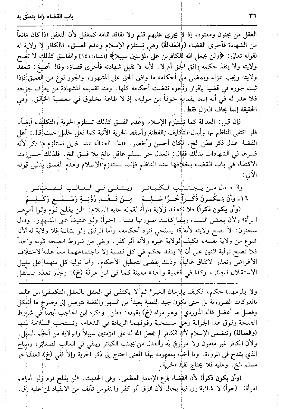 الْعقل من مَجْنُون ومعتوه، إِذْ لَا يجْرِي عَلَيْهِم قلم وَلَا لفاقد تَمَامه كمغفل لِأَن التغفل إِذا كَانَ مَانِعا من الشَّهَادَة فأحرى الْقَضَاء (وَالْعَدَالَة) وَهِي تَسْتَلْزِم الْإِسْلَام وَعدم الْفسق، فالكافر لَا ولَايَة لَهُ لقَوْله تَعَالَى: وَلنْ يَجْعَل الله للْكَافِرِينَ على الْمُؤمنِينَ سَبِيلا} (النِّسَاء: 141) وَالْفَاسِق كَذَلِك لَا تصح ولَايَته وَلَا ينفذ حكمه وَافق الْحق أم لَا. لِأَنَّهُ لَا تقبل شَهَادَته فأحرى قَضَاؤُهُ وَقَالَ أصبغ: تَنْعَقِد ولَايَته وَيجب عَزله ويمضى من أَحْكَامه مَا وَافق الْحق على الْمَشْهُور، والجور نوع من الْفسق فَإِذا ثَبت جوره فِي قَضِيَّة بِإِقْرَار وَنَحْوه نقضت أَحْكَامه كلهَا. وَمِنْه تَقْدِيمه للشَّهَادَة من يعرف جرحه فَلَا عذر لَهُ فِي أَنه إِنَّمَا يقدمهُ خوفًا من موليه، إِذْ لَا طَاعَة لمخلوق فِي مَعْصِيّة الْخَالِق. وَفِي الْحَقِيقَة إِنَّمَا يخَاف الْعَزْل فَقَط. فَإِن قيل: الْعَدَالَة كَمَا تَسْتَلْزِم الْإِسْلَام وَعدم الْفسق كَذَلِك تَسْتَلْزِم الْحُرِّيَّة والتكليف أَيْضا، فَلَو اكْتفى النَّاظِم بهَا وأبدل التَّكْلِيف بالفطنة وَأسْقط الْحُرِّيَّة الْآتِيَة كَمَا فعل خَلِيل حَيْثُ قَالَ: أهل الْقَضَاء عدل ذكر فطن الخ. لَكَانَ أحسن وأخصر. قُلْنَا: الْعَدَالَة عِنْد خَلِيل تَسْتَلْزِم مَا ذكر لِأَنَّهُ فَسرهَا فِي الشَّهَادَات بذلك فَقَالَ: الْعدْل حر مُسلم عَاقل بَالغ بِلَا فسق الخ. فَلذَلِك حسن مِنْهُ الِاكْتِفَاء فِي بَاب الْقَضَاء بِخِلَافِهَا عِنْد النَّاظِم فَإِنَّمَا تَسْتَلْزِم الْإِسْلَام وَعدم الْفسق بِدَلِيل قَوْله الْآتِي: وَالْعدْل من يجْتَنب الْكَبَائِر وَيَتَّقِي فِي الْغَالِب الصَّغَائِر وَأنْ يَكُونَ ذَكَراً حُرًّا سَلِمْ مِنْ فَقْدِ رُؤْيَةٍ وَسَمْعٍ وَكَلِمْ (وَأَن يكون ذكرا) فَلَا تَنْعَقِد ولَايَة الْمَرْأَة لقَوْله عَلَيْهِ السَّلَام: (لن يفلح قوم ولوا أَمرهم امْرَأَة) وَلِأَن بعض النِّسَاء رُبمَا كَانَت صورتهَا فتْنَة. (حرا) وَلَو عتيقاً على الْمَشْهُور. وَقَالَ سَحْنُون: لَا تصح ولَايَته لِأَنَّهُ قد يستحي فَترد أَحْكَامه، وَأما الرَّقِيق وَلَو بشائبة فَلَا ولَايَة لَهُ لِأَنَّهُ مَمْنُوع من ولَايَة نَفسه، فَكيف لولاية غَيره وَلِأَنَّهُ أثر كفر. وَبَقِي من شُرُوط الصِّحَّة كَونه وَاحِدًا فَلَا تصح تَوْلِيَة اثْنَيْنِ على أَن لَا ينفذ حكم فِي كل قَضِيَّة إِلَّا باجتماعهما مَعًا عَلَيْهِ لاخْتِلَاف الْأَغْرَاض وَتعذر الِاتِّفَاق غَالِبا، وَذَلِكَ يُفْضِي لتعطيل الْأَحْكَام، وَأما تَوْلِيَة كل مِنْهُمَا على سَبِيل الِاسْتِقْلَال فَجَائِز، وَكَذَا فِي قَضِيَّة وَاحِدَة مُعينَة كَمَا فِي ابْن عَرَفَة (خَ) : وَجَاز تعدد مُسْتَقل