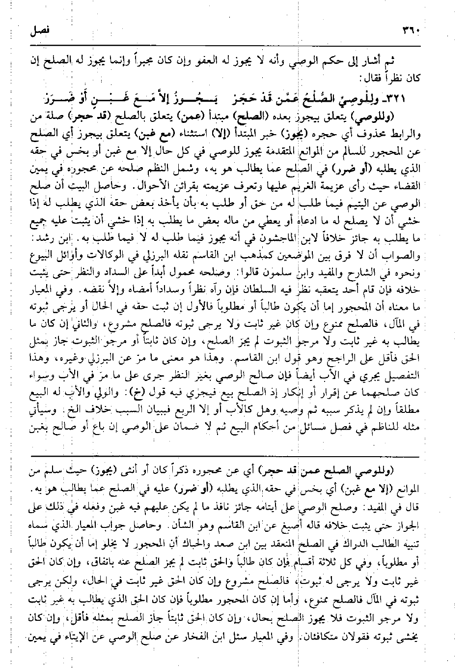 ثمَّ أَشَارَ إِلَى حكم الْوَصِيّ وَأَنه لَا يجوز لَهُ الْعَفو وَإِن كَانَ مجبراً وَإِنَّمَا يجوز لَهُ الصُّلْح إِن كَانَ نظرا فَقَالَ: ولِلْوصِيِّ الصُّلْحُ عَمَّن قَدْ حَجَرْ يَجُوزُ إلاَّ مَعَ غَبْنٍ أَوْ ضَرَرْ (وللوصي) يتَعَلَّق بيجوز بعده (الصُّلْح) مُبْتَدأ (عَمَّن) يتَعَلَّق بِالصُّلْحِ (قد حجر) صلَة من والرابط مَحْذُوف أَي حجره (يجوز) خبر الْمُبْتَدَأ (إِلَّا) اسْتثِْنَاء (مَعَ غبن) يتَعَلَّق بيجوز أَي الصُّلْح عَن الْمَحْجُور للسالم من الْمَوَانِع الْمُتَقَدّمَة يجوز للْوَصِيّ فِي كل حَال إِلَّا مَعَ غبن أَو بخس فِي حَقه الَّذِي يَطْلُبهُ (أَو ضَرَر) فِي الصُّلْح عَمَّا يُطَالب هُوَ بِهِ، وَشَمل النّظم صلحه عَن مَحْجُوره فِي يَمِين الْقَضَاء حَيْثُ رأى عَزِيمَة الْغَرِيم عَلَيْهَا وتعرف عزيمته بقرائن الْأَحْوَال. وَحَاصِل الْبَيْت أَن صلح الْوَصِيّ عَن الْيَتِيم فِيمَا طلب لَهُ من حق أَو طلب بِهِ بِأَن يَأْخُذ بعض حَقه الَّذِي يطْلب لَهُ إِذا خشِي أَن لَا يصلح لَهُ مَا ادَّعَاهُ أَو يُعْطي من مَاله بعض مَا يطْلب بِهِ إِذا خشِي أَن يثبت عَلَيْهِ جَمِيع مَا يطْلب بِهِ جَائِز خلافًا لِابْنِ الْمَاجشون فِي أَنه يجوز فِيمَا طلب لَهُ لَا فِيمَا طلب بِهِ. ابْن رشد: وَالصَّوَاب أَن لَا فرق بَين الْمَوْضِعَيْنِ كمذهب ابْن الْقَاسِم نَقله الْبُرْزُليّ فِي الوكالات وأوائل الْبيُوع وَنَحْوه فِي الشَّارِح والمفيد وَابْن سَلمُون قَالُوا: وصلحه مَحْمُول أبدا على السداد وَالنَّظَر حَتَّى يثبت خِلَافه فَإِن قَامَ أحد يتعقبه نظر فِيهِ السُّلْطَان فَإِن رَآهُ نظرا وسداداً أَمْضَاهُ وإلاَّ نقضه. وَفِي المعيار مَا مَعْنَاهُ أَن الْمَحْجُور إِمَّا أَن يكون طَالبا أَو مَطْلُوبا فَالْأول إِن ثَبت حَقه فِي الْحَال أَو يُرْجَى ثُبُوته فِي الْمَآل، فَالصُّلْح مَمْنُوع وَإِن كَانَ غير ثَابت وَلَا يُرْجَى ثُبُوته فَالصُّلْح مَشْرُوع وَالثَّانِي إِن كَانَ مَا يُطَالب بِهِ غير ثَابت وَلَا مرجو الثُّبُوت لم يجز الصُّلْح، وَإِن كَانَ ثَابتا أَو مرجو الثُّبُوت جَازَ بِمثل الْحق فَأَقل على الرَّاجِح وَهُوَ قَول ابْن الْقَاسِم. وَهَذَا هُوَ معنى مَا مرّ عَن الْبُرْزُليّ وَغَيره، وَهَذَا التَّفْصِيل يجْرِي فِي الْأَب أَيْضا فَإِن صَالح الْوَصِيّ بِغَيْر النّظر جرى على مَا مرّ فِي الْأَب وَسَوَاء كَانَ صلحهما عَن إِقْرَار أَو إِنْكَار إِذْ الصُّلْح بيع فَيجْرِي فِيهِ قَول (خَ) : وَالْوَلِيّ وَالْأَب لَهُ البيع مُطلقًا وَإِن لم يذكر سَببه ثمَّ وَصِيّه وَهل كَالْأَبِ أَو إِلَّا الرّبع فببيان السَّبَب خلاف الخ. وَسَيَأْتِي مثله للناظم فِي فصل مسَائِل من أَحْكَام البيع ثمَّ لَا ضَمَان على الْوَصِيّ إِن بَاعَ أَو صَالح بِغَبن