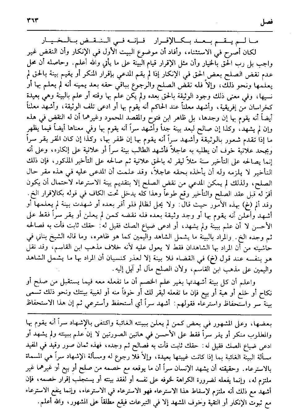 فَإِنَّهُ فِي النَّقْض بِالْخِيَارِ لَكَانَ أصرح فِي الِاسْتِثْنَاء، وَأفَاد أَن مَوْضُوع الْبَيْت الأول فِي الْإِنْكَار وَأَن النَّقْض غير وَاجِب بل رب الْحق بِالْخِيَارِ وَأَن مثل الْإِقْرَار قيام الْبَيِّنَة على مَا يَأْتِي وَالله أعلم. وَحَاصِله أَن مَحل عدم نقض الصُّلْح بعض الْحق فِي الْإِنْكَار إِذا لم يقم الْمُدَّعِي بِإِقْرَار الْمُنكر أَو يُقيم بَيِّنَة بِالْحَقِّ لم يعلمهَا وَنَحْو ذَلِك، وإلاَّ فَلهُ نقض الصُّلْح وَالرُّجُوع بباقي حَقه بعد يَمِينه أَنه لم يعلم بهَا أَو نَسِيَهَا، وَفِي معنى ذَلِك وجود الْوَثِيقَة بِالْحَقِّ بعده وَلم يكن علم بهَا وقته أَو علم بِالْبَيِّنَةِ وَهِي بعيدَة كخراسان من إفريقية، وَأشْهد مُعْلنا عِنْد الْحَاكِم أَنه يقوم بهَا أَو ادّعى تلف الْوَثِيقَة، وَأشْهد مُعْلنا أَيْضا أَنه يقوم بهَا إِن وجدهَا، بل ظَاهر ابْن فتوح والمقصد الْمَحْمُود وَغَيرهمَا أَن لَهُ النَّقْض فِي هَذِه وَإِن لم يشْهد، وَكَذَا إِن صَالح لبعد بَيِّنَة جدا وَأشْهد سرا أَنه يقوم بهَا وَفِي مَعْنَاهَا أَيْضا فِيمَا يظْهر مَا إِذا تقدم شُعُور بالوثيقة وَأشْهد سرا أَنه يقوم بهَا إِن ظفر بهَا، وَكَذَا إِن كَانَ الْمقر يقر سرا ويجحد عَلَانيَة خوف أَن يَطْلُبهُ بِهِ عَاجلا فَأشْهد الطَّالِب بَيِّنَة سرا أَو عَلَانيَة على إِنْكَاره، وعَلى أَنه إِنَّمَا يصالحه على التَّأْخِير سنة مثلا لِيُقِر لَهُ بِالْحَقِّ عَلَانيَة ثمَّ صَالحه على التَّأْخِير الْمَذْكُور، فَإِن ذَلِك التَّأْخِير لَا يلْزمه وَله أَن يَأْخُذهُ بِحقِّهِ عَاجلا، وَقد علمت أَن الْمُدعى عَلَيْهِ فِي هَذِه مقرّ حَال الصُّلْح، وَلذَلِك لم يُمكن الْمُدَّعِي من نقض الصُّلْح إِلَّا بِتَقْدِيم بَيِّنَة الاسترعاء لاحْتِمَال أَن يكون أقرّ لَهُ قبل عقد الصُّلْح وَالتَّأْخِير وَقع طَوْعًا وَهَذَا كُله يدْخل تَحت الْكَاف فِي قَوْله بكالإقرار الخ. وَقد ألم (خَ) بِهَذِهِ الْأُمُور حَيْثُ قَالَ: وَلَا يحل لظَالِم فَلَو أقرّ بعده أَو شهِدت بَيِّنَة لم يعلمهَا أَو أشهد وأعلن أَنه يقوم بهَا أَو وجد وَثِيقَة بعده فَلهُ نقضه كمن لم يعلن أَو يقر سرا فَقَط على الْأَحْسَن لَا أَن علم بِبَيِّنَة وَلم يشْهد، أَو ادّعى ضيَاع الصَّك فَقيل لَهُ: حَقك ثَابت فأت بِهِ فَصَالحه ثمَّ وجده الخ. وَالْمرَاد بِالْبَيِّنَةِ مَا يَشْمَل الشَّاهِد وَالْيَمِين كَمَا هُوَ ظَاهره، وَمَا قَالَه الشَّيْخ بناني فِي حَاشِيَته من أَن المُرَاد بهَا الشَّاهِدَانِ فَقَط لَا يعول عَلَيْهِ لِأَنَّهُ خلاف مَذْهَب ابْن الْقَاسِم، وَقد نقل هُوَ بِنَفسِهِ عِنْد قَول (خَ) فِي الْقَضَاء فَلَا بَيِّنَة إِلَّا لعذر كنسيان أَن المُرَاد بهَا مَا يَشْمَل الشَّاهِد وَالْيَمِين على مَذْهَب ابْن الْقَاسِم، وَلِأَن الصُّلْح مآل أَو آيل إِلَيْهِ. وَاعْلَم أَن كل بَيِّنَة أشهدتها بِغَيْر علم الْخصم أَن مَا تَفْعَلهُ مَعَه فِيمَا يسْتَقْبل من صلح أَو نِكَاح أَو خلع أَو هبة أَو بيع فَإِن مَا تَفْعَلهُ لِيُقِر لَك أَو خوفًا مِنْهُ أَو لغيبة بينتك وَنَحْو ذَلِك تسمى بَيِّنَة سر واستحفاظ واسترعاء فَقَوْلهم: أشهد سرا أَي أستحفظ وأسترعي ثمَّ إِن هَذَا الاستحفاظ