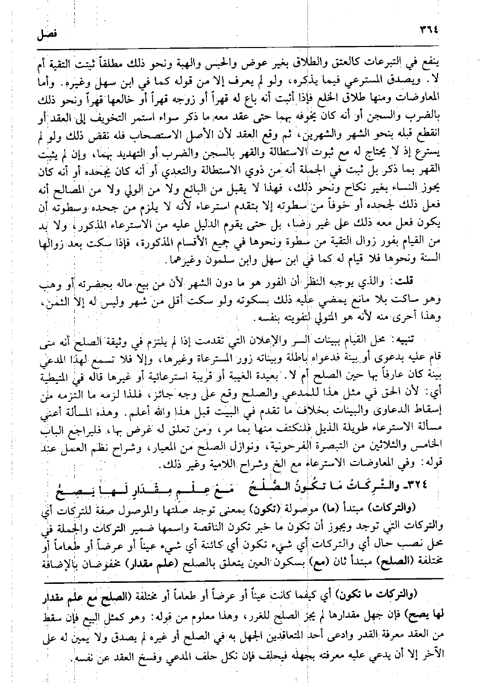 ينفع فِي التَّبَرُّعَات كَالْعِتْقِ وَالطَّلَاق بِغَيْر عوض وَالْحَبْس وَالْهِبَة وَنَحْو ذَلِك مُطلقًا ثبتَتْ التقية أم لَا. وَيصدق المسترعي فِيمَا يذكرهُ، وَلَو لم يعرف إِلَّا من قَوْله كَمَا فِي ابْن سهل وَغَيره. وَأما الْمُعَاوَضَات وَمِنْهَا طَلَاق الْخلْع فَإِذا أثبت أَنه بَاعَ لَهُ قهرا أَو زوجه قهرا أَو خَالعهَا قهرا وَنَحْو ذَلِك بِالضَّرْبِ والسجن أَو أَنه كَانَ يخوفه بهما حَتَّى عقد مَعَه مَا ذكر سَوَاء اسْتمرّ التخويف إِلَى العقد أَو انْقَطع قبله بِنَحْوِ الشَّهْر والشهرين، ثمَّ وَقع العقد لِأَن الأَصْل الِاسْتِصْحَاب فَلهُ نقض ذَلِك وَلَو لم يسترع إِذْ لَا يحْتَاج لَهُ مَعَ ثُبُوت الاستطالة والقهر بالسجن وَالضَّرْب أَو التهديد بهما، وَإِن لم يثبت الْقَهْر بِمَا ذكر بل ثَبت فِي الْجُمْلَة أَنه من ذَوي الاستطالة والتعدي أَو أَنه كَانَ يجحده أَو أَنه كَانَ يحوز النِّسَاء بِغَيْر نِكَاح وَنَحْو ذَلِك، فَهَذَا لَا يقبل من البَائِع وَلَا من الْوَلِيّ وَلَا من الْمصَالح أَنه فعل ذَلِك لجحده أَو خوفًا من سطوته إِلَّا بتقدم استرعاء لِأَنَّهُ لَا يلْزم من جَحده وسطوته أَن يكون فعل مَعَه ذَلِك على غير رضَا، بل حَتَّى يقوم الدَّلِيل عَلَيْهِ من الاسترعاء الْمَذْكُور، وَلَا بُد من الْقيام بفور زَوَال التقية من سطوة وَنَحْوهَا فِي جَمِيع الْأَقْسَام الْمَذْكُورَة، فَإِذا سكت بعد زَوَالهَا السّنة وَنَحْوهَا فَلَا قيام لَهُ كَمَا فِي ابْن سهل وَابْن سَلمُون وَغَيرهمَا. قلت: وَالَّذِي يُوجِبهُ النّظر أَن الْفَوْر هُوَ مَا دون الشَّهْر لِأَن من بيع مَاله بِحَضْرَتِهِ أَو وهب وَهُوَ سَاكِت بِلَا مَانع يمْضِي عَلَيْهِ ذَلِك بسكوته وَلَو سكت أقل من شهر وَلَيْسَ لَهُ إِلَّا الثّمن، وَهَذَا أَحْرَى مِنْهُ لِأَنَّهُ هُوَ الْمُتَوَلِي لتفويته بِنَفسِهِ. تَنْبِيه: مَحل الْقيام ببينات السِّرّ والإعلان الَّتِي تقدّمت إِذا لم يلْتَزم فِي وَثِيقَة الصُّلْح أَنه مَتى قَامَ عَلَيْهِ بِدَعْوَى أَو بَيِّنَة فدعواه بَاطِلَة وبيناته زور المسترعاة وَغَيرهَا، وَإِلَّا فَلَا تسمع لهَذَا الْمُدَّعِي بَيِّنَة كَانَ عَارِفًا بهَا حِين الصُّلْح أم لَا. بعيدَة الْغَيْبَة أَو قريبَة استرعائية أَو غَيرهَا قَالَه فِي الْمُتَيْطِيَّة أَي: لِأَن الْحق فِي مثل هَذَا للْمُدَّعِي وَالصُّلْح وَقع على وَجه جَائِز، فَلِذَا لزمَه مَا الْتَزمهُ من إِسْقَاط الدَّعَاوَى والبينات بِخِلَاف مَا تقدم فِي الْبَيْت قبل هَذَا وَالله أعلم. وَهَذِه الْمَسْأَلَة أَعنِي مَسْأَلَة الاسترعاء طَوِيلَة الذيل فلنكتف مِنْهَا بِمَا مر، وَمن تعلق لَهُ غَرَض بهَا، فَليُرَاجع الْبَاب الْخَامِس وَالثَّلَاثِينَ من التَّبْصِرَة الفرحونية، ونوازل الصُّلْح من المعيار، وشراح نظم الْعَمَل عِنْد قَوْله: وَفِي الْمُعَاوَضَات الاسترعاء مَعَ الخ وشراح اللامية وَغير ذَلِك. والتَّرِكَاتُ مَا تكُونُ الصُّلْحُ مَعْ عِلْمِ مِقْدَارٍ لَها يَصِحُّ (والتركات) مُبْتَدأ (مَا) مَوْصُولَة (تكون) بِمَعْنى تُوجد صلتها والموصول صفة للتركات أَي والتركات الَّتِي تُوجد وَيجوز أَن تكون مَا خبر تكون النَّاقِصَة وَاسْمهَا ضمير التركات وَالْجُمْلَة فِي مَحل نصب حَال أَي والتركات أَي شَيْء تكون أَي كائنة أَي شَيْء عينا أَو عرضا أَو طَعَاما أَو مُخْتَلفَة (الصُّلْح) مُبْتَدأ ثَان (مَعَ) بِسُكُون الْعين يتَعَلَّق بِالصُّلْحِ (علم مِقْدَار) مخفوضان بِالْإِضَافَة