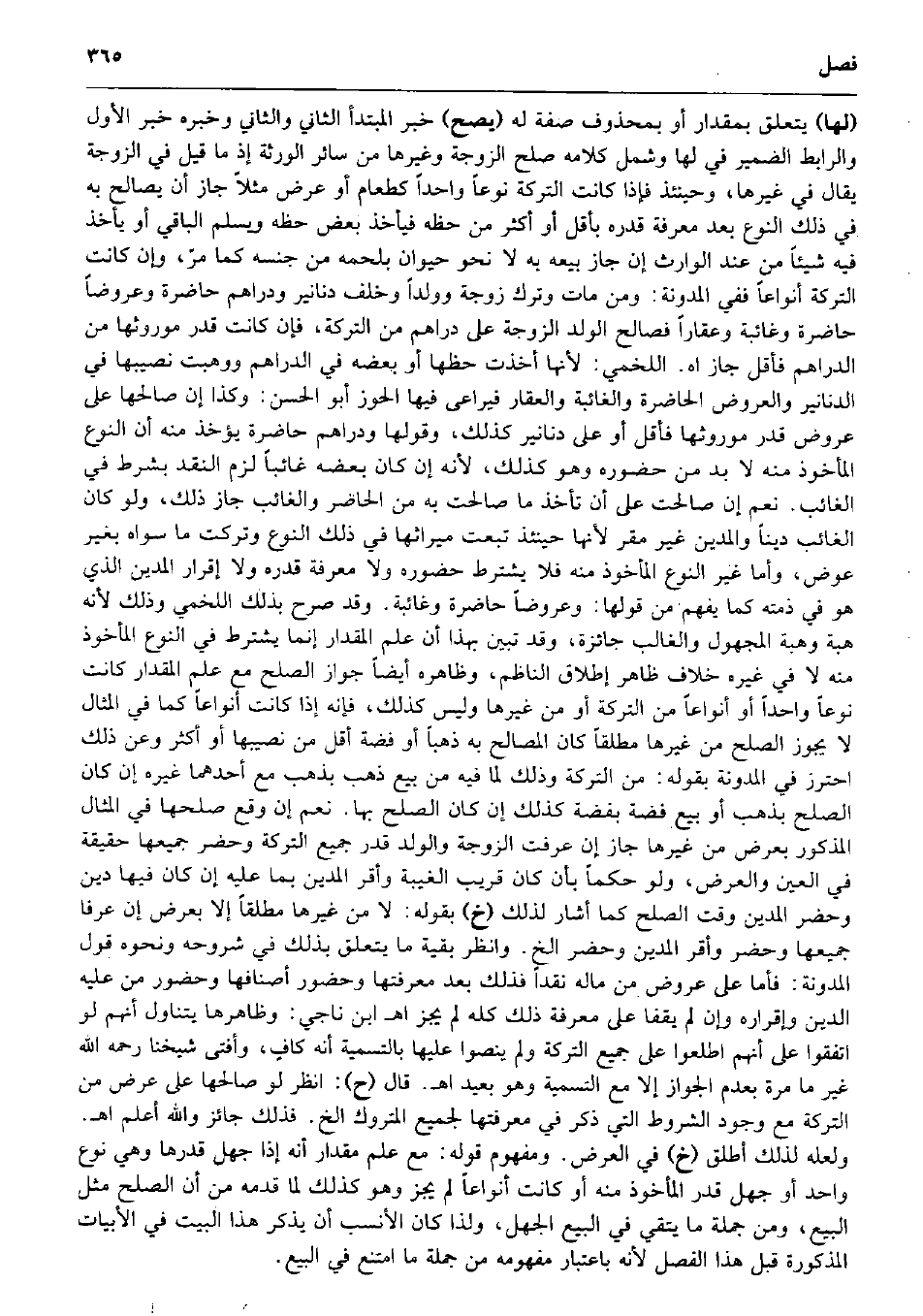 (لَهَا) يتَعَلَّق بِمِقْدَار أَو بِمَحْذُوف صفة لَهُ (يَصح) خبر الْمُبْتَدَأ الثَّانِي وَالثَّانِي وَخَبره خبر الأول والرابط الضَّمِير فِي لَهَا وَشَمل كَلَامه صلح الزَّوْجَة وَغَيرهَا من سَائِر الْوَرَثَة إِذْ مَا قيل فِي الزَّوْجَة يُقَال فِي غَيرهَا وَحِينَئِذٍ فَإِذا كَانَت التَّرِكَة نوعا وَاحِدًا كطعام أَو عرض مثلا جَازَ أَن يُصَالح بِهِ فِي ذَلِك النَّوْع بعد معرفَة قدره بِأَقَلّ أَو أَكثر من حَظه فَيَأْخُذ بعض حَظه وَيسلم الْبَاقِي أَو يَأْخُذ فِيهِ شَيْئا من عِنْد الْوَارِث إِن جَازَ بَيْعه بِهِ لَا نَحْو حَيَوَان بِلَحْمِهِ من جنسه كَمَا مرّ، وَإِن كَانَت التَّرِكَة أنواعاً فَفِي الْمُدَوَّنَة: وَمن مَاتَ وَترك زَوْجَة وَولدا وَخلف دَنَانِير ودراهم حَاضِرَة وعروضاً حَاضِرَة وغائبة وعقاراً فَصَالح الْوَلَد الزَّوْجَة على دَرَاهِم من التَّرِكَة، فَإِن كَانَت قدر موروثها من الدَّرَاهِم فَأَقل جَازَ اه. اللَّخْمِيّ: لِأَنَّهَا أخذت حظها أَو بعضه فِي الدَّرَاهِم ووهبت نصِيبهَا فِي الدَّنَانِير وَالْعرُوض الْحَاضِرَة والغائبة وَالْعَقار فيراعى فِيهَا الْحَوْز أَبُو الْحسن: وَكَذَا إِن صالحها على عرُوض قدر موروثها فَأَقل أَو على دَنَانِير كَذَلِك، وَقَوْلها ودراهم حَاضِرَة يُؤْخَذ مِنْهُ أَن النَّوْع الْمَأْخُوذ مِنْهُ لَا بُد من حُضُوره وَهُوَ كَذَلِك، لِأَنَّهُ إِن كَانَ بعضه غَائِبا لزم النَّقْد بِشَرْط فِي الْغَائِب. نعم إِن صالحت على أَن تَأْخُذ مَا صالحت بِهِ من الْحَاضِر وَالْغَائِب جَازَ ذَلِك، وَلَو كَانَ الْغَائِب دينا والمدين غير مقرّ لِأَنَّهَا حِينَئِذٍ تبِعت مِيرَاثهَا فِي ذَلِك النَّوْع وَتركت مَا سواهُ بِغَيْر عوض، وَأما غير النَّوْع الْمَأْخُوذ مِنْهُ فَلَا يشْتَرط حُضُوره وَلَا معرفَة قدره وَلَا إِقْرَار الْمَدِين الَّذِي هُوَ فِي ذمَّته كَمَا يفهم من قَوْلهَا: وعروضاً حَاضِرَة وغائبة. وَقد صرح بذلك اللَّخْمِيّ وَذَلِكَ لِأَنَّهُ هبة وَهبة الْمَجْهُول وَالْغَالِب جَائِزَة، وَقد تبين بِهَذَا أَن علم الْمِقْدَار إِنَّمَا يشْتَرط فِي النَّوْع الْمَأْخُوذ مِنْهُ لَا فِي غَيره خلاف ظَاهر إِطْلَاق النَّاظِم، وَظَاهره أَيْضا جَوَاز الصُّلْح مَعَ علم الْمِقْدَار كَانَت نوعا وَاحِدًا أَو أنواعاً من التَّرِكَة أَو من غَيرهَا وَلَيْسَ كَذَلِك، فَإِنَّهُ إِذا كَانَت أنواعاً كَمَا فِي الْمِثَال لَا يجوز الصُّلْح من غَيرهَا مُطلقًا كَانَ الْمصَالح بِهِ ذَهَبا أَو فضَّة أقل من نصِيبهَا أَو أَكثر وَعَن ذَلِك احْتَرز فِي الْمُدَوَّنَة بقوله: من التَّرِكَة وَذَلِكَ لما فِيهِ من بيع ذهب بِذَهَب مَعَ أَحدهمَا غَيره إِن كَانَ الصُّلْح بِذَهَب أَو بيع فضَّة بِفِضَّة كَذَلِك إِن كَانَ الصُّلْح بهَا. نعم إِن وَقع صلحها فِي الْمِثَال الْمَذْكُور بِعرْض من غَيرهَا جَازَ إِن عرفت الزَّوْجَة وَالْولد قدر جَمِيع التَّرِكَة وَحضر جَمِيعهَا حَقِيقَة فِي الْعين وَالْعرض، وَلَو حكما بِأَن كَانَ قريب الْغَيْبَة وَأقر الْمَدِين بِمَا عَلَيْهِ إِن كَانَ فِيهَا دين وَحضر الْمَدِين وَقت الصُّلْح كَمَا أَشَارَ لذَلِك (خَ) بقوله: لَا من غَيرهَا مُطلقًا إِلَّا بِعرْض إِن عرفا جَمِيعهَا وَحضر وَأقر الْمَدِين وَحضر الخ. وَانْظُر بَقِيَّة مَا يتَعَلَّق بذلك فِي شروحه وَنَحْوه قَول الْمُدَوَّنَة: فَأَما على عرُوض من مَاله نَقْدا فَذَلِك بعد مَعْرفَتهَا وَحُضُور أصنافها وَحُضُور من عَلَيْهِ الدّين وَإِقْرَاره وَإِن لم يقفا على معرفَة ذَلِك كُله لم يجز اه ابْن نَاجِي: وظاهرها يتَنَاوَل أَنهم لَو اتَّفقُوا على أَنهم اطلعوا على جَمِيع التَّرِكَة وَلم ينصوا عَلَيْهَا بِالتَّسْمِيَةِ أَنه كافٍ، وَأفْتى شَيخنَا رَحمَه الله غير مَا مرّة بِعَدَمِ الْجَوَاز إِلَّا مَعَ التَّسْمِيَة وَهُوَ بعيد اه. قَالَ (ح) : انْظُر لَو صال