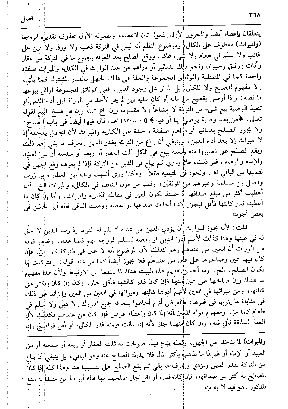 يتعلقان بِإِعْطَاء أَيْضا وَالْمَجْرُور الأول مفعول ثَان لإعطاء، ومفعوله الأول مَحْذُوف تَقْدِيره الزَّوْجَة (وَالْمِيرَاث) مَعْطُوف على الكالىء وموضوع النّظم أَنه لَيْسَ فِي التَّرِكَة ذهب وَلَا ورق وَلَا دين على غَائِب وَلَا سلم فِي طَعَام وَلَا شَيْء غَائِب وَوَقع الصُّلْح بعد الْمعرفَة بِجَمِيعِ مَا فِي التَّرِكَة من عقار وأثاث ورقيق وحيوان وَنَحْو ذَلِك بِدَنَانِير أَو دَرَاهِم من عِنْد الْوَارِث فِي الكالىء وَالْمِيرَاث صَفْقَة وَاحِدَة كَمَا فِي الْمُتَيْطِيَّة والوثائق الْمَجْمُوعَة وَالْعلَّة فِي ذَلِك الْجَهْل بِالْقدرِ الْمُشْتَرك كَمَا يَأْتِي، وَلَا مَفْهُوم للصلح وَلَا للكالىء بل الْمدَار على وجود الدّين، فَفِي الوثائق الْمَجْمُوعَة أَوَائِل بيوعها مَا نَصه: وَإِذا أوصى بقطيع من مَاله أَو كَانَ عَلَيْهِ دين لم يجز لأحد من الْوَرَثَة قبل أَدَاء الدّين أَو تَنْفِيذ الْوَصِيَّة بيع شَيْء من التَّرِكَة لَا مشَاعا وَلَا مقسوماً وَإِن بَاعَ شَيْئا وَإِن قل فسخ البيع لقَوْله تَعَالَى: من بعد وَصِيَّة يُوصي بهَا أَو دين} (النِّسَاء: 12) اه وَقَالَ فِيهَا أَيْضا فِي بَاب الصُّلْح: وَلَا يجوز الصُّلْح بِدَنَانِير أَو دَرَاهِم صَفْقَة وَاحِدَة عَن الكالىء وَالْمِيرَاث لِأَن الْجَهْل يدْخلهُ إِذْ لَا مِيرَاث إِلَّا بعد أَدَاء الدّين، وَيَنْبَغِي أَن يُبَاع من التَّرِكَة بِقدر الدّين وَيعرف مَا بَقِي بعد ذَلِك وَيَقَع الصُّلْح على نصِيبهَا مِنْهُ وَلَعَلَّه يُبَاع فِي الْكل ثلث الْعقار أَو ربعه أَو سدسه أَو من العبيد وَالْإِمَاء والوطاء وَغير ذَلِك، فَلَا يدْرِي كم يُبَاع فِي الدّين من التَّرِكَة فَإِذا لم يعرف وَقع الْجَهْل فِي نصِيبهَا من الْبَاقِي اه. وَنَحْوه فِي الْمُتَيْطِيَّة قَائِلا: وَهَكَذَا روى أَشهب وَقَالَهُ ابْن الْعَطَّار وَابْن زرب وَفضل بن مسلمة وَغَيرهم من الموثقين، وَفهم من قَول النَّاظِم فِي الكالىء وَالْمِيرَاث الخ. أَنَّهَا أَعْطَيْت أَكثر من مبلغ صَدَاقهَا إِذْ حِينَئِذٍ تكون الْعين فِي مُقَابلَة الكالىء وَالْمِيرَاث. وَأما إِن كَانَ مَا أَعْطيته قدر كالئها فَأَقل فَيجوز لِأَنَّهَا أخذت صَدَاقهَا أَو بعضه ووهبت الْبَاقِي قَالَه أَبُو الْحسن فِي بعض أجوبته. قلت: لِأَنَّهُ يجوز للْوَارِث أَن يُؤَدِّي الدّين من عِنْده لتسلم لَهُ التَّرِكَة إِذْ رب الدّين لَا حق لَهُ فِي عينهَا وَهنا كَذَلِك لأَنهم أَدّوا الدّين أَو بعضه لتسلم الزَّوْجَة لَهُم فِيمَا عداهُ، وَظَاهر قَوْله من الوراث أَن الْعين من عِنْدهم وَهُوَ كَذَلِك لِأَن الْمَوْضُوع أَنه لَا عين فِي التَّرِكَة كَمَا مرّ، فَإِن كَانَ فِيهَا عين وصالحوها على عين من عِنْدهم فَلَا يجوز أَيْضا كَمَا مرّ عِنْد قَوْله: والتركات مَا تكون الصُّلْح. الخ. وَمَا أحسن تَقْدِيم هَذَا الْبَيْت هُنَاكَ لما بَينهمَا من الارتباط وَلِأَن هَذَا مَفْهُوم مَا هُنَاكَ وَإِن صالحها على عين مِنْهَا فَإِن كَانَ قدر كالئها فَأَقل جَازَ، وَكَذَا إِن كَانَ بِأَكْثَرَ من كالئها، وَمن مِيرَاثهَا فِي الْعين لأَنهم أدوها كالئها وميراثها فِي الْعين من الْعين وَالزَّائِد على ذَلِك فِي مُقَابلَة مَا ينوبها فِي غَيرهَا، وَالْفَرْض أَنهم أحاطوا بِمَعْرِِفَة جَمِيع الْمَتْرُوك وَلَا دين وَلَا سلم فِي طَعَام كَمَا مرّ وَمَفْهُوم قَوْله للعين أَنه إِذا كَانَ بِإِعْطَاء عرض فَإِن كَانَ من عِنْدهم فَكَذَلِك لِأَن الْعلَّة السَّابِقَة تَأتي فِيهِ، وَإِن كَانَ مِنْهُمَا جَازَ لِأَنَّهُ إِن كَانَت قِيمَته قدر الكالىء أَو أقل فَوَاضِح وَإِن