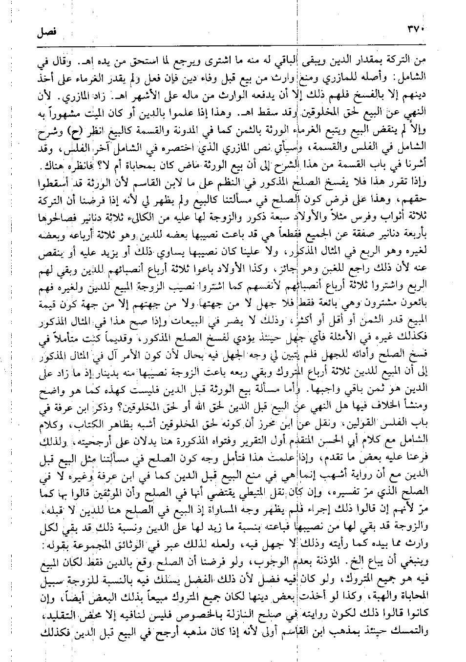 من التَّرِكَة بِمِقْدَار الدّين وَيبقى الْبَاقِي لَهُ مِنْهُ مَا اشْترى وَيرجع لما اسْتحق من يَده اه. وَقَالَ فِي الشَّامِل: وَأَصله للمازري وَمنع وَارِث من بيع قبل وَفَاء دين فَإِن فعل وَلم يقدر الْغُرَمَاء على أَخذ دينهم إِلَّا بِالْفَسْخِ فَلهم ذَلِك إِلَّا أَن يَدْفَعهُ الْوَارِث من مَاله على الْأَشْهر اه. زَاد الْمَازرِيّ. لِأَن النَّهْي عَن البيع لحق المخلوقين وَقد سقط اه. وَهَذَا إِذا علمُوا بِالدّينِ أَو كَانَ الْمَيِّت مَشْهُورا بِهِ وإلاَّ لم ينْقض البيع وَيتبع الْغُرَمَاء الْوَرَثَة بِالثّمن كَمَا فِي الْمُدَوَّنَة وَالْقِسْمَة كَالْبيع انْظُر (ح) وَشرح الشَّامِل فِي الْفلس وَالْقِسْمَة، وَسَيَأْتِي نَص الْمَازرِيّ الَّذِي اخْتَصَرَهُ فِي الشَّامِل آخر الْفلس، وَقد أَشَرنَا فِي بَاب الْقِسْمَة من هَذَا الشَّرْح إِلَى أَن بيع الْوَرَثَة مَاض كَانَ بمحاباة أم لَا؟ فَانْظُرْهُ هُنَاكَ. وَإِذا تقرر هَذَا فَلَا يفْسخ الصُّلْح الْمَذْكُور فِي النّظم على مَا لِابْنِ الْقَاسِم لِأَن الْوَرَثَة قد أسقطوا حَقهم، وَهَذَا على فرض كَون الصُّلْح فِي مَسْأَلَتنَا كَالْبيع وَلم يظْهر لي لِأَنَّهُ إِذا فَرضنَا أَن التَّرِكَة ثَلَاثَة أَثوَاب وَفرس مثلا وَالْأَوْلَاد سَبْعَة ذُكُور وَالزَّوْجَة لَهَا عَلَيْهِ من الكالىء ثَلَاثَة دَنَانِير فصالحوها بأَرْبعَة دَنَانِير صَفْقَة عَن الْجَمِيع فقطعاً هِيَ قد باعت نصِيبهَا بعضه للدّين وَهُوَ ثَلَاثَة أَرْبَاعه وَبَعضه لغيره وَهُوَ الرّبع فِي الْمِثَال الْمَذْكُور، وَلَا علينا كَانَ نصِيبهَا يُسَاوِي ذَلِك أَو يزِيد عَلَيْهِ أَو ينقص عَنهُ لِأَن ذَلِك رَاجع للغبن وَهُوَ جَائِز، وَكَذَا الْأَوْلَاد باعوا ثَلَاثَة أَربَاع أنصبائهم للدّين وَبَقِي لَهُم الرّبع واشتروا ثَلَاثَة أَربَاع أنصبائهم لأَنْفُسِهِمْ كَمَا اشْتَروا نصيب الزَّوْجَة الْمَبِيع للدّين وَلغيره فهم بائعون مشترون وَهِي بائعة فَقَط فَلَا جهل لَا من جِهَتهَا وَلَا من جهتهم إِلَّا من جِهَة كَون قيمَة الْمَبِيع قدر الثّمن أَو أقل أَو أَكثر، وَذَلِكَ لَا يضر فِي البيعات وَإِذا صَحَّ هَذَا فِي الْمِثَال الْمَذْكُور فَكَذَلِك غَيره فِي الْأَمْثِلَة فَأَي جهل حِينَئِذٍ يُؤَدِّي لفسخ الصُّلْح الْمَذْكُور، وقديماً كنت متأملاً فِي فسخ الصُّلْح وأدائه للْجَهْل فَلم يتَبَيَّن لي وَجه الْجَهْل فِيهِ بِحَال لِأَن كَون الْأَمر آل فِي الْمِثَال الْمَذْكُور إِلَى أَن الْمَبِيع للدّين ثَلَاثَة أَربَاع الْمَتْرُوك وَبَقِي ربعه باعت الزَّوْجَة نصِيبهَا مِنْهُ بِدِينَار إِذْ مَا زَاد على الدّين هُوَ ثمن بَاقِي واجبها. وَأما مَسْأَلَة بيع الْوَرَثَة قبل الدّين فَلَيْسَتْ كهذه كَمَا هُوَ وَاضح ومنشأ الْخلاف فِيهَا هَل النَّهْي عَن البيع قبل الدّين لحق الله أَو لحق المخلوقين؟ وَذكر ابْن عَرَفَة فِي بَاب الْفلس الْقَوْلَيْنِ، وَنقل عَن ابْن مُحرز أَن كَونه لحق المخلوقين أشبه بِظَاهِر الْكتاب، وَكَلَام الشَّامِل مَعَ كَلَام أبي الْحسن الْمُتَقَدّم أول التَّقْرِير وفتواه الْمَذْكُورَة هُنَا يدلان على أرجحيته، وَلذَلِك فرعنا عَلَيْهِ بعض مَا تقدم، وَإِذا علمت هَذَا فَتَأمل وَجه كَون الصُّلْح فِي مَسْأَلَتنَا مثل البيع قبل الدّين مَعَ أَن رِوَايَة أَشهب إِنَّمَا هِيَ فِي منع البيع قبل الدّين كَمَا فِي ابْن عَرَفَة وَغَيره لَا فِي الصُّلْح الَّذِي مرّ تَفْسِيره، وَإِن كَانَ نقل المتيطي يَقْتَضِي أَنَّهَا فِي الصُّلْح وَأَن الموثقين قَالُوا بهَا كَمَا مرّ لأَنهم إِن قَالُوا ذَلِك إِجْرَاء فَلم يظْهر وَجه الْمُسَاوَاة إِذْ البيع فِي الصُّلْح هُنَا للدّين لَا قبله، وَالزَّوْجَة قد بَقِي لَهَا من نصِيبهَا فباعته بِنِسْبَة مَا زيد لَهَا على الدّين وَنسبَة ذَلِك قد بَقِي لكل وَارِث مِمَّا بِيَدِهِ كَمَا رَأَيْته وَذَلِك