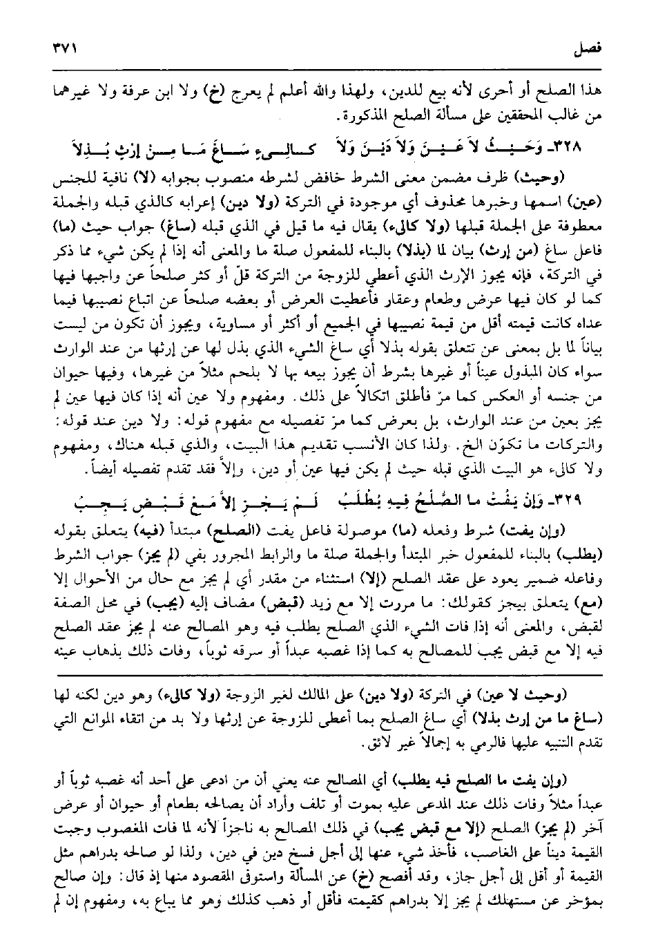 هَذَا الصُّلْح أَو أَحْرَى لِأَنَّهُ بيع للدّين، وَلِهَذَا وَالله أعلم لم يعرج (خَ) وَلَا ابْن عَرَفَة وَلَا غَيرهمَا من غَالب الْمُحَقِّقين على مَسْأَلَة الصُّلْح الْمَذْكُورَة. وَحَيْثُ لاَ عَيْنَ وَلاَ دَيْنَ وَلاَ كالِىءٍ سَاغَ مَا مِنْ إرْثٍ بُذِلاَ (وَحَيْثُ) ظرف مضمن معنى الشَّرْط خافض لشرطه مَنْصُوب بجوابه (لَا) نَافِيَة للْجِنْس (عين) اسْمهَا وخبرها مَحْذُوف أَي مَوْجُودَة فِي التَّرِكَة (وَلَا دين) إعرابه كَالَّذي قبله وَالْجُمْلَة معطوفة على الْجُمْلَة قبلهَا (وَلَا كالىء) يُقَال فِيهِ مَا قيل فِي الَّذِي قبله (سَاغَ) جَوَاب حَيْثُ (مَا) فَاعل سَاغَ (من إِرْث) بَيَان لما (بذلا) بِالْبِنَاءِ للْمَفْعُول صلَة مَا وَالْمعْنَى أَنه إِذا لم يكن شَيْء مِمَّا ذكر فِي التَّرِكَة فَإِنَّهُ يجوز الْإِرْث الَّذِي أعطي للزَّوْجَة من التَّرِكَة قلّ أَو كثر صلحا عَن واجبها فِيهَا كَمَا لَو كَانَ فِيهَا عرض وَطَعَام وعقار فَأعْطيت الْعرض أَو بعضه صلحا عَن اتِّبَاع نصِيبهَا فِيمَا عداهُ كَانَت قِيمَته أقل من قيمَة نصِيبهَا فِي الْجَمِيع أَو أَكثر أَو مُسَاوِيَة، وَيجوز أَن تكون من لَيست بَيَانا لما بل بِمَعْنى عَن تتَعَلَّق بقوله بذلا أَي سَاغَ الشَّيْء الَّذِي بذل لَهَا عَن إرثها من عِنْد الْوَارِث سَوَاء كَانَ المبذول عينا أَو غَيرهَا بِشَرْط أَن يجوز بَيْعه بهَا لَا بِلَحْم مثلا من غَيرهَا، وفيهَا حَيَوَان من جنسه أَو الْعَكْس كَمَا مرّ فَأطلق اتكالاً على ذَلِك. وَمَفْهُوم وَلَا عين أَنه إِذا كَانَ فِيهَا عين لم يجز بِعَين من عِنْد الْوَارِث، بل بِعرْض كَمَا مرّ تَفْصِيله مَعَ مَفْهُوم قَوْله: وَلَا دين عِنْد قَوْله: والتركات مَا تكوّن الخ. وَلذَا كَانَ الْأَنْسَب تَقْدِيم هَذَا الْبَيْت، وَالَّذِي قبله هُنَاكَ، وَمَفْهُوم وَلَا كالىء هُوَ الْبَيْت الَّذِي قبله حَيْثُ لم يكن فِيهَا عين أَو دين، وإلاَّ فقد تقدم تَفْصِيله أَيْضا. وَإنْ يَفُتْ مَا الصُّلْحُ فِيهِ يُطْلَبُ لَمْ يَجْزِ إلاَّ مَعْ قَبْضٍ يَجِبُ (وَإِن يفت) شَرط وَفعله (مَا) مَوْصُولَة فَاعل يفت (الصُّلْح) مُبْتَدأ (فِيهِ) يتَعَلَّق بقوله (يطْلب) بِالْبِنَاءِ للْمَفْعُول خبر الْمُبْتَدَأ وَالْجُمْلَة صلَة مَا والرابط الْمَجْرُور بفي (لم يجز) جَوَاب الشَّرْط وفاعله ضمير يعود على عقد الصُّلْح (إِلَّا) اسْتثِْنَاء من مُقَدّر أَي لم يجز مَعَ حَال من الْأَحْوَال إِلَّا (مَعَ) يتَعَلَّق بيجز كَقَوْلِك: مَا مَرَرْت إِلَّا مَعَ زيد (قبض) مُضَاف إِلَيْهِ (يجب) فِي مَحل الصّفة لقبض، وَالْمعْنَى أَنه إِذا فَاتَ الشَّيْء الَّذِي الصُّلْح يطْلب فِيهِ وَهُوَ الْمصَالح عَنهُ لم يجز عقد الصُّلْح فِيهِ إِلَّا مَعَ قبض يجب للْمصَالح بِهِ كَمَا إِذا غصبه عبدا أَو سَرقه ثوبا، وَفَاتَ ذَلِك بذهاب عينه