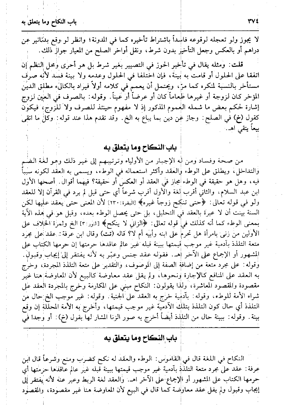 من صِحَة وَفَسَاد وَمن لَهُ الْإِجْبَار من الْأَوْلِيَاء وترتيبهم إِلَى غير ذَلِك وَهُوَ لُغَة الضَّم والتداخل، وَيُطلق على الْوَطْء وَالْعقد وَأكْثر اسْتِعْمَاله فِي الْوَطْء، وَيُسمى بِهِ العقد لكَونه سَببا فِيهِ، وَهل هُوَ حَقِيقَة فِي الْوَطْء مجَاز فِي العقد أَو الْعَكْس أَو حَقِيقَة؟ فيهمَا أَقْوَال. أَصَحهَا الأول ابْن عبد السَّلَام، وَالثَّانِي أقرب لُغَة وَالْأول أقرب شرعا أَي حَتَّى قيل لم يرد فِي الْقُرْآن إِلَّا للْعقد وَلَو فِي قَوْله تَعَالَى: حَتَّى تنْكح زوجا غَيره} (الْبَقَرَة: 230) لِأَن الْمَعْنى حَتَّى يعْقد عَلَيْهَا لَكِن السّنة بيّنت أَن لَا عِبْرَة بِالْعقدِ فِي التَّحْلِيل، بل حَتَّى يحصل الْوَطْء بعده، وَقيل هُوَ فِي هَذِه الْآيَة بِمَعْنى الْوَطْء كَمَا أَنه كَذَلِك فِي قَوْله تَعَالَى: الزَّانِي لَا ينْكح} (النُّور: 3) الخ وَثَمَرَة الْخلاف على الْأَوَّلين من زنى بِامْرَأَة هَل تحرم على ابْنه وَأَبِيهِ أم لَا؟ قَالَه (تت) وَقَالَ ابْن عَرَفَة: عقد على مُجَرّد مُتْعَة التَّلَذُّذ بآدمية غير مُوجب قيمتهَا بِبَيِّنَة قبله غير عَالم عاقدها حرمتهَا إِن حرمهَا الْكتاب على الْمَشْهُور أَو الْإِجْمَاع على الآخر اه. فَقَوله عقد جنس وعبّر بِهِ لِأَنَّهُ يفْتَقر إِلَى إِيجَاب وَقبُول. وَقَوله: على مُجَرّد مُتْعَة من إِضَافَة الصّفة إِلَى الْمَوْصُوف، وَالتَّقْدِير على مُتْعَة التَّلَذُّذ الْمُجَرَّدَة، وَخرج بِهِ العقد على الْمَنَافِع كَالْإِجَارَةِ وَنَحْوهَا، وَلم يقل عقد مُعَاوضَة كَالْبيع لِأَن الْمُعَاوضَة هُنَا غير مَقْصُودَة وَالْمَقْصُود المعاشرة، وَلذَا يَقُولُونَ: النِّكَاح مَبْنِيّ على المكارمة وَخرج بالمجردة العقد على شِرَاء الْأمة للْوَطْء، وَقَوله: بآدمية خرج بِهِ العقد على الجنية. وَقَوله: غير مُوجب الخ حَال من التَّلَذُّذ أَي حَال كَون التَّلَذُّذ بِتِلْكَ الْآدَمِيَّة غير مُوجب قيمتهَا، وَأخرج بِهِ الْأمة المحللة إِن وَقع بَيِّنَة. وَقَوله: بِبَيِّنَة حَال من التَّلَذُّذ أَيْضا أخرج بِهِ صور الزِّنَا الْمشَار لَهَا بقول (خَ) : أَو وجدا فِي