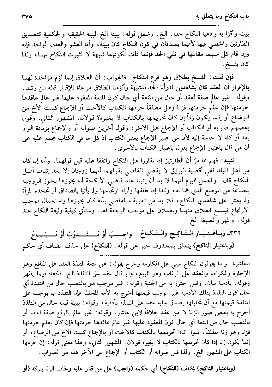 بَيت وأقرّا بِهِ وادعيا النِّكَاح حدا. الخ. وَشَمل قَوْله: بِبَيِّنَة الخ الْبَيِّنَة الْحَقِيقِيَّة والحكمية كتصديق الطارئين والخصي فِيهَا لِأَنَّهُمَا يصدقان فِي كَون النِّكَاح كَانَ بِبَيِّنَة، وَأما الفشو وَالْعدْل الْوَاحِد فَإِنَّهُ وَإِن قَامَ كل مِنْهُمَا مقَامهَا فِي نفي الْحَد فَإِنَّمَا ذَلِك لِكَوْنِهِمَا شُبْهَة لَا لثُبُوت النِّكَاح بهما، وَلذَا كَانَ يفْسخ. فَإِن قلت: الْفَسْخ بِطَلَاق وَهُوَ فرع النِّكَاح. فَالْجَوَاب: أَن الطَّلَاق إِنَّمَا لزم مُؤَاخذَة لَهما بِالْإِقْرَارِ أَن العقد كَانَ بِشَاهِدين فدرأنا الْحَد للشُّبْهَة وألزمنا الطَّلَاق مُرَاعَاة للإقرار قَالَه ابْن رشد. وَقَوله: غير عَالم صفة لعقد أَو حَال من الْمُتْعَة أَي حَال كَون الْمُتْعَة الْمَعْقُود عَلَيْهَا غير عَالم عاقدها حرمتهَا فَإِن علم حرمتهَا فزنا وَهل مُطلقًا حرمهَا الْكتاب كالأخت أَو الْإِجْمَاع كَبِنْت الْأَخ من الرَّضَاع أَو إِنَّمَا يكون زنا إِن كَانَ تَحْرِيمهَا بِالْكتاب لَا بِغَيْرِهِ؟ قَولَانِ. الْمَشْهُور الثَّانِي. وَقَول بَعضهم صَوَابه أَو الْكتاب أَو الْإِجْمَاع على الآخر، وَقَول آخَرين صَوَابه أَو وَالْإِجْمَاع بِزِيَادَة الْوَاو بعد أَو كُله لَا حَاجَة إِلَيْهِ لِأَن من اعْتبر الْإِجْمَاع يعْتَبر الْكتاب إِذْ كل مَا فِي الْكتاب مجمع عَلَيْهِ على أَن من قَالَ بِاعْتِبَار الْإِجْمَاع يَقُول بِاعْتِبَار الْكتاب بالأحرى. تَنْبِيه: فهم مِمَّا مرّ أَن الطارئين إِذا تقاررا على النِّكَاح واتفقا عَلَيْهِ قبل قَوْلهمَا، وَأما إِن كَانَا من أهل الْبَلَد فَفِي أقضية الْبُرْزُليّ لَا يقْضِي القَاضِي بقولهمَا أَنَّهُمَا زوجان إِلَّا بعد إِثْبَات أصل النِّكَاح قَالَ: وَالْعَمَل الْيَوْم أَنَّهُمَا لَا بُد أَن يثبتا عِنْد قَاضِي الْأَنْكِحَة أَنه يحوزها بحوز الزَّوْجِيَّة بِجَمَاعَة من الْموضع الَّذِي هما بِهِ، وَكَذَا إِذا طَلقهَا وَأَرَادَ ارتجاعها وَلم يأتيا بِالصَّدَاقِ أَو تجحده الْمَرْأَة وَلم يعثرا على شَاهِدي النِّكَاح، فَلَا بُد من تَعْرِيف القَاضِي بِأَنَّهُ كَانَ يحوزها وَاسْتِعْمَال مُوجب الارتجاع فَيسمع الطَّلَاق مِنْهُمَا ويعملان على مُوجب الرّجْعَة اه. وَسَتَأْتِي كَيْفيَّة وَثِيقَة النِّكَاح عِنْد قَوْله: وَالْمهْر والصيغة الخ. وَبِاعْتبَارِ النَّاكِحِ والنِّكَاحُ واجِبٌ أَوْ مَنْدوُبٌ أَوْ مُبَاحُ (وَبِاعْتِبَار الناكح) يتَعَلَّق بِمَحْذُوف خبر عَن قَوْله. (النِّكَاح) على حذف مُضَاف أَي حكم
