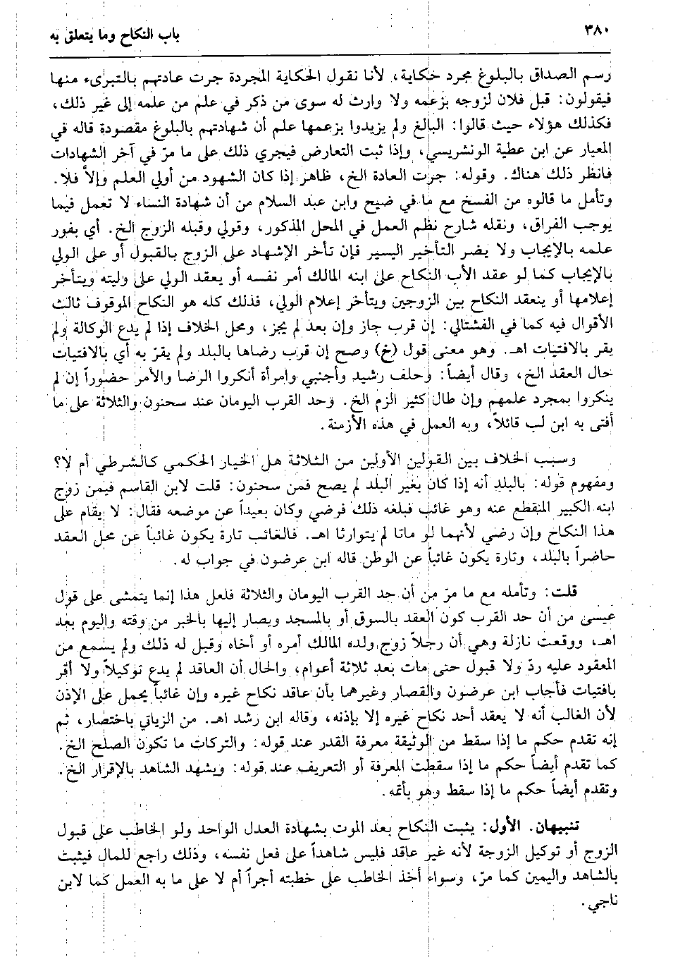 رسم الصَدَاق بِالْبُلُوغِ مُجَرّد حِكَايَة، لأَنا نقُول الْحِكَايَة الْمُجَرَّدَة جرت عَادَتهم بالتبرىء مِنْهَا فَيَقُولُونَ: قبل فلَان لزوجه بِزَعْمِهِ وَلَا وَارِث لَهُ سوى من ذكر فِي علم من علمه إِلَى غير ذَلِك، فَكَذَلِك هَؤُلَاءِ حَيْثُ قَالُوا: الْبَالِغ وَلم يزِيدُوا بزعمها علم أَن شَهَادَتهم بِالْبُلُوغِ مَقْصُودَة قَالَه فِي المعيار عَن ابْن عَطِيَّة الونشريسي، وَإِذا ثَبت التَّعَارُض فَيجْرِي ذَلِك على مَا مرّ فِي آخر الشَّهَادَات فَانْظُر ذَلِك هُنَاكَ. وَقَوله: جرت الْعَادة الخ، ظَاهر إِذا كَانَ الشُّهُود من أولي الْعلم وإلاَّ فَلَا. وَتَأمل مَا قَالُوهُ من الْفَسْخ مَعَ مَا فِي ضيح وَابْن عبد السَّلَام من أَن شَهَادَة النِّسَاء لَا تعْمل فِيمَا يُوجب الْفِرَاق، وَنَقله شَارِح نظم الْعَمَل فِي الْمحل الْمَذْكُور، وَقَوْلِي وَقَبله الزَّوْج الخ. أَي بفور علمه بِالْإِيجَابِ وَلَا يضر التَّأْخِير الْيَسِير فَإِن تَأَخّر الْإِشْهَاد على الزَّوْج بِالْقبُولِ أَو على الْوَلِيّ بِالْإِيجَابِ كَمَا لَو عقد الْأَب النِّكَاح على ابْنه الْمَالِك أَمر نَفسه أَو يعْقد الْوَلِيّ على وليته ويتأخر إعلامها أَو ينْعَقد النِّكَاح بَين الزَّوْجَيْنِ ويتأخر إِعْلَام الْوَلِيّ، فَذَلِك كُله هُوَ النِّكَاح الْمَوْقُوف ثَالِث الْأَقْوَال فِيهِ كَمَا فِي الفشتالي: إِن قرب جَازَ وَإِن بعد لم يجز، وَمحل الْخلاف إِذا لم يدع الْوكَالَة وَلم يقر بالافتيات اه. وَهُوَ معنى قَول (خَ) وَصَحَّ إِن قرب رِضَاهَا بِالْبَلَدِ وَلم يقرّ بِهِ أَي بالافتيات حَال العقد الخ، وَقَالَ أَيْضا: وَحلف رشيد وأجنبي وَامْرَأَة أَنْكَرُوا الرِّضَا وَالْأَمر حضوراً إِن لم ينكروا بِمُجَرَّد علمهمْ وَإِن طَال كثير الزم الخ. وحد الْقرب اليومان عِنْد سَحْنُون وَالثَّلَاثَة على مَا أفتى بِهِ ابْن لب قَائِلا، وَبِه الْعَمَل فِي هَذِه الْأَزْمِنَة. وَسبب الْخلاف بَين الْقَوْلَيْنِ الْأَوَّلين من الثَّلَاثَة هَل الْخِيَار الْحكمِي كالشرطي أم لَا؟ وَمَفْهُوم قَوْله: بِالْبَلَدِ أَنه إِذا كَانَ بِغَيْر الْبَلَد لم يَصح فَمن سَحْنُون: قلت لِابْنِ الْقَاسِم فِيمَن زوج ابْنه الْكَبِير الْمُنْقَطع عَنهُ وَهُوَ غَائِب فَبَلغهُ ذَلِك فَرضِي وَكَانَ بَعيدا عَن مَوْضِعه فَقَالَ: لَا يُقَام على هَذَا النِّكَاح وَإِن رَضِي لِأَنَّهُمَا لَو مَاتَا لم يتوارثا اه. فالغائب تَارَة يكون غَائِبا عَن مَحل العقد حَاضرا بِالْبَلَدِ، وَتارَة يكون غَائِبا عَن الوطن قَالَه ابْن عرضون فِي جَوَاب لَهُ. قلت: وتأمله مَعَ مَا مرّ من أَن حد الْقرب اليومان وَالثَّلَاثَة فَلَعَلَّ هَذَا إِنَّمَا يتمشى على قَول عِيسَى من أَن حد الْقرب كَون العقد بِالسوقِ أَو بِالْمَسْجِدِ ويصار إِلَيْهَا بالْخبر من وقته وَالْيَوْم بعد اه، وَوَقعت نازلة وَهِي أَن رجلا زوج وَلَده الْمَالِك أمره أَو أَخَاهُ وَقبل لَهُ ذَلِك وَلم يسمع من الْمَعْقُود عَلَيْهِ ردّ وَلَا قبُول حَتَّى مَاتَ بعد ثَلَاثَة أَعْوَام، وَالْحَال أَن الْعَاقِد لم يدع توكيلاً وَلَا أقرّ بافتيات فَأجَاب ابْن عرضون والقصار وَغَيرهمَا بِأَن عَاقد نِكَاح غَيره وَإِن غَائِبا يحمل على الْإِذْن لِأَن الْغَالِب أَنه لَا يعْقد أحد نِكَاح غَيره إِلَّا بِإِذْنِهِ، وَقَالَهُ ابْن رشد اه. من الزياتي بِاخْتِصَار، ثمَّ إِنَّه تقدم حكم مَا إِذا سقط من الْوَثِيقَة معرفَة الْقدر عِنْد قَوْله: والتركات مَا تكون الصُّلْح الخ. كَمَا تقدم أَيْضا حكم مَا إِذا سَقَطت الْمعرفَة أَو التَّعْرِيف عِنْد قَوْله: وَيشْهد الشَّاهِد بِالْإِقْرَارِ الخ. وَتقدم أَيْضا حكم مَا إِذا سقط وَهُوَ بأتمه. تَنْبِيهَانِ. الأول: يثبت النِّكَاح بعد الْمَوْت بِشَهَادَة الْعدْل الْوَاحِد وَلَو الْخَاطِب على قبُول الزَّوْج أَو تَوْكِيل الزَّوْجَة لِأَنَّهُ غير عَاقد فَلَيْ