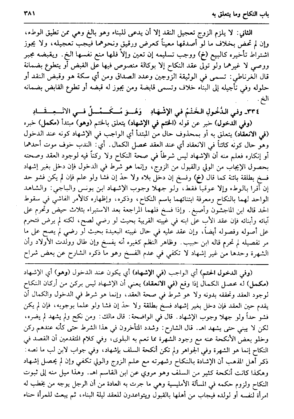 الثَّانِي: لَا يلْزم الزَّوْج تَعْجِيل النَّقْد إِلَّا أَن يدعى للْبِنَاء وَهُوَ بَالغ وَهِي مِمَّن تطِيق الْوَطْء، وَإِن لم تَحض بِخِلَاف مَا لَو أصدقهَا معينا كعرض ورقيق وَنَحْوهمَا فَيجب تَعْجِيله، وَلَا يجوز اشْتِرَاط تَأْخِيره كَالْبيع (خَ) وَوَجَب تَسْلِيمه إِن تعين وإلاَّ فلهَا منع نَفسهَا الخ. ويقبضه مجبر ووصي لَا غَيرهمَا وَلَو تولى عقد النِّكَاح إِلَّا بوكالة مَنْصُوص فِيهَا على الْقَبْض أَو يتَطَوَّع بضمانة قَالَ الغرناطي: تسمى فِي الْوَثِيقَة الزَّوْجَيْنِ وَعدد الصَدَاق وَمن أَي سكَّة هُوَ وَقبض النَّقْد أَو حُلُوله وَفِي تَأْجِيله إِلَى الْبناء خلاف وَتسَمى قابضة وَمن يجوز لَهُ قَبضه أَو تطوع الْقَابِض بضمانه الخ. وَفِي الدُّخُولِ الخَتْمُ فِي الإشْهَادِ وَهُوَ مُكَمِّلٌ فِي الانْعِقَادِ (وَفِي الدُّخُول) خبر عَن قَوْله (الْخَتْم فِي الْإِشْهَاد) يتَعَلَّق بالختم (وَهُوَ) مُبْتَدأ (مكمل) خَبره (فِي الِانْعِقَاد) يتَعَلَّق بِهِ أَو بِمَحْذُوف حَال من الْمُبْتَدَأ أَي الْوَاجِب فِي الْإِشْهَاد كَونه عِنْد الدُّخُول وَهُوَ حَال كَونه كَائِنا فِي الِانْعِقَاد أَي عِنْد العقد مُحَصل الْكَمَال. أَي: النّدب خوف موت أَحدهمَا أَو إِنْكَاره فَعلم مِنْهُ أَن الْإِشْهَاد لَيْسَ شرطا فِي صِحَة النِّكَاح وَلَا ركنا فِيهِ لوُجُود العقد وَصِحَّته بِحُصُول الْإِيجَاب من الْوَلِيّ وَالْقَبُول من الزَّوْج، وَإِنَّمَا هُوَ شَرط فِي الدُّخُول فَإِن دخل بِغَيْر إِشْهَاد فسخ بِطَلْقَة بَائِنَة كَمَا قَالَ (خَ) وَفسخ إِن دخل بلاه وَلَا حدّ إِن فَشَا وَلَو علم فَإِن لم يكن فشو حد إِن أقرا بِالْوَطْءِ وَإِلَّا عوقبا فَقَط، وَلَو جهلا وجوب الْإِشْهَاد ابْن يُونُس والباجي: وَالشَّاهِد الْوَاحِد لَهما بِالنِّكَاحِ وَمَعْرِفَة ابتنائهما باسم النِّكَاح، وَذكره، وإظهاره كالأمر الفاشي فِي سُقُوط الْحَد قَالَه ابْن الْمَاجشون وَأصبغ. وَإِذا فسخ فَلَهُمَا الْمُرَاجَعَة بعد الِاسْتِبْرَاء بِثَلَاث حيض وَتحرم على آبَائِهِ وأبنائه فَإِن عقد الْأَب على ابْنه فِي غيبته الْقَرِيبَة بِحَيْثُ لَو رَضِي لصَحَّ، لكنه لم يرض فَتحرم على أُصُوله وفصوله أَيْضا، وَإِن عقد عَلَيْهِ فِي حَال غيبته الْبَعِيدَة بِحَيْثُ لَو رَضِي لم يَصح على مَا مر تَفْصِيله لم تحرم قَالَه ابْن حبيب. وَظَاهر النّظم كَغَيْرِهِ أَنه يفْسخ وَإِن طَال وَولدت الْأَوْلَاد وَأَن الشُّهْرَة وَحدهَا من غير إِشْهَاد لَا تَكْفِي فِي عدم الْفَسْخ وَهُوَ مَا ذكره الشَّارِح عَن بعض شرَّاح