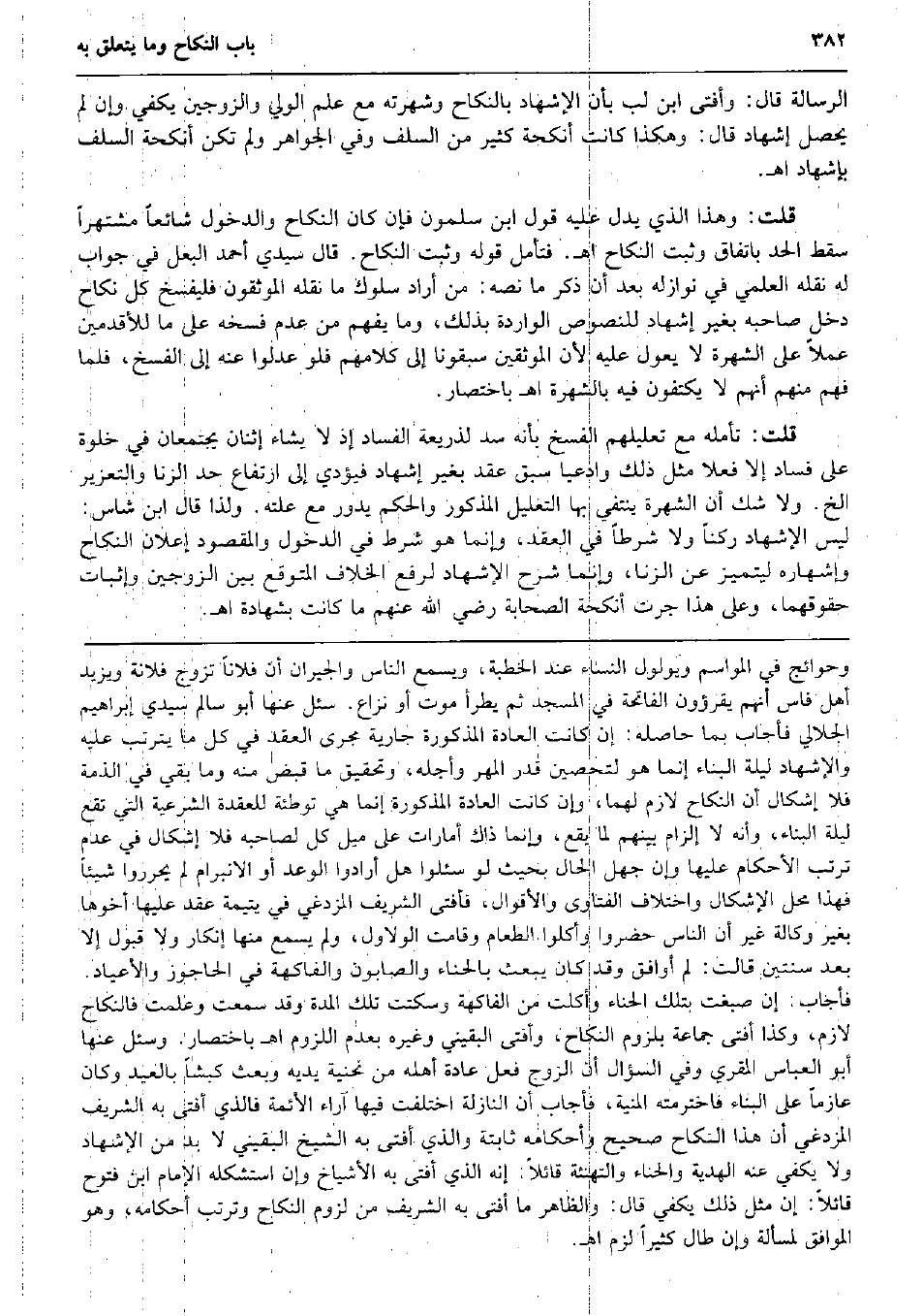 الرسَالَة قَالَ: وَأفْتى ابْن لب بِأَن الْإِشْهَاد بِالنِّكَاحِ وشهرته مَعَ علم الْوَلِيّ والزوجين يَكْفِي وَإِن لم يحصل إِشْهَاد قَالَ: وَهَكَذَا كَانَت أنكحة كثير من السّلف وَفِي الْجَوَاهِر وَلم تكن أنكحة السّلف بإشهاد اه. قلت: وَهَذَا الَّذِي يدل عَلَيْهِ قَول ابْن سَلمُون فَإِن كَانَ النِّكَاح وَالدُّخُول شَائِعا مشتهراً سقط الْحَد بِاتِّفَاق وَثَبت النِّكَاح اه. فَتَأمل قَوْله وَثَبت النِّكَاح. قَالَ سَيِّدي أَحْمد البعل فِي جَوَاب لَهُ نَقله العلمي فِي نوازله بعد أَن ذكر مَا نَصه: من أَرَادَ سلوك مَا نَقله الْمُوثقُونَ فليفسخ كل نِكَاح دخل صَاحبه بِغَيْر إِشْهَاد للنصوص الْوَارِدَة بذلك، وَمَا يفهم من عدم فَسخه على مَا للأقدمين عملا على الشُّهْرَة لَا يعول عَلَيْهِ لِأَن الموثقين سبقُونَا إِلَى كَلَامهم فَلَو عدلوا عَنهُ إِلَى الْفَسْخ، فَلَمَّا فهم مِنْهُم أَنهم لَا يكتفون فِيهِ بالشهرة اه بِاخْتِصَار. قلت: تَأمله مَعَ تَعْلِيلهم الْفَسْخ بِأَنَّهُ سد لذريعة الْفساد إِذْ لَا يَشَاء إثنان يَجْتَمِعَانِ فِي خلْوَة على فَسَاد إِلَّا فعلا مثل ذَلِك وادعيا سبق عقد بِغَيْر إِشْهَاد فَيُؤَدِّي إِلَى ارْتِفَاع حد الزِّنَا وَالتَّعْزِير الخ. وَلَا شكّ أَن الشُّهْرَة يَنْتَفِي بهَا التَّعْلِيل الْمَذْكُور وَالْحكم يَدُور مَعَ علته. وَلذَا قَالَ ابْن شَاس: لَيْسَ الْإِشْهَاد ركنا وَلَا شرطا فِي العقد، وَإِنَّمَا هُوَ شَرط فِي الدُّخُول وَالْمَقْصُود إعلان النِّكَاح وإشهاره ليتميز عَن الزِّنَا، وَإِنَّمَا شرح الْإِشْهَاد لرفع الْخلاف المتوقع بَين الزَّوْجَيْنِ وَإِثْبَات حقوقهما، وعَلى هَذَا جرت أنكحة الصَّحَابَة رَضِي الله عَنْهُم مَا كَانَت بِشَهَادَة اه.