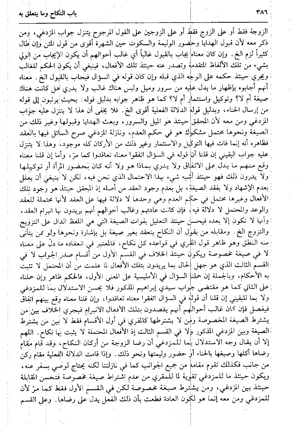 الزَّوْجَة فَقَط أَو على الزَّوْج فَقَط أَو على الزَّوْجَيْنِ على القَوْل الْمَرْجُوح يتنزل جَوَاب المزدغي، وَمن ذكر مَعَه لِأَن قبُول الْهَدَايَا وَحُضُور الْوَلِيمَة وَالسُّكُوت حِين الشُّهْرَة أقوى من قَول الْمَتْن وَإِن طَال كثيرا لزم الخ. وَإِن كَانَ مَعْنَاهُ يُجَاب بِالْقبُولِ غَالِبا أَي غَالب أَحْوَالهم أَن يكون الْإِيجَاب من الْوَلِيّ بِشَيْء من تِلْكَ الْأَلْفَاظ الْمُتَقَدّمَة وتصدر عَنهُ حِينَئِذٍ تِلْكَ الْأَفْعَال، فَيَنْبَغِي أَن يكون الحكم للْغَالِب وَيجْرِي حِينَئِذٍ حكمه على الْوَجْه الَّذِي قبله وَإِن كَانَ قَوْله فِي السُّؤَال فيجاب بِالْقبُولِ الخ. مَعْنَاهُ أَنهم أجابوه بِإِظْهَار مَا يدل عَلَيْهِ من سرُور وميل وَلَيْسَ هُنَاكَ غَالب وَلَا يدْرِي هَل كَانَت هُنَاكَ صِيغَة أم لَا؟ وتوكيل واستئمار أم لَا؟ كَمَا هُوَ ظَاهر جَوَابه بِدَلِيل قَوْله: بِحَيْثُ يرتبون إِلَى قَوْله من إرْسَال الْحِنَّاء، وبدليل قَوْله الدّلَالَة الفعلية أقوى الخ. فَلَا يخفى أَن هَذَا لَا يتنزل عَلَيْهِ جَوَاب المزدغي وَمن مَعَه لِأَن الْمُحَقق حِينَئِذٍ هُوَ الْميل وَالسُّرُور، وَبعث الْهَدَايَا وقبولها وَغير ذَلِك من الصِّيغَة وَنَحْوهَا مُحْتَمل مَشْكُوك هُوَ فِي حكم الْعَدَم، ونازلة المزدغي صرح السَّائِل فِيهَا بِالْعقدِ فَظَاهره أَنه إِنَّمَا فَاتَ فِيهَا التَّوْكِيل والاستئمار وَغير ذَلِك من الْأَركان كُله مَوْجُود، وَهَذَا لَا يتنزل عَلَيْهِ جَوَاب اليقيني إِن قُلْنَا أَن قَوْله فِي السُّؤَال اتَّفقُوا مَعْنَاهُ تعاقدوا كَمَا مرّ، وَأما إِن قُلْنَا مَعْنَاهُ وَقع مِنْهُم مَا يدل على الِاتِّفَاق وَلَا يدْرِي بِمَاذَا هُوَ وَلَا أَنه كَانَ بِحُضُور الْمَرْأَة أَو توكيلها وَلَا يَدْرُونَ ذَلِك فَهُوَ حِينَئِذٍ أشبه شَيْء بِهَذَا الِاحْتِمَال الَّذِي نَحن فِيهِ، لَكِن لَا يَنْبَغِي أَن يُعلل بِعَدَمِ الْإِشْهَاد وَلَا بفقد الصِّيغَة، بل بِعَدَمِ وجود العقد من أَصله إِذْ الْمُحَقق حِينَئِذٍ هُوَ وجود تِلْكَ الْأَفْعَال وَغَيرهَا مُحْتَمل فِي حكم الْعَدَم وَهِي وَحدهَا لَا دلَالَة فِيهَا على العقد لِأَنَّهَا مُحْتَملَة للْعقد والوعد والمحتمل لَا دلَالَة فِيهِ، فَإِن كَانَت عَادَتهم وغالب أَحْوَالهم أَنهم يُرِيدُونَ بهَا انبرام العقد، وَأَنَّهَا لَا تكون إِلَّا بعده فَيحسن حِينَئِذٍ التَّعْلِيل بِفَوَات الصِّيغَة الَّتِي هِيَ اللَّفْظ الدَّال على التَّزْوِيج والتزوج الخ. وَمُقَابِله من يَقُول أَن النِّكَاح ينْعَقد بِغَيْر صِيغَة بل بِإِشَارَة وَنَحْوهَا وَلَو مِمَّن يَتَأَتَّى مِنْهُ النُّطْق وَهُوَ ظَاهر قَول الْمقري فِي قَوَاعِده كل نِكَاح، فَالْمُعْتَبر فِي انْعِقَاده مَا دلّ على مَعْنَاهُ لَا فِي صِيغَة مَخْصُوصَة وَيكون حِينَئِذٍ الْخلاف فِي الْقسم الأول من أَقسَام صدر الْجَواب لَا فِي الْقسم الثَّالِث الَّذِي هُوَ جهل الْحَال بِمَا يُرِيدُونَ بِتِلْكَ الْأَفْعَال لما علمت من أَن الْمُحْتَمل لَا تثبت بِهِ الْأَحْكَام، وَبِالْجُمْلَةِ إِن حملنَا السُّؤَال فِي الأمليسية على الْمَعْنى الأول، فَالْحكم ظَاهر وَإِن حملناه على الثَّانِي كَمَا هُوَ مُقْتَضى جَوَاب سَيِّدي إِبْرَاهِيم الْمَذْكُور فَلَا يحسن الِاسْتِدْلَال بِمَا للمزدغي وَلَا بِمَا للبقيني إِن قُلْنَا أَن قَوْله فِي السُّؤَال اتَّفقُوا مَعْنَاهُ تعاقدوا، وَإِن قُلْنَا مَعْنَاهُ وَقع بَينهم اتِّفَاق فيفصل فَإِن كَانَ غَالب أَحْوَالهم أَنهم يقصدون بِتِلْكَ الْأَفْعَال الانبرام فَيجْرِي الْخلاف بَين من يشْتَرط الصِّيغَة الْمَخْصُوصَة وَمن لَا يشترطها كالمقري فِي أول الْأَقْسَام فَقَط لَا بَين من يشْتَرط الصِّيغَة وَبَين المزدغي الْمَذْكُور وَلَا فِي الْقسم الثَّالِث إِذْ الْأَفْعَال المحتملة لَا يثبت بهَا نِكَاح. 
