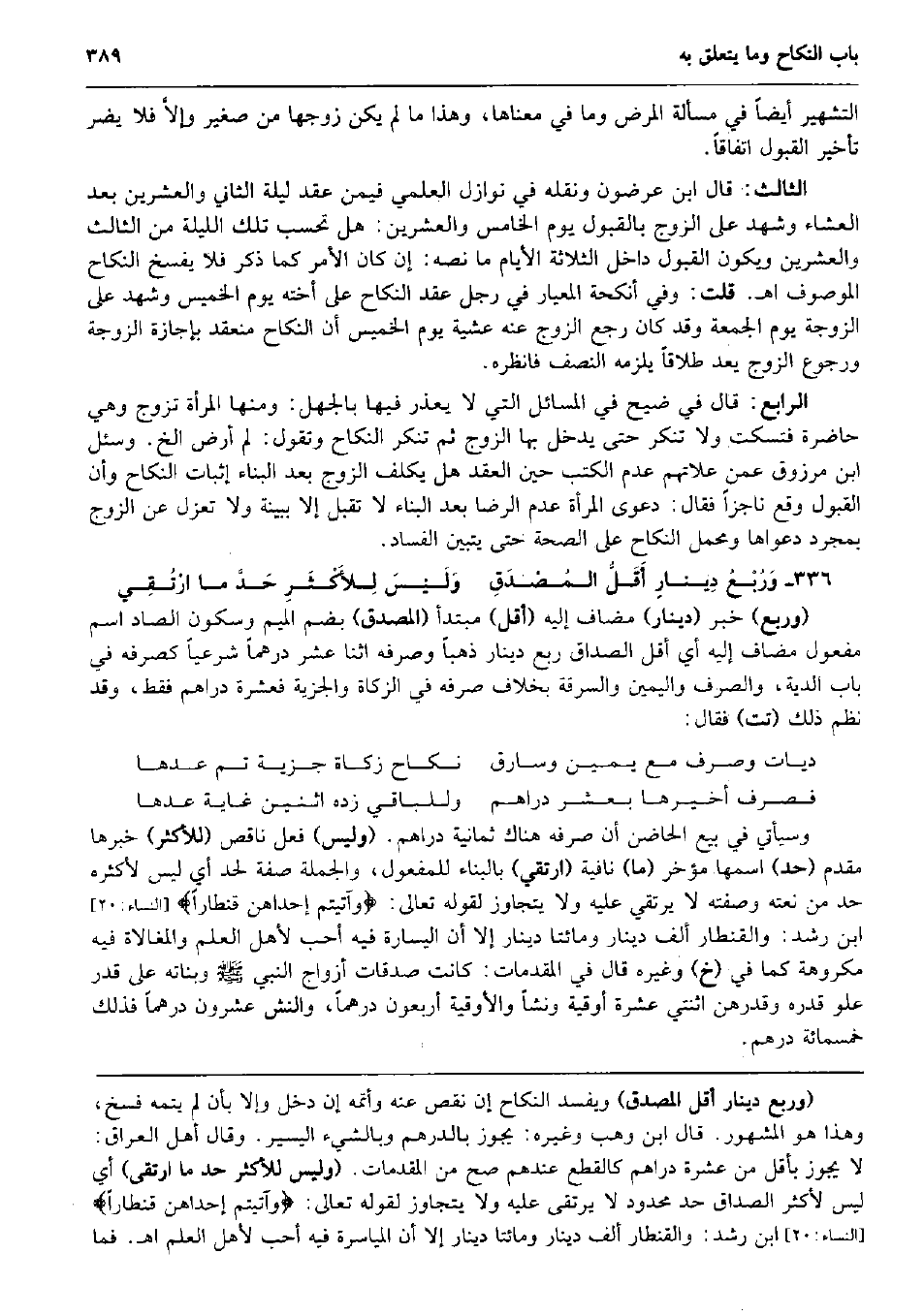 التشهير أَيْضا فِي مَسْأَلَة الْمَرَض وَمَا فِي مَعْنَاهَا وَهَذَا مَا لم يكن زَوجهَا من صَغِير وإلاَّ فَلَا يضر تَأْخِير الْقبُول اتِّفَاقًا. الثَّالِث: قَالَ ابْن عرضون وَنَقله فِي نَوَازِل العلمي فِيمَن عقد لَيْلَة الثَّانِي وَالْعِشْرين بعد الْعشَاء وَشهد على الزَّوْج بِالْقبُولِ يَوْم الْخَامِس وَالْعِشْرين: هَل تحسب تِلْكَ اللَّيْلَة من الثَّالِث وَالْعِشْرين وَيكون الْقبُول دَاخل الثَّلَاثَة الْأَيَّام مَا نَصه: إِن كَانَ الْأَمر كَمَا ذكر فَلَا يفْسخ النِّكَاح الْمَوْصُوف اه. قلت: وَفِي أنكحة المعيار فِي رجل عقد النِّكَاح على أُخْته يَوْم الْخَمِيس وَشهد على الزَّوْجَة يَوْم الْجُمُعَة وَقد كَانَ رَجَعَ الزَّوْج عَنهُ عَشِيَّة يَوْم الْخَمِيس أَن النِّكَاح مُنْعَقد بِإِجَازَة الزَّوْجَة وَرُجُوع الزَّوْج يعد طَلَاقا يلْزمه النّصْف فَانْظُرْهُ. الرَّابِع: قَالَ فِي ضيح فِي الْمسَائِل الَّتِي لَا يعْذر فِيهَا بِالْجَهْلِ: وَمِنْهَا الْمَرْأَة تزوج وَهِي حَاضِرَة فتسكت وَلَا تنكر حَتَّى يدْخل بهَا الزَّوْج ثمَّ تنكر النِّكَاح وَتقول: لم أَرض الخ. وَسُئِلَ ابْن مَرْزُوق عَمَّن علاتهم عدم الْكتب حِين العقد هَل يُكَلف الزَّوْج بعد الْبناء إِثْبَات النِّكَاح وَأَن الْقبُول وَقع ناجزاً فَقَالَ: دَعْوَى الْمَرْأَة عدم الرِّضَا بعد الْبناء لَا تقبل إِلَّا بِبَيِّنَة وَلَا تعزل عَن الزَّوْج بِمُجَرَّد دَعْوَاهَا ومحمل النِّكَاح على الصِّحَّة حَتَّى يتَبَيَّن الْفساد. وَرُبْعُ دِينارٍ أَقَلُّ المُصْدَقِ وَلَيْسَ لِلأَكْثَرِ حَدَّ مَا ارْتُقِي (وَربع) خبر (دِينَار) مُضَاف إِلَيْهِ (أقل) مُبْتَدأ (الْمُصدق) بِضَم الْمِيم وَسُكُون الصَّاد اسْم مفعول مُضَاف إِلَيْهِ أَي أقل الصَدَاق ربع دِينَار ذَهَبا وَصَرفه اثْنَا عشر درهما شَرْعِيًّا كصرفه فِي بَاب الدِّيَة، وَالصرْف وَالْيَمِين وَالسَّرِقَة بِخِلَاف صرفه فِي الزَّكَاة والجزية فعشرة دَرَاهِم فَقَط، وَقد نظم ذَلِك (تت) فَقَالَ: ديات وَصرف مَعَ يَمِين وسارق نِكَاح زَكَاة جِزْيَة تمّ عدهَا فصرف أخيرها بِعشر دَرَاهِم وللباقي زده اثْنَيْنِ غَايَة عدهَا وَسَيَأْتِي فِي بيع الحاضن أَن صرفه هُنَاكَ ثَمَانِيَة دَرَاهِم. (وَلَيْسَ) فعل نَاقص (للْأَكْثَر) خَبَرهَا مقدم (حد) اسْمهَا مُؤخر (مَا) نَافِيَة (ارتقي) بِالْبِنَاءِ للْمَفْعُول، وَالْجُمْلَة صفة لحد أَي لَيْسَ لأكثره حد من نَعته وَصفته لَا يرتقي عَلَيْهِ وَلَا يتَجَاوَز لقَوْله تَعَالَى: وَآتَيْتُم إِحْدَاهُنَّ قِنْطَارًا} (النِّسَاء: 20) ابْن رشد: وَالْقِنْطَار ألف دِينَار وَمِائَتَا دِينَار إِلَّا أَن اليسارة فِيهِ أحب لأهل الْعلم والمغالاة فِيهِ مَكْرُوهَة كَمَا فِي (خَ) وَغَيره قَالَ فِي الْمُقدمَات: كَانَت صدقَات أَزوَاج النَّبِي صلى الله عَلَيْهِ وَسلم وَبنَاته على قدر علو قدره وقدرهن اثْنَتَيْ عشرَة أُوقِيَّة ونشاً وَالْأُوقِية أَرْبَعُونَ درهما، والنش عشرُون درهما فَذَلِك خَمْسمِائَة دِرْهَم.