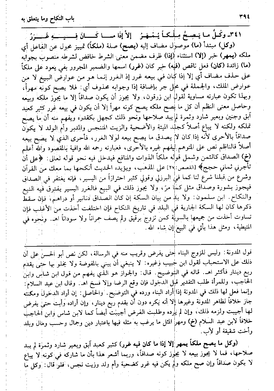 وكُلُّ مَا يَصِحُّ مِلْكاً يُمْهَرُ إلاَّ إذَا مَا كَانَ فِيهِ غَرَرُ (وكل) مُبْتَدأ (مَا) مَوْصُول مُضَاف إِلَيْهِ (يَصح) صلَة (ملكا) تَمْيِيز محول عَن الْفَاعِل أَي ملكه (يمهر) خبر (إِلَّا) اسْتثِْنَاء (إِذا) ظرف مضمن معنى الشَّرْط خافض لشرطه مَنْصُوب بجوابه (مَا) زَائِدَة (كَانَ) فعل نَاقص (فِيهِ) خبر كَانَ (غرر) اسْمهَا وَالضَّمِير الْمَجْرُور بفي يعود على ملكا على حذف مُضَاف أَي إِلَّا إِذا كَانَ فِي بَيْعه غرر إِذْ الْغرَر إِنَّمَا هُوَ من عوارض البيع لَا من عوارض الْملك، وَالْجُمْلَة فِي مَحل جر بِإِضَافَة إِذا وَجَوَابه مَحْذُوف أَي: فَلَا يَصح كَونه مهْرا، وَبِهَذَا تكون عِبَارَته مُسَاوِيَة لقَوْل ابْن زرقون، وَلَا يجوز أَن يكون صَدَاقا إِلَّا مَا يجوز ملكه وَبيعه وَحَاصِل معنى النّظم أَن كل مَا يَصح ملكه يَصح كَونه مهْرا إِلَّا أَن يكون فِي بَيْعه غرر كثير كَعبد آبق وجنين وبعير شارد وَثَمَرَة لم يبد صَلَاحهَا وَنَحْو ذَلِك كجهل بكقدره وَيفهم مِنْهُ أَن مَا يَصح تملكه وَلكنه لَا يُبَاع أصلا كَجلْد الْميتَة وَالْأُضْحِيَّة وَالزَّيْت الْمُتَنَجس وَالْمُدبر وَأم الْوَلَد لَا يكون صَدَاقا بالأحرى لِأَنَّهُ إِذا كَانَ لَا يصدق مَا يَصح بَيْعه لَوْلَا الْغرَر، فأحرى الَّذِي لَا يَصح بَيْعه أصلا فالناظم نَص على المتوهم ليفهم غَيره بالأحرى، فعبارته رَحمَه الله وافية بِالْمَقْصُودِ وَالله أعلم (خَ) الصَدَاق كَالثّمنِ وَشَمل قَوْله ملكا الذوات وَالْمَنَافِع فَيدْخل فِيهِ نَحْو قَوْله تَعَالَى: على أَن تَأْجُرنِي ثَمَانِي حجج} (الْقَصَص: 27) على الْمَذْهَب، وَيُؤَيِّدهُ الحَدِيث أنْكحهَا بِمَا مَعَك من الْقُرْآن وَشرع من قبلنَا شرع لنا كَمَا فِي الْبُرْزُليّ وَقَوْلِي كثير احْتِرَازًا من الْيَسِير، فَإِنَّهُ يغْتَفر فِي الصَدَاق فَيجوز بشورة وصداق مثل كَمَا مرّ، وَلَا يجوز ذَلِك فِي البيع فالغرر الْيَسِير يفْتَرق فِيهِ النيع وَالنِّكَاح. ابْن سَلمُون: وَلَا بُد من بَيَان السِّكَّة إِن كَانَ الصَدَاق دَنَانِير أَو دَرَاهِم، فَإِن سقط ذكرهَا كَانَ لَهَا السِّكَّة الْجَارِيَة فِي الْبَلَد فِي تَارِيخ النِّكَاح فَإِن اخْتلفت أخذت من الْأَغْلَب فَإِن تَسَاوَت أخذت من جَمِيعهَا بِالسَّوِيَّةِ كمن تزوج برقيق وَلم يصف حمراناً وَلَا سوداناً اه. وَنَحْوه فِي الْمُتَيْطِيَّة، وَمثل هَذَا يَأْتِي فِي البيع إِن شَاءَ الله.
