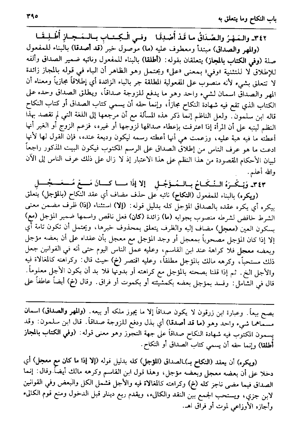 والمَهْرُ والصَّدَاقُ مَا قَدْ أُصْدِقَا وَفِي الْكِتابِ بالمَجازِ أُطْلِقَا (وَالْمهْر وَالصَّدَاق) مُبْتَدأ ومعطوف عَلَيْهِ (مَا) مَوْصُول خبر (قد أصدقا) بِالْبِنَاءِ للْمَفْعُول صلَة (وَفِي الْكتاب بالمجاز) يتعلقان بقوله: (أطلقا) بِالْبِنَاءِ للْمَفْعُول ونائبه ضمير الصَدَاق وألفه للإطلاق لَا للتثنية (وَفِي) بِمَعْنى (على) وَيحْتَمل وَهُوَ الظَّاهِر أَن الْبَاء فِي قَوْله بالمجاز زَائِدَة لَا تتَعَلَّق بِشَيْء لِأَنَّهُ مَنْصُوب على المفعولية الْمُطلقَة جر بِالْبَاء الزَّائِدَة أَي إطلاقاً مجازياً وَمَعْنَاهُ أَن الْمهْر وَالصَّدَاق اسمان لشَيْء وَاحِد وَهُوَ مَا يدْفع للزَّوْجَة صَدَاقا، وَيُطلق الصَدَاق وَحده على الْكتاب الَّذِي تقع فِيهِ شَهَادَة النِّكَاح مجَازًا، وَإِنَّمَا حَقه أَن يُسَمِّي كتاب الصَدَاق أَو كتاب النِّكَاح قَالَه ابْن سَلمُون. وَلَعَلَّ النَّاظِم إِنَّمَا ذكر هَذِه الْمَسْأَلَة مَعَ أَن مرجعها إِلَى اللُّغَة الَّتِي لم تقصد بِهَذَا النّظم لينبه على أَن الْمَرْأَة إِذا اعْترفت بِإِعْطَاء صَدَاقهَا لزَوجهَا أَو غَيره، فَزعم الزَّوْج أَو الْغَيْر أَنَّهَا أَعطَتْهُ مَا فِيهِ هبة عَلَيْهِ وَزَعَمت هِيَ أَنَّهَا أَعطَتْهُ رسمه ليَكُون وَدِيعَة عِنْده، فَإِن القَوْل لَهَا لِأَنَّهَا ادَّعَت مَا هُوَ عرف النَّاس من إِطْلَاق الصَدَاق على الرَّسْم الْمَكْتُوب فَيكون الْبَيْت الْمَذْكُور رَاجعا لبَيَان الْأَحْكَام الْمَقْصُودَة من هَذَا النّظم على هَذَا الِاعْتِبَار إِذْ لَا زَالَ على ذَلِك عرف النَّاس إِلَى الْآن وَالله أعلم. وَيُكْرَهُ النِّكَاحُ بالمُؤَجَّلِ إِلَّا إذَا مَا كانَ مَعْ مُعَجَّلِ (وَيكرهُ) بِالْبِنَاءِ للْمَفْعُول (النِّكَاح) نَائِبه على حذف مُضَاف أَي عقد النِّكَاح (بالمؤجل) يتَعَلَّق بيكره أَي يكره عقده بِالصَّدَاقِ الْمُؤَجل كُله بِدَلِيل قَوْله: (إِلَّا) اسْتثِْنَاء (إِذا) ظرف مضمن معنى الشَّرْط خافض لشرطه مَنْصُوب بجوابه (مَا) زَائِدَة (كَانَ) فعل نَاقص وَاسْمهَا ضمير الْمُؤَجل (مَعَ) بِسُكُون الْعين (معجل) مُضَاف إِلَيْهِ والظرف يتَعَلَّق بِمَحْذُوف خَبَرهَا، وَيحْتَمل أَن تكون تَامَّة أَي إِلَّا إِذا كَانَ الْمُؤَجل مصحوباً بمعجل أَو وجد الْمُؤَجل مَعَ معجل بِأَن عقداه على أَن بعضه مُؤَجل وَبَعضه معجل فَلَا كَرَاهَة عِنْد ابْن الْقَاسِم، وَعَلِيهِ عمل النَّاس الْيَوْم حَتَّى أَنه فِي القوانين جعل ذَلِك مُسْتَحبا، وَكَرِهَهُ مَالك بالمؤجل مُطلقًا، وَعَلِيهِ اقْتصر (خَ) حَيْثُ قَالَ: وكراهته كالمغالاة فِيهِ وَالْأَجَل الخ. ثمَّ إِذا قُلْنَا بِصِحَّتِهِ بالمؤجل مَعَ كَرَاهَته أَو بِدُونِهَا فَلَا بُد أَن يكون الْأَجَل مَعْلُوما. قَالَ فِي الشَّامِل: وَفَسَد بمؤجل بعضه بكمشيئته أَو بكموت أَو فِرَاق. وَقَالَ (خَ) أَيْضا عاطفاً على