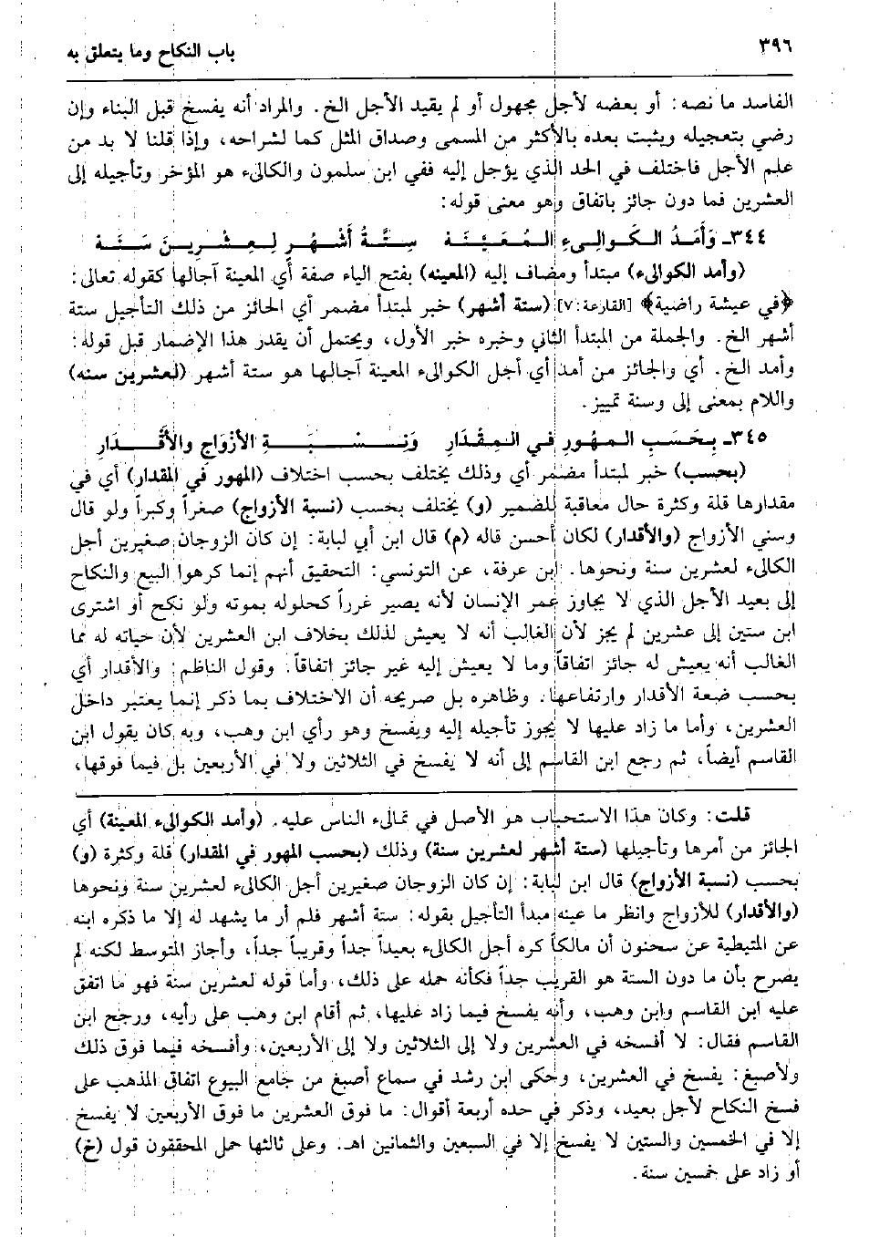 الْفَاسِد مَا نَصه: أَو بعضه لأجل مَجْهُول أَو لم يُقيد الْأَجَل الخ. وَالْمرَاد أَنه يفْسخ قبل الْبناء وَإِن رَضِي بتعجيله وَيثبت بعده بِالْأَكْثَرِ من الْمُسَمّى وصداق الْمثل كَمَا لشراحه، وَإِذا قُلْنَا لَا بُد من علم الْأَجَل فَاخْتلف فِي الْحَد الَّذِي يُؤَجل إِلَيْهِ فَفِي ابْن سَلمُون والكالىء هُوَ الْمُؤخر وتأجيله إِلَى الْعشْرين فَمَا دون جَائِز بِاتِّفَاق وَهُوَ معنى قَوْله: وَأَمَدُ الكَوالِىءِ المُعَيَّنَهْ سِتَّةُ أَشْهُرٍ لِعِشْرِينَ سَنَهْ (وأمد الكوالىء) مُبْتَدأ ومضاف إِلَيْهِ (المعينه) بِفَتْح الْيَاء صفة أَي الْمعينَة آجالها كَقَوْلِه تَعَالَى: فِي عيشة راضية} (القارعة: 7) (سِتَّة أشهر) خبر لمبتدأ مُضْمر أَي الْحَائِز من ذَلِك التَّأْجِيل سِتَّة أشهر الخ. وَالْجُمْلَة من الْمُبْتَدَأ الثَّانِي وَخَبره خبر الأول، وَيحْتَمل أَن يقدر هَذَا الْإِضْمَار قبل قَوْله: وأمد الخ. أَي والجائز من أمد أَي أجل الكوالىء الْمعينَة آجالها هُوَ سِتَّة أشهر (لعشرين سنه) وَاللَّام بِمَعْنى إِلَى وَسنة تَمْيِيز. بِحَسَبِ المهُورِ فِي المِقْدَارِ وَنِسْبَةِ الأزْوَاجِ والأَقْدَارِ (بِحَسب) خبر لمبتدأ مُضْمر أَي وَذَلِكَ يخْتَلف بِحَسب اخْتِلَاف (المهور فِي الْمِقْدَار) أَي فِي مقدارها قلَّة وَكَثْرَة حَال معاقبة للضمير (و) يخْتَلف بِحَسب (نِسْبَة الْأزْوَاج) صغراً وكبراً وَلَو قَالَ وسني الْأزْوَاج (والأقدار) لَكَانَ أحسن قَالَه (م) قَالَ ابْن أبي لبَابَة: إِن كَانَ الزَّوْجَانِ صغيرين أجل الكالىء لعشرين سنة وَنَحْوهَا. ابْن عَرَفَة، عَن التّونسِيّ: التَّحْقِيق أَنهم إِنَّمَا كَرهُوا البيع وَالنِّكَاح إِلَى بعيد الْأَجَل الَّذِي لَا يُجَاوز عمر الْإِنْسَان لِأَنَّهُ يصير غرراً كحلوله بِمَوْتِهِ وَلَو نكح أَو اشْترى ابْن سِتِّينَ إِلَى عشْرين لم يجز لِأَن الْغَالِب أَنه لَا يعِيش لذَلِك بِخِلَاف ابْن الْعشْرين لِأَن حَيَاته لَهُ مِمَّا الْغَالِب أَنه يعِيش لَهُ جَائِز اتِّفَاقًا وَمَا لَا يعِيش إِلَيْهِ غير جَائِز اتِّفَاقًا. وَقَول النَّاظِم: والأقدار أَي بِحَسب ضعة الأقدار وارتفاعها. وَظَاهره بل صَرِيحه أَن الِاخْتِلَاف بِمَا ذكر إِنَّمَا يعْتَبر دَاخل الْعشْرين، وَأما مَا زَاد عَلَيْهَا لَا يجوز تَأْجِيله إِلَيْهِ وَيفْسخ وَهُوَ رَأْي ابْن وهب، وَبِه كَانَ يَقُول ابْن الْقَاسِم أَيْضا، ثمَّ رَجَعَ ابْن الْقَاسِم إِلَى أَنه لَا يفْسخ فِي الثَّلَاثِينَ وَلَا فِي الْأَرْبَعين بل فِيمَا فَوْقهَا،