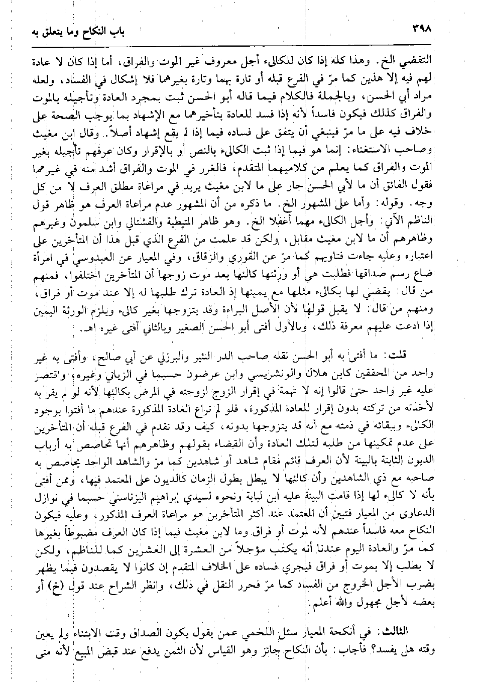 التقضي الخ. وَهَذَا كُله إِذا كَانَ للكالىء أجل مَعْرُوف غير الْمَوْت والفراق، أما إِذا كَانَ لَا عَادَة لَهُم فِيهِ إِلَّا هذَيْن كَمَا مرّ فِي الْفَرْع قبله أَو تَارَة بهما وَتارَة بِغَيْرِهِمَا فَلَا إِشْكَال فِي الْفساد، وَلَعَلَّه مُرَاد أبي الْحسن، وَبِالْجُمْلَةِ فَالْكَلَام فِيمَا قَالَه أَبُو الْحسن ثَبت بِمُجَرَّد الْعَادة وتأجيله بِالْمَوْتِ والفراق كَذَلِك فَيكون فَاسِدا لِأَنَّهُ إِذا فسد للْعَادَة بتأخيرهما مَعَ الْإِشْهَاد بِمَا يُوجب الصِّحَّة على خلاف فِيهِ على مَا مرّ فَيَنْبَغِي أَن يتَّفق على فَسَاده فِيمَا إِذا لم يَقع إِشْهَاد أصلا. وَقَالَ ابْن مغيث وَصَاحب الِاسْتِغْنَاء: إِنَّمَا هُوَ فِيمَا إِذا ثَبت الكالىء بِالنَّصِّ أَو بِالْإِقْرَارِ وَكَانَ عرفهم تَأْجِيله بِغَيْر الْمَوْت والفراق كَمَا يعلم من كلاميهما الْمُتَقَدّم فالغرر فِي الْمَوْت والفراق أَشد مِنْهُ فِي غَيرهمَا فَقَوْل الْفَائِق أَن مَا لأبي الْحسن جَار على مَا لِابْنِ مغيث يُرِيد فِي مُرَاعَاة مُطلق الْعرف لَا من كل وَجه. وَقَوله: وَأما على الْمَشْهُور الخ. مَا ذكره من أَن الْمَشْهُور عدم مُرَاعَاة الْعرف هُوَ ظَاهر قَول النَّاظِم الْآتِي: وَأجل الكالىء مهما أغفلا الخ. وَهُوَ ظَاهر الْمُتَيْطِيَّة والفشتالي وَابْن سَلمُون وَغَيرهم وظاهرهم أَن مَا لِابْنِ مغيث مُقَابل، وَلَكِن قد علمت من الْفَرْع الَّذِي قبل هَذَا أَن الْمُتَأَخِّرين على اعْتِبَاره وَعَلِيهِ جَاءَت فتاويهم كَمَا مرّ عَن القوري والزقاق، وَفِي المعيار عَن العبدوسي فِي امْرَأَة ضَاعَ رسم صَدَاقهَا فطلبت هِيَ أَو ورثتها كالئها بعد موت زَوجهَا أَن الْمُتَأَخِّرين اخْتلفُوا، فَمنهمْ من قَالَ: يقْضِي لَهَا بكالىء مثلهَا مَعَ يَمِينهَا إِذْ الْعَادة ترك طلبَهَا لَهُ إِلَّا عِنْد موت أَو فِرَاق، وَمِنْهُم من قَالَ: لَا يقبل قَوْلهَا لِأَن الأَصْل الْبَرَاءَة وَقد يَتَزَوَّجهَا بِغَيْر كالىء وَيلْزم الْوَرَثَة الْيَمين إِذا ادَّعَت عَلَيْهِم معرفَة ذَلِك، وبالأول أفتى أَبُو الْحسن الصَّغِير وَبِالثَّانِي أفتى غَيره اه. قلت: مَا أفتى بِهِ أَبُو الْحسن نَقله صَاحب الدّرّ النثير والبرزلي عَن أبي صَالح، وَأفْتى بِهِ غير وَاحِد من الْمُحَقِّقين كَابْن هِلَال والونشريسي وَابْن عرضون حَسْبَمَا فِي الزياتي وَغَيره، وَاقْتصر عَلَيْهِ غير وَاحِد حَتَّى قَالُوا إِنَّه لَا تُهْمَة فِي إِقْرَار الزَّوْج لزوجته فِي الْمَرَض بكالئها لِأَنَّهُ لَو لم يقر بِهِ لَأَخَذته من تركته بِدُونِ إِقْرَار للْعَادَة الْمَذْكُورَة، فَلَو لم تراع الْعَادة الْمَذْكُورَة عِنْدهم مَا أفتوا بِوُجُود الكالىء وببقائه فِي ذمَّته مَعَ أَنه قد يَتَزَوَّجهَا بِدُونِهِ، كَيفَ وَقد تقدم فِي الْفَرْع قبله أَن الْمُتَأَخِّرين على عدم تمكينها من طلبه لتِلْك الْعَادة وَأَن الْقَضَاء بقَوْلهمْ وظاهرهم أَنَّهَا تحاصص بِهِ أَرْبَاب الدُّيُون الثَّابِتَة بِالْبَيِّنَةِ لِأَن الْعرف قَائِم مقَام شَاهد أَو شَاهِدين كَمَا مرّ وَالشَّاهِد الْوَاحِد يحاصص بِهِ صَاحبه مَعَ ذِي الشَّاهِدين وَأَن كالئها لَا يبطل بطول الزَّمَان كالديون على الْمُعْتَمد فِيهَا، وَمِمَّنْ أفتى بِأَنَّهُ لَا كالىء لَهَا إِذا قَامَت الْبَيِّنَة عَلَيْهِ ابْن لبَابَة وَنَحْوه لسيدي إِبْرَاهِيم اليزناسني حَسْبَمَا فِي نَوَازِل الدَّعَاوَى من المعيار فَتبين أَن الْمُعْتَمد عِنْد أَكثر الْمُتَأَخِّرين هُوَ مُرَاعَاة الْعرف الْمَذْكُور، وَعَلِيهِ فَيكون النِّكَاح مَعَه فَاسِدا عِنْدهم لِأَنَّهُ لمَوْت أَو فِرَاق وَمَا لِابْنِ مغيث فِيمَا إِذا كَانَ الْعرف مضبوطاً بغَيْرهَا كَمَا مرّ وَالْعَادَة الْيَوْم عندنَا أَنه يكْتب مُؤَجّلا من الْعشْرَة إِلَى الْعشْرين كَمَا للناظم، وَلَكِن لَا يطْلب إِلَّا بِمَوْت أَو فِرَاق ف