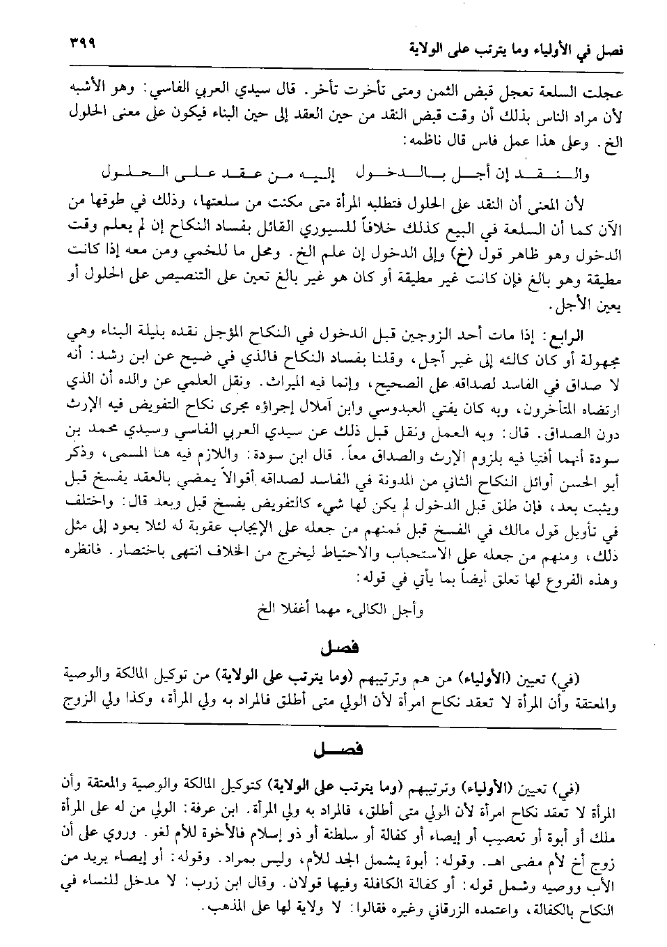 عجلت السّلْعَة تعجل قبض الثّمن وَمَتى تَأَخَّرت تَأَخّر. قَالَ سَيِّدي الْعَرَبِيّ الفاسي: وَهُوَ الْأَشْبَه لِأَن مُرَاد النَّاس بذلك أَن وَقت قبض النَّقْد من حِين العقد إِلَى حِين الْبناء فَيكون على معنى الْحُلُول الخ. وعَلى هَذَا عمل فاس قَالَ ناظمه: والنقد إِن أجل بِالدُّخُولِ إِلَيْهِ من عقد على الْحُلُول لِأَن الْمَعْنى أَن النَّقْد على الْحُلُول فتطلبه الْمَرْأَة مَتى مكنت من سلعتها، وَذَلِكَ فِي طوقها من الْآن كَمَا أَن السّلْعَة فِي البيع كَذَلِك خلافًا للسيوري الْقَائِل بِفساد النِّكَاح إِن لم يعلم وَقت الدُّخُول وَهُوَ ظَاهر قَول (خَ) وَإِلَى الدُّخُول إِن علم الخ. وَمحل مَا للخمي وَمن مَعَه إِذا كَانَت مطيقة وَهُوَ بَالغ فَإِن كَانَت غير مطيقة أَو كَانَ هُوَ غير بَالغ تعين على التَّنْصِيص على الْحُلُول أَو يعين الْأَجَل. الرَّابِع: إِذا مَاتَ أحد الزَّوْجَيْنِ قبل الدُّخُول فِي النِّكَاح الْمُؤَجل نَقده بليلة الْبناء وَهِي مَجْهُولَة أَو كَانَ كالئه إِلَى غير أجل، وَقُلْنَا بِفساد النِّكَاح فَالَّذِي فِي ضيح عَن ابْن رشد: أَنه لَا صدَاق فِي الْفَاسِد لصداقه على الصَّحِيح، وَإِنَّمَا فِيهِ الْمِيرَاث. وَنقل العلمي عَن وَالِده أَن الَّذِي ارْتَضَاهُ الْمُتَأَخّرُونَ، وَبِه كَانَ يُفْتِي العبدوسي وَابْن آملال إجراؤه مجْرى نِكَاح التَّفْوِيض فِيهِ الْإِرْث دون الصَدَاق. قَالَ: وَبِه الْعَمَل وَنقل قبل ذَلِك عَن سَيِّدي الْعَرَبِيّ الفاسي وسيدي مُحَمَّد بن سَوْدَة أَنَّهُمَا أفتيا فِيهِ بِلُزُوم الْإِرْث وَالصَّدَاق مَعًا. قَالَ ابْن سَوْدَة: وَاللَّازِم فِيهِ هُنَا الْمُسَمّى، وَذكر أَبُو الْحسن أَوَائِل النِّكَاح الثَّانِي من الْمُدَوَّنَة فِي الْفَاسِد لصداقه أقوالاً يمْضِي بِالْعقدِ يفْسخ قبل وَيثبت بعد، فَإِن طلق قبل الدُّخُول لم يكن لَهَا شَيْء كالتفويض يفْسخ قبل وَبعد قَالَ: وَاخْتلف فِي تَأْوِيل قَول مَالك فِي الْفَسْخ قبل فَمنهمْ من جعله على الْإِيجَاب عُقُوبَة لَهُ لِئَلَّا يعود إِلَى مثل ذَلِك، وَمِنْهُم من جعله على الِاسْتِحْبَاب وَالِاحْتِيَاط ليخرج من الْخلاف انْتهى بِاخْتِصَار. فَانْظُرْهُ وَهَذِه الْفُرُوع لَهَا تعلق أَيْضا بِمَا يَأْتِي فِي قَوْله: وَأجل الكالىء مهما أغفلا الخ