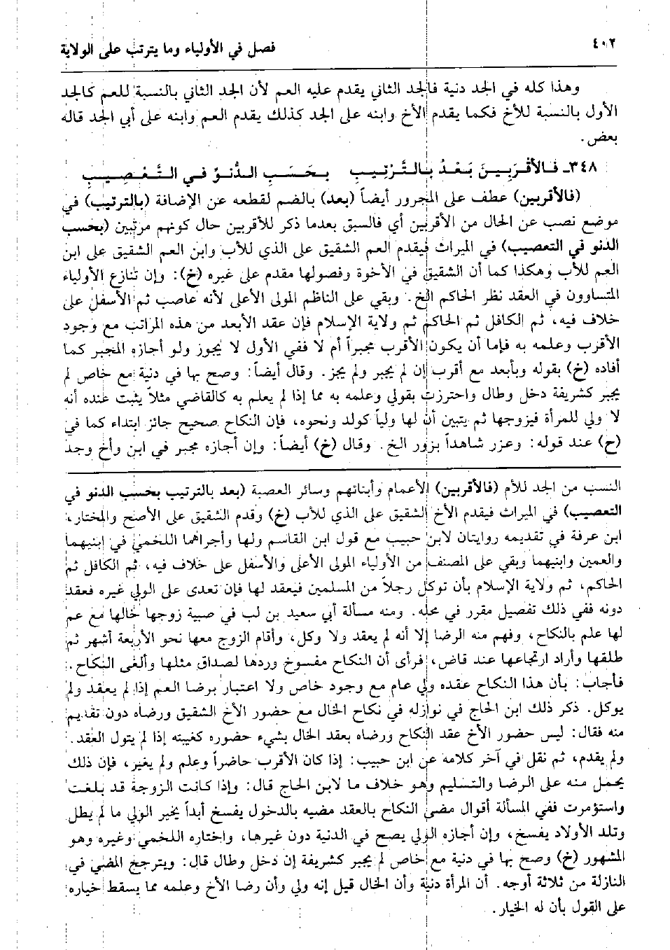 وَهَذَا كُله فِي الْجد دنية فالجد الثَّانِي يقدم عَلَيْهِ الْعم لِأَن الْجد الثَّانِي بِالنِّسْبَةِ للعم كالجد الأول بِالنِّسْبَةِ للْأَخ فَكَمَا يقدم الْأَخ وَابْنه على الْجد كَذَلِك يقدم الْعم وَابْنه على أبي الْجد قَالَه بعض. فالأقْرَبِينَ بَعْدُ بالتَّرْتِيبِ بحَسَبِ الدُّنوِّ فِي التَّعْصِيبِ (فالأقربين) عطف على الْمَجْرُور أَيْضا (بعد) بِالضَّمِّ لقطعه عَن الْإِضَافَة (بالترتيب) فِي مَوضِع نصب عَن الْحَال من الْأَقْرَبين أَي فالسبق بَعْدَمَا ذكر للأقربين حَال كَونهم مرتبين (بِحَسب الدنو فِي التَّعْصِيب) فِي الْمِيرَاث فَيقدم الْعم الشَّقِيق على الَّذِي للْأَب وَابْن الْعم الشَّقِيق على ابْن الْعم للْأَب وَهَكَذَا كَمَا أَن الشَّقِيق فِي الْأُخوة وفصولها مقدم على غَيره (خَ) : وَإِن تنَازع الْأَوْلِيَاء المتساوون فِي العقد نظر الْحَاكِم الخ. وَبَقِي على النَّاظِم الْمولى الْأَعْلَى لِأَنَّهُ عاصب ثمَّ الْأَسْفَل على خلاف فِيهِ، ثمَّ الكافل ثمَّ الْحَاكِم ثمَّ ولَايَة الْإِسْلَام فَإِن عقد الْأَبْعَد من هَذِه الْمَرَاتِب مَعَ وجود الْأَقْرَب وَعلمه بِهِ فإمَّا أَن يكون الْأَقْرَب مجبراً أم لَا فَفِي الأول لَا يجوز وَلَو أجَازه الْمُجبر كَمَا أَفَادَهُ (خَ) بقوله وبأبعد مَعَ أقرب إِن لم يجْبر وَلم يجز. وَقَالَ أَيْضا: وَصَحَّ بهَا فِي دنية مَعَ خَاص لم يجْبر كشريفة دخل وَطَالَ واحترزت بِقَوْلِي وَعلمه بِهِ مِمَّا إِذا لم يعلم بِهِ كَالْقَاضِي مثلا يثبت عِنْده أَنه لَا ولي للْمَرْأَة فيزوجها ثمَّ يتَبَيَّن أَن لَهَا وليا كَوَلَد وَنَحْوه، فَإِن النِّكَاح صَحِيح جَائِز ابْتِدَاء كَمَا فِي (ح) عِنْد قَوْله: وعزر شَاهدا بزور الخ. وَقَالَ (خَ) أَيْضا: وَإِن أجَازه مجبر فِي ابْن وَأَخ وجد