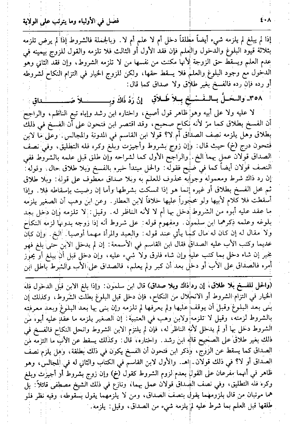 إِذا لم يبلغ لم يلْزمه شَيْء أَيْضا مُطلقًا دخل أم لَا علم أم لَا. وَبِالْجُمْلَةِ فالشروط إِذا لم يرض تلْزمهُ بِثَلَاثَة قيود الْبلُوغ وَالدُّخُول وَالْعلم فَإِن فقد الأول أَو الثَّالِث فَلَا تلْزمهُ وَالْقَوْل للزَّوْج بِيَمِينِهِ فِي عدم الْعلم وَيسْقط حق الزَّوْجَة لِأَنَّهَا مكنت من نَفسهَا من لَا تلْزمهُ الشُّرُوط، وَإِن فقد الثَّانِي وَهُوَ الدُّخُول مَعَ وجود الْبلُوغ وَالْعلم فَلَا يسْقط حَقّهَا، وَلَكِن للزَّوْج الْخِيَار فِي الْتِزَام النِّكَاح لشروطه أَو رده فَإِن رده فالفسخ بِغَيْر طَلَاق وَلَا صدَاق كَمَا قَالَ: والحَلُّ بالفَسْخِ بِلاَ طَلاَقِ إنْ رَدَّ ذَاكَ وبِلاَ صَداقِ لَا عَلَيْهِ وَلَا على أَبِيه وَهُوَ ظَاهر قَول أصبغ، وَاخْتَارَهُ ابْن رشد وإياه تبع النَّاظِم، وَالرَّاجِح أَن الْفَسْخ بِطَلَاق كَمَا مرّ لِأَنَّهُ نِكَاح صَحِيح، وَقد اقْتصر ابْن فتحون على أَن الْفَسْخ فِي ذَلِك بِطَلَاق وَهل يلْزمه نصف الصَدَاق أم لَا؟ قولا ابْن الْقَاسِم فِي الْمُدَوَّنَة والمجالس. وعَلى مَا لِابْنِ فتحون درج (خَ) حَيْثُ قَالَ: وَإِن زوج بِشُرُوط وأجيزت وَبلغ وَكره فَلهُ التَّطْلِيق، وَفِي نصف الصَدَاق قَولَانِ عمل بهما الخ. وَالرَّاجِح الأول كَمَا لشراحه وَإِن طلق قبل علمه بِالشُّرُوطِ فَفِي النّصْف قَولَانِ أَيْضا كَمَا فِي ضيح فَقَوله: والحل مُبْتَدأ خَبره بِالْفَسْخِ وَبلا طَلَاق حَال. وَقَوله: إِن رد ذَاك شَرط ومعموله وَجَوَابه مَحْذُوف للْعلم بِهِ وَبلا صدَاق مَعْطُوف على قَوْله: وَبلا طَلَاق ثمَّ مَحل الْفَسْخ بِطَلَاق أَو غَيره إِنَّمَا هُوَ إِذا تمسكت بشرطها وَأما إِن رضيت بإسقاطه فَلَا. وَإِذا أسقطت فَلَا كَلَام لأَبِيهَا وَلَو مَحْجُورا عَلَيْهَا خلافًا لِابْنِ الْعَطَّار. وَعَن ابْن وهب أَن الصَّغِير يلْزمه مَا عقد عَلَيْهِ أَبوهُ من الشُّرُوط دخل بهَا أم لَا لِأَنَّهُ النَّاظر لَهُ. وَقيل: لَا تلْزمهُ وَإِن دخل بعد بُلُوغه وَعلمه ذكرهمَا ابْن سَلمُون. وَمَفْهُوم قَوْله: على شُرُوط أَنه إِذا زوجه بِدُونِهَا لزمَه النِّكَاح وَلَا مقَال لَهُ إِن كَانَ لَهُ مَال كَمَا يَأْتِي عِنْد قَوْله: وَالْعَبْد وَالْمَرْأَة مهما أوصيا. الخ. وَإِن كَانَ عديما وَكتب الْأَب عَلَيْهِ الصَدَاق فَقَالَ ابْن الْقَاسِم فِي الأسمعة: إِن لم يدْخل الابْن حَتَّى بلغ فَهُوَ مُخَيّر إِن شَاءَ دخل بِمَا كتب عَلَيْهِ وَإِن شَاءَ فَارق وَلَا شَيْء عَلَيْهِ، وَإِن دخل قبل أَن يبلغ أَو يحوز أمره فالصداق على الْأَب أَو دخل بعد أَن كبر وَلم يعلم، فالصداق على الْأَب وَالشّرط بَاطِل ابْن